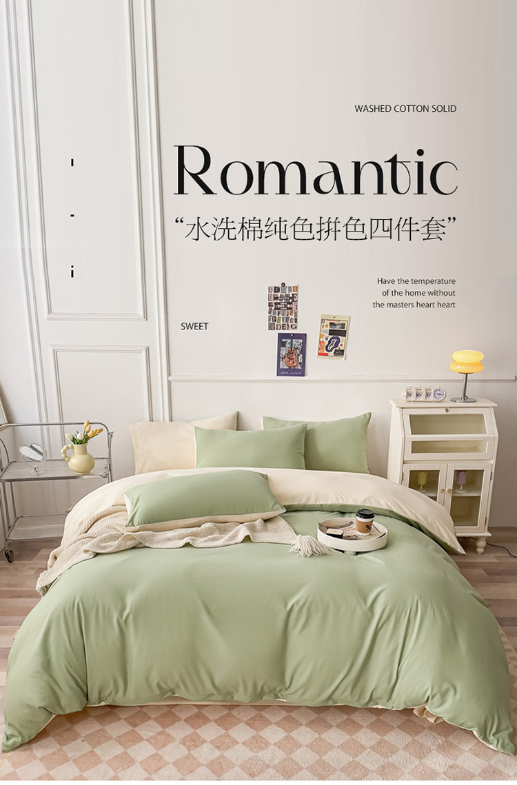 棠颂 2023新款母婴级水洗棉纯色双拼四件套 浅绿+浅黄