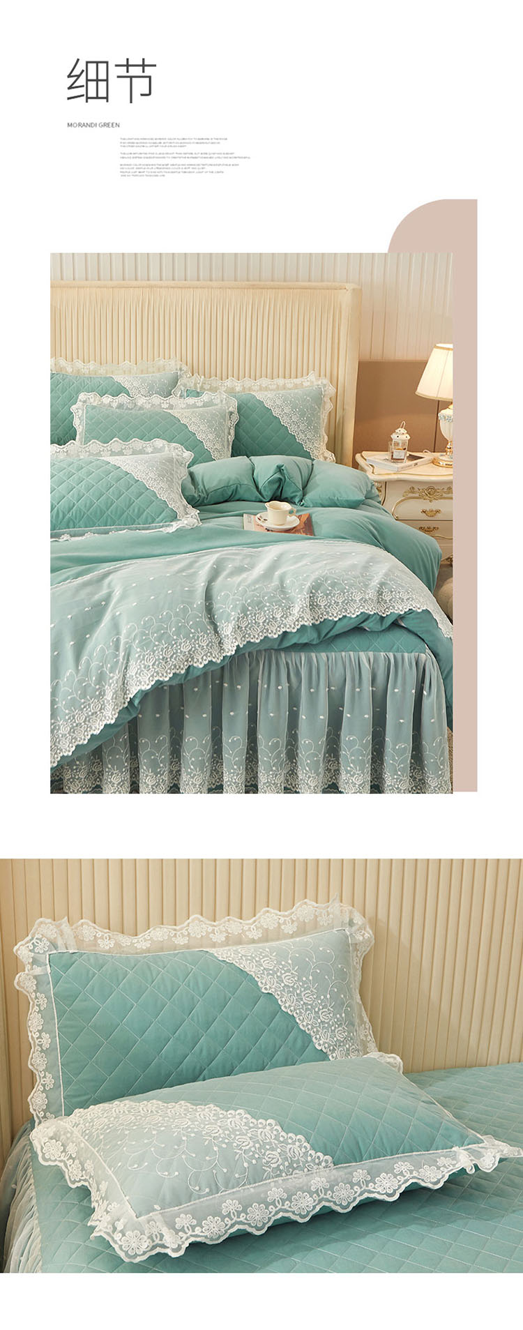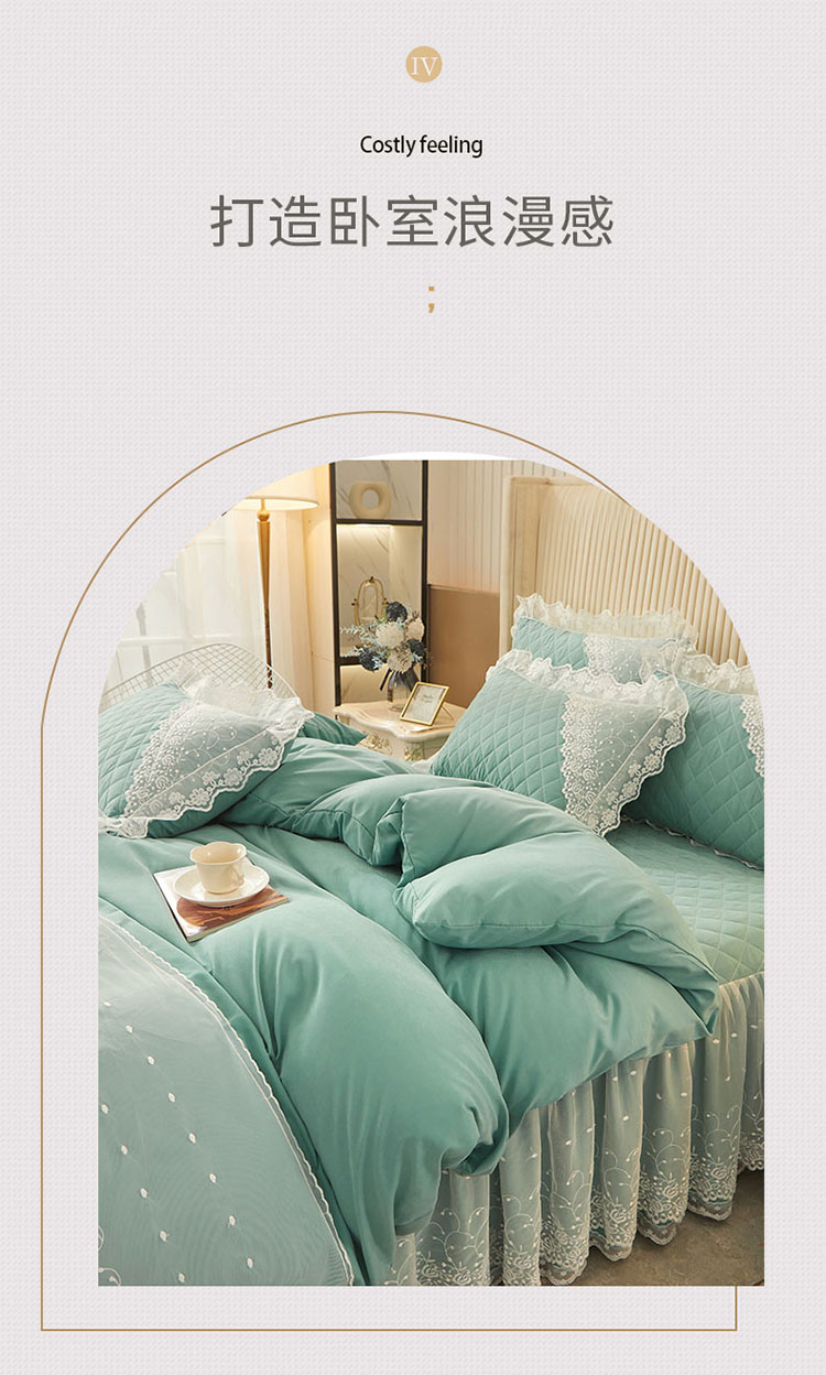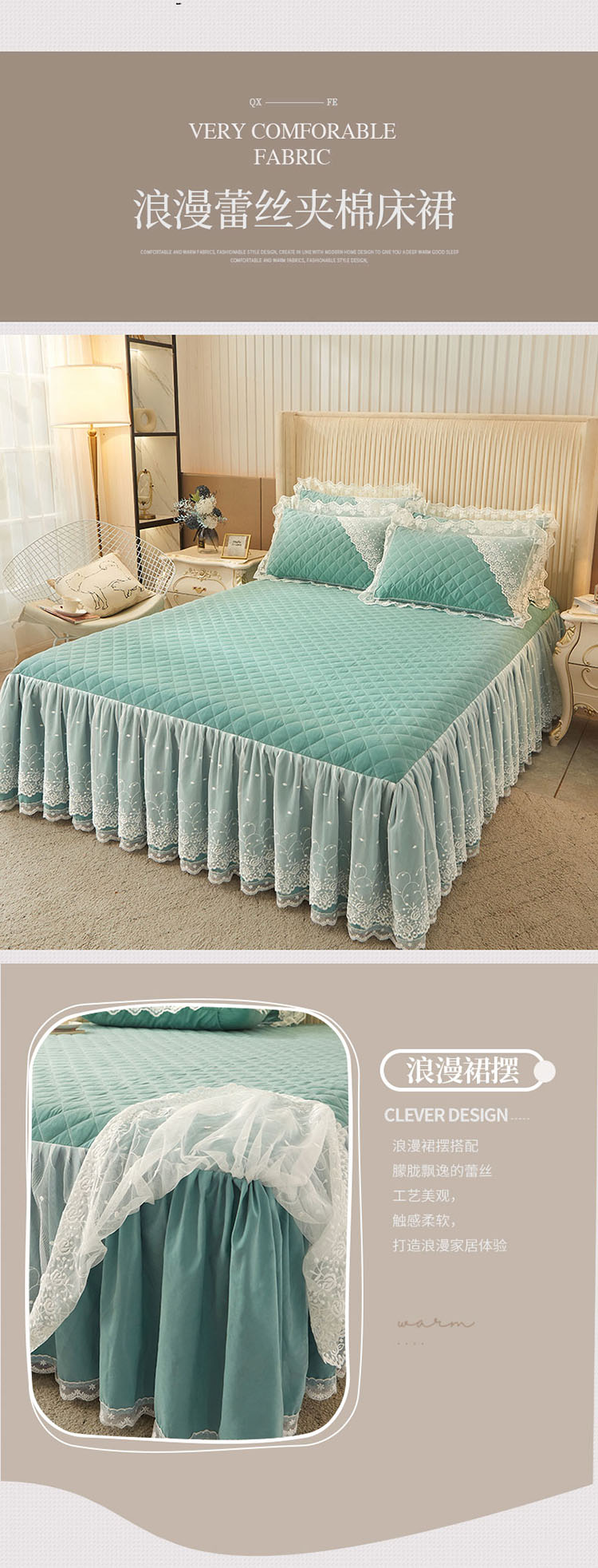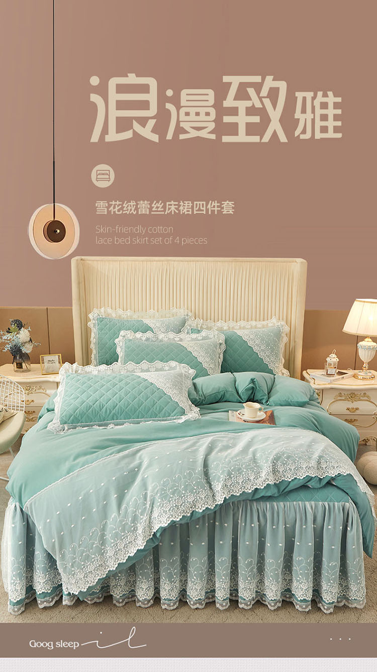 当前位置: 91家纺网 > 商品网购 > 床品套件 > 四件套 > 磨绒四件套 > 恋尚 2023新款纯色雪花绒夹棉蕾丝床裙四件套(四季款) 玫瑰公主-青绿