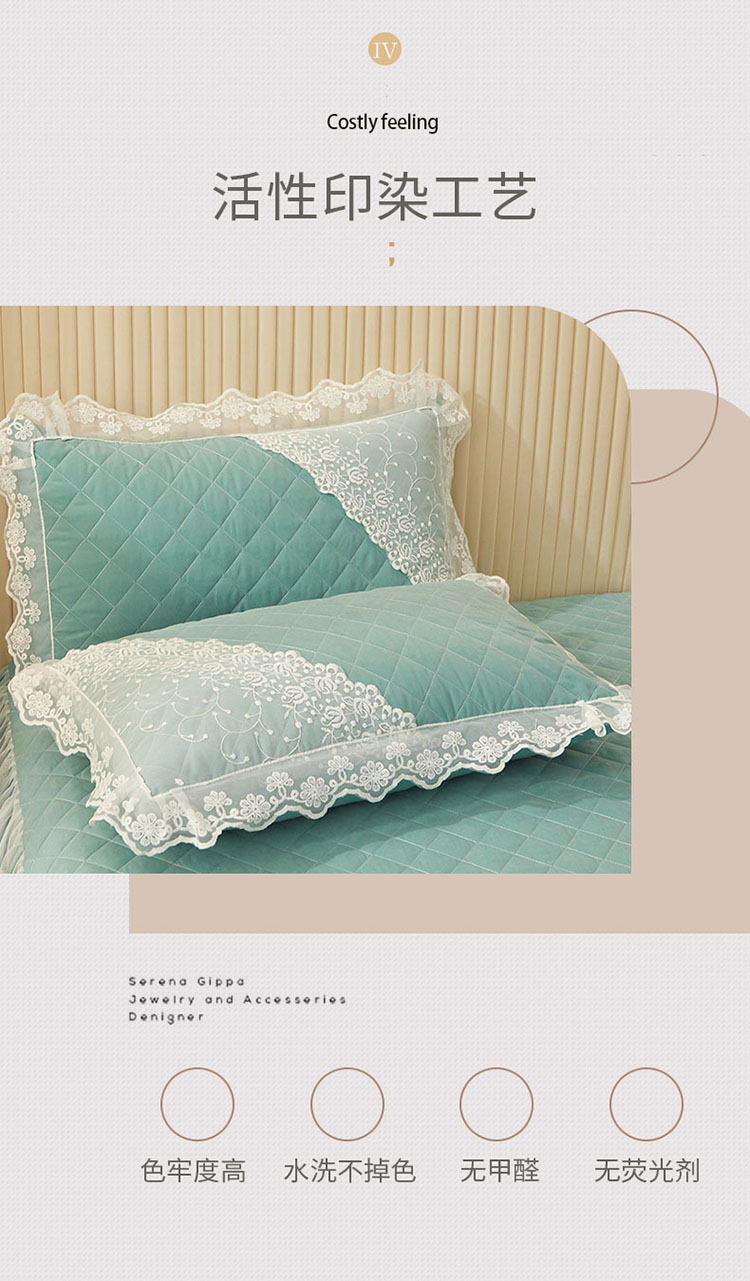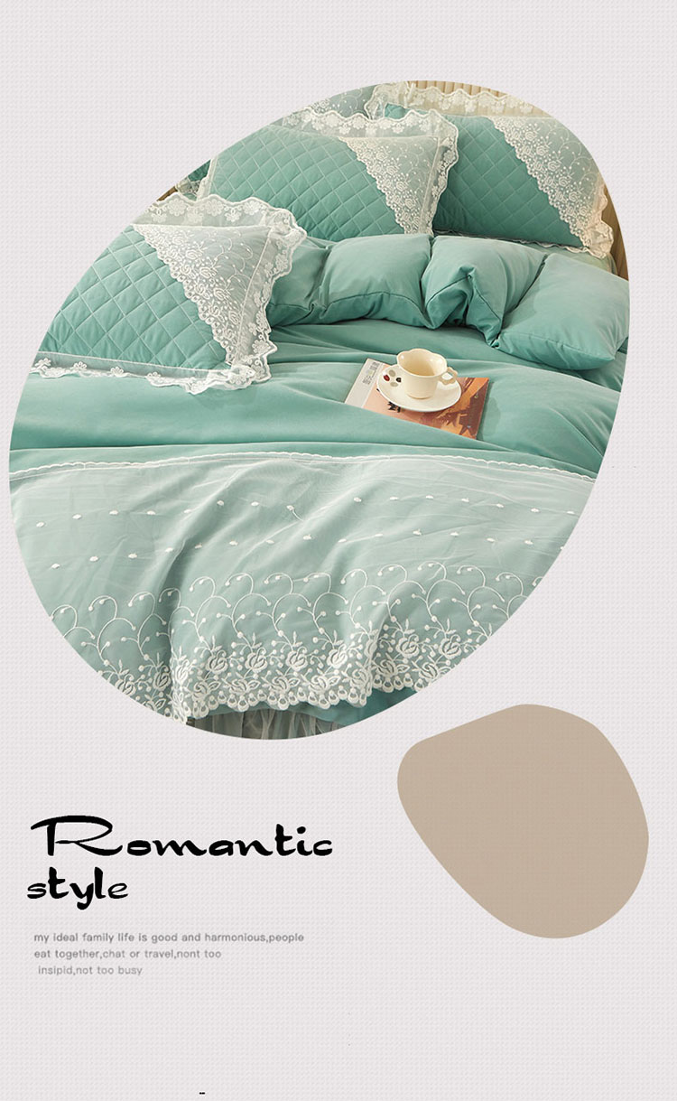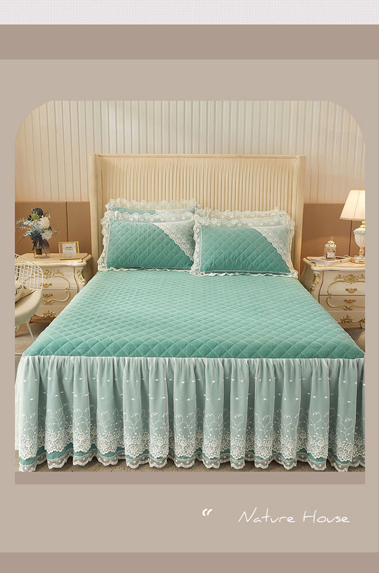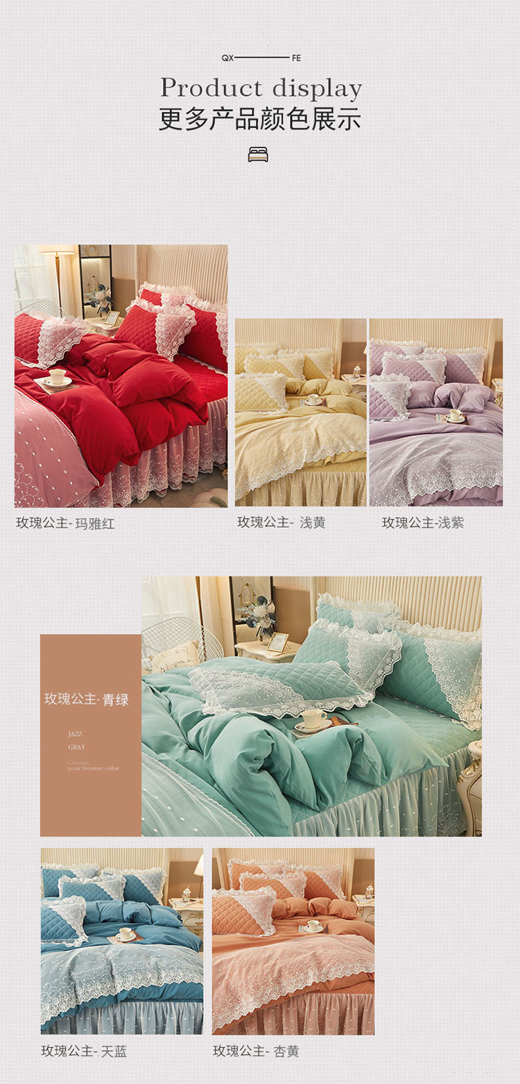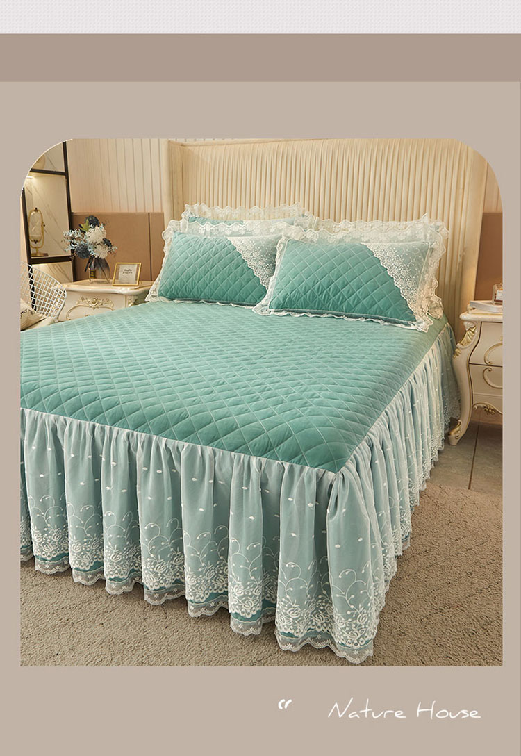 当前位置: 91家纺网 > 商品网购 > 床品套件 > 四件套 > 磨绒四件套 > 恋尚 2023新款纯色雪花绒夹棉蕾丝床裙四件套(四季款) 玫瑰公主-青绿