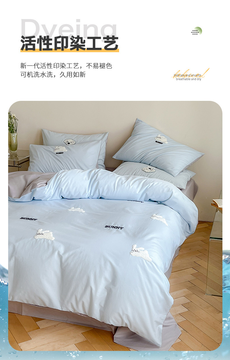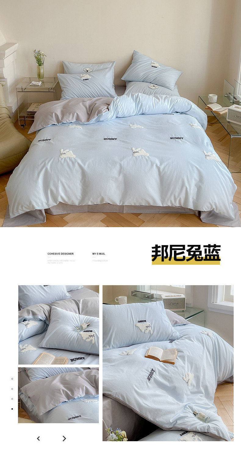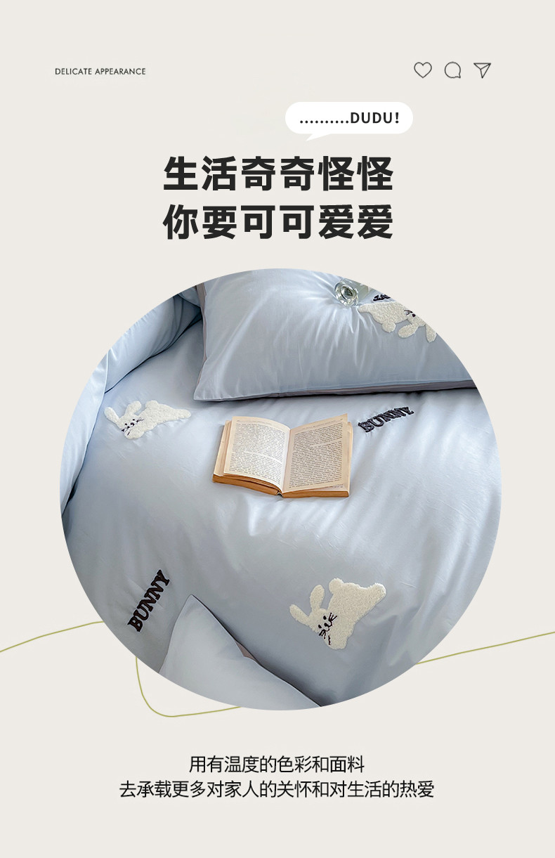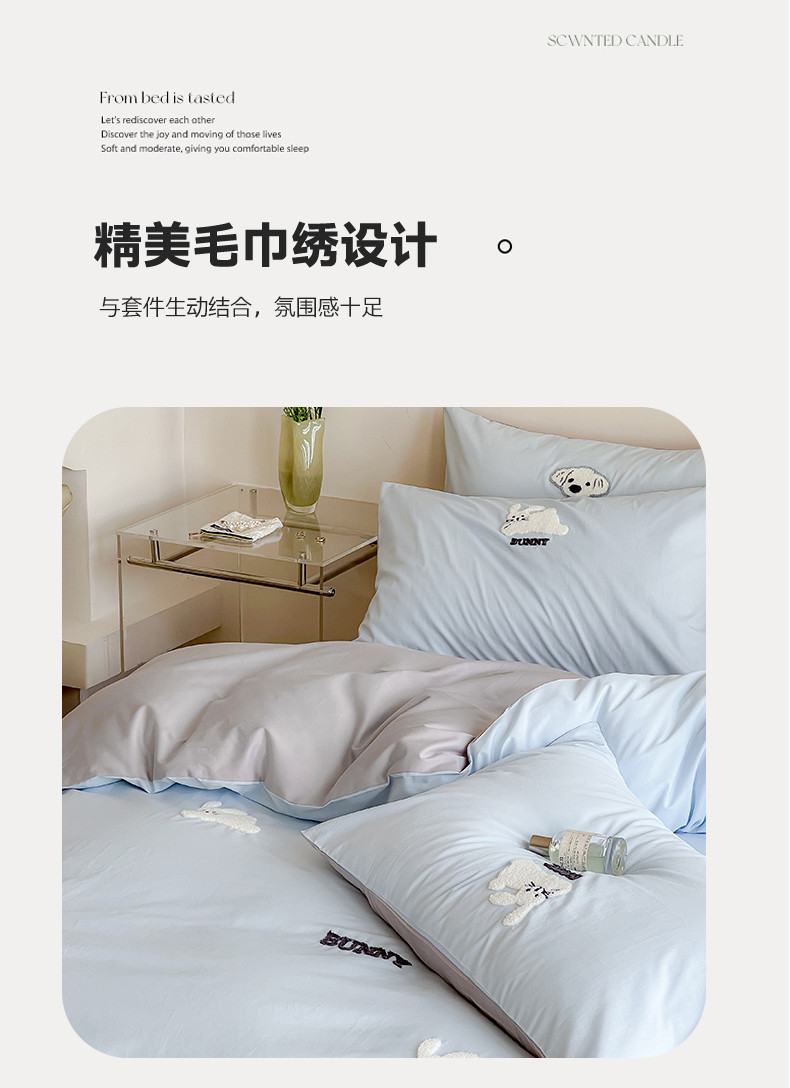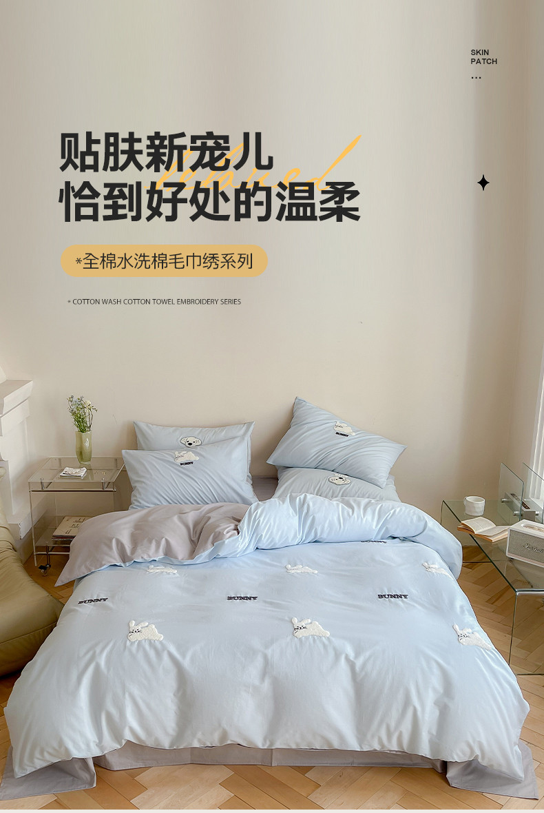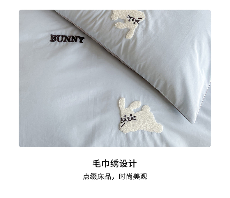 当前位置: 91家纺网 > 商品网购 > 床品套件 > 四件套 > 全棉普通四件套 > 时年 全棉水洗棉毛巾绣系列 40水洗-邦尼兔蓝