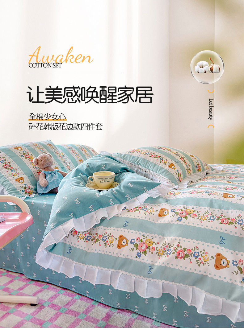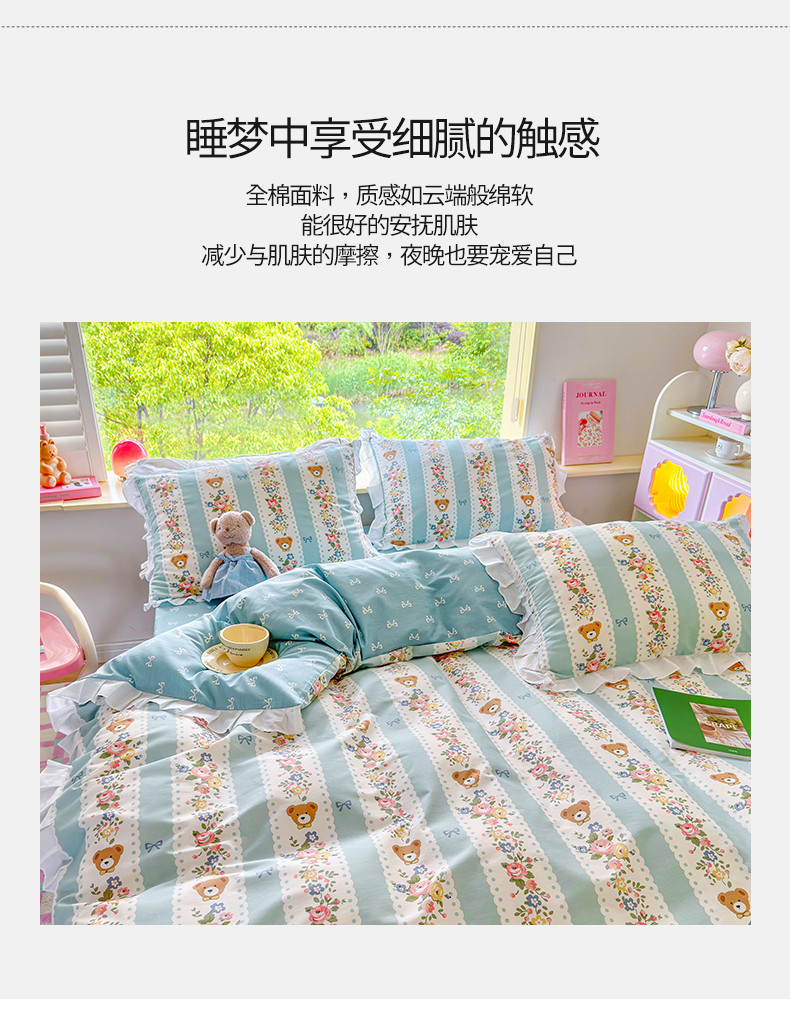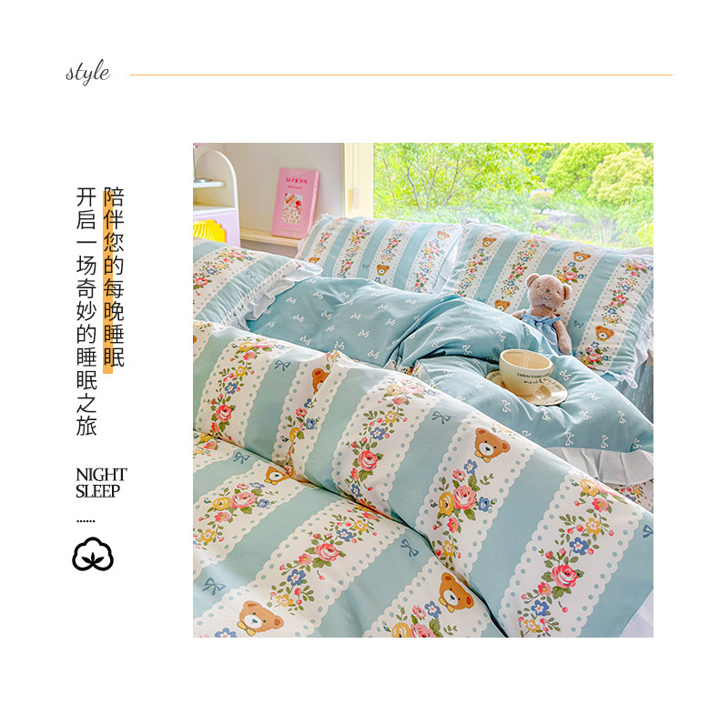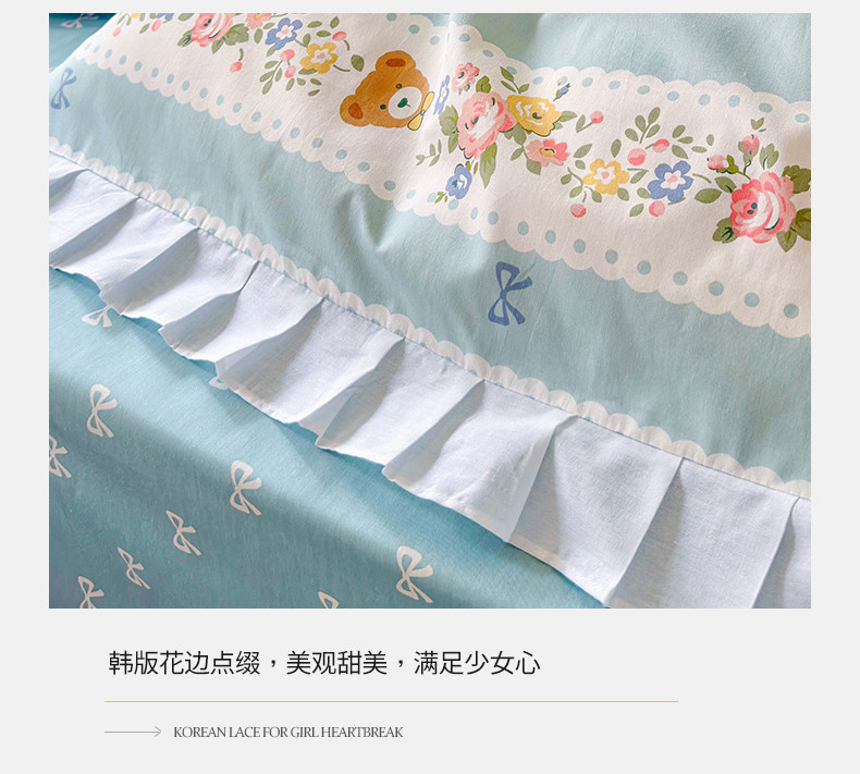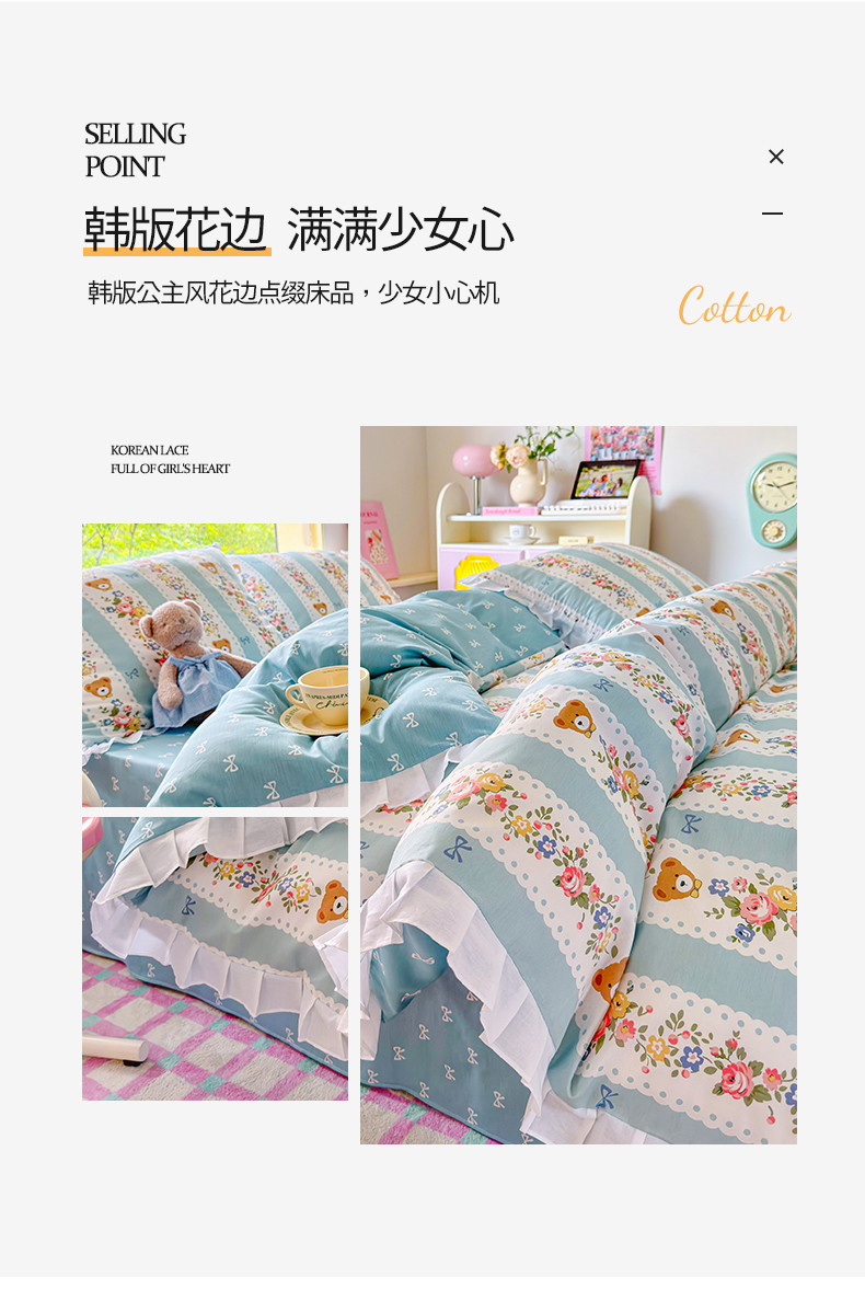 商品名称:桃子 2023新款仙气奶油碎花少女心韩版花边纯棉四件套 花边-蓝色思念