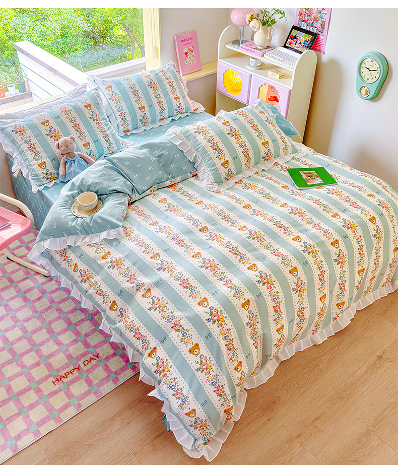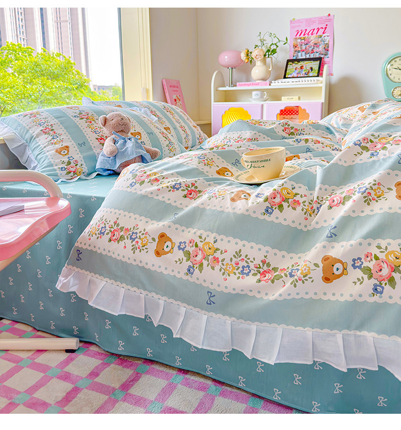 桃子 2023新款仙气奶油碎花少女心韩版花边纯棉四件套 花边-蓝色思念
