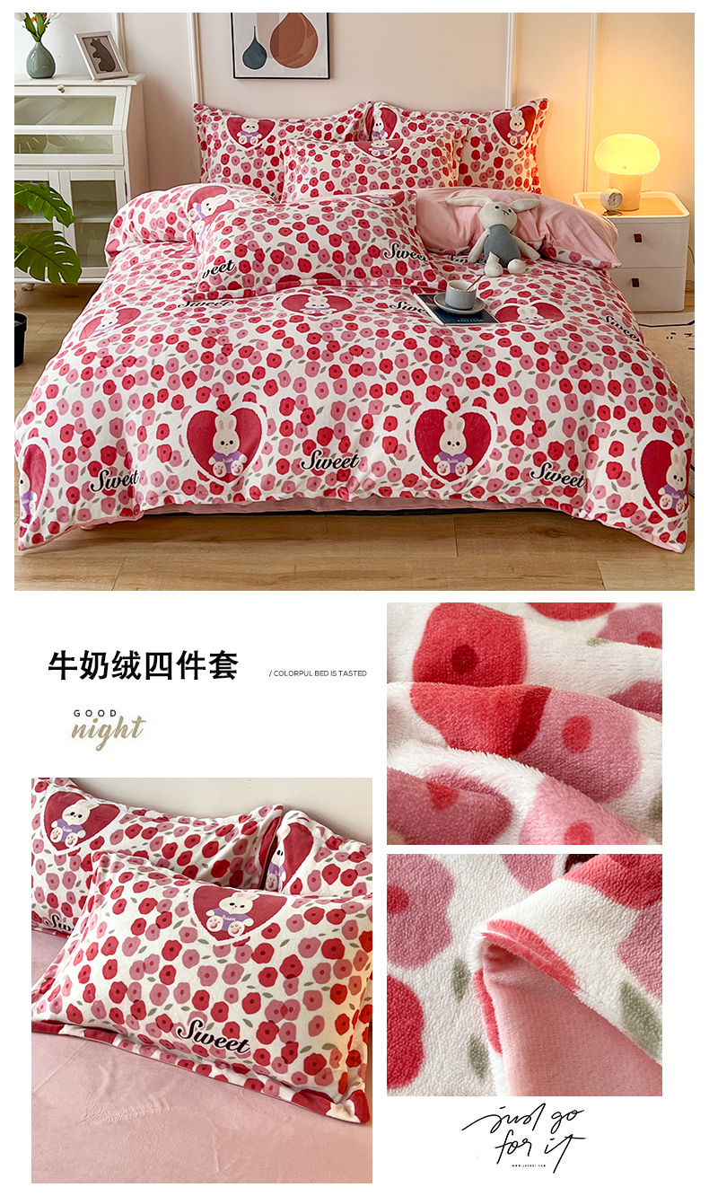 富之航家纺 2023新款牛奶绒印花四件套 爱心小兔