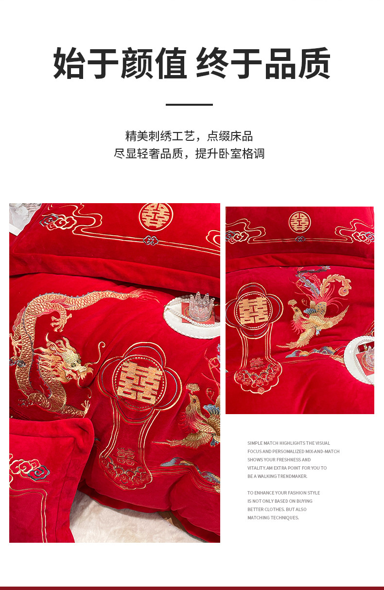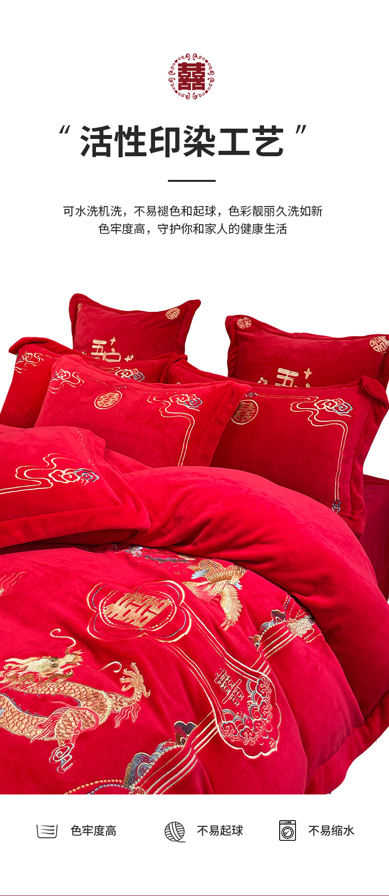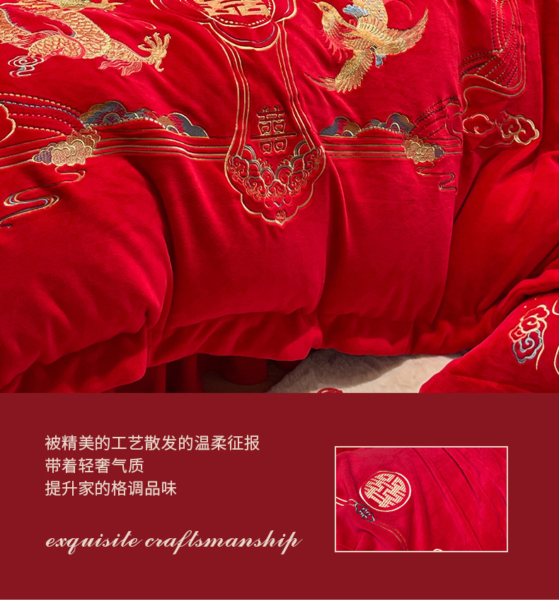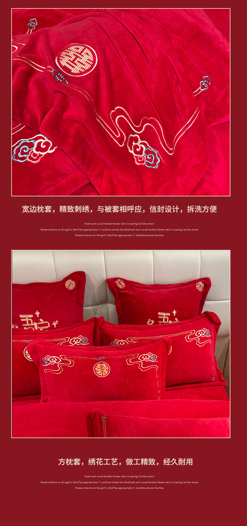 商品名称:(总)2025新款高克重牛奶绒刺绣婚庆四件套大红套件