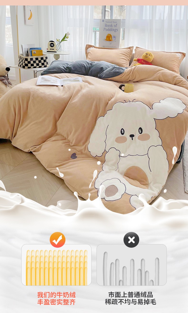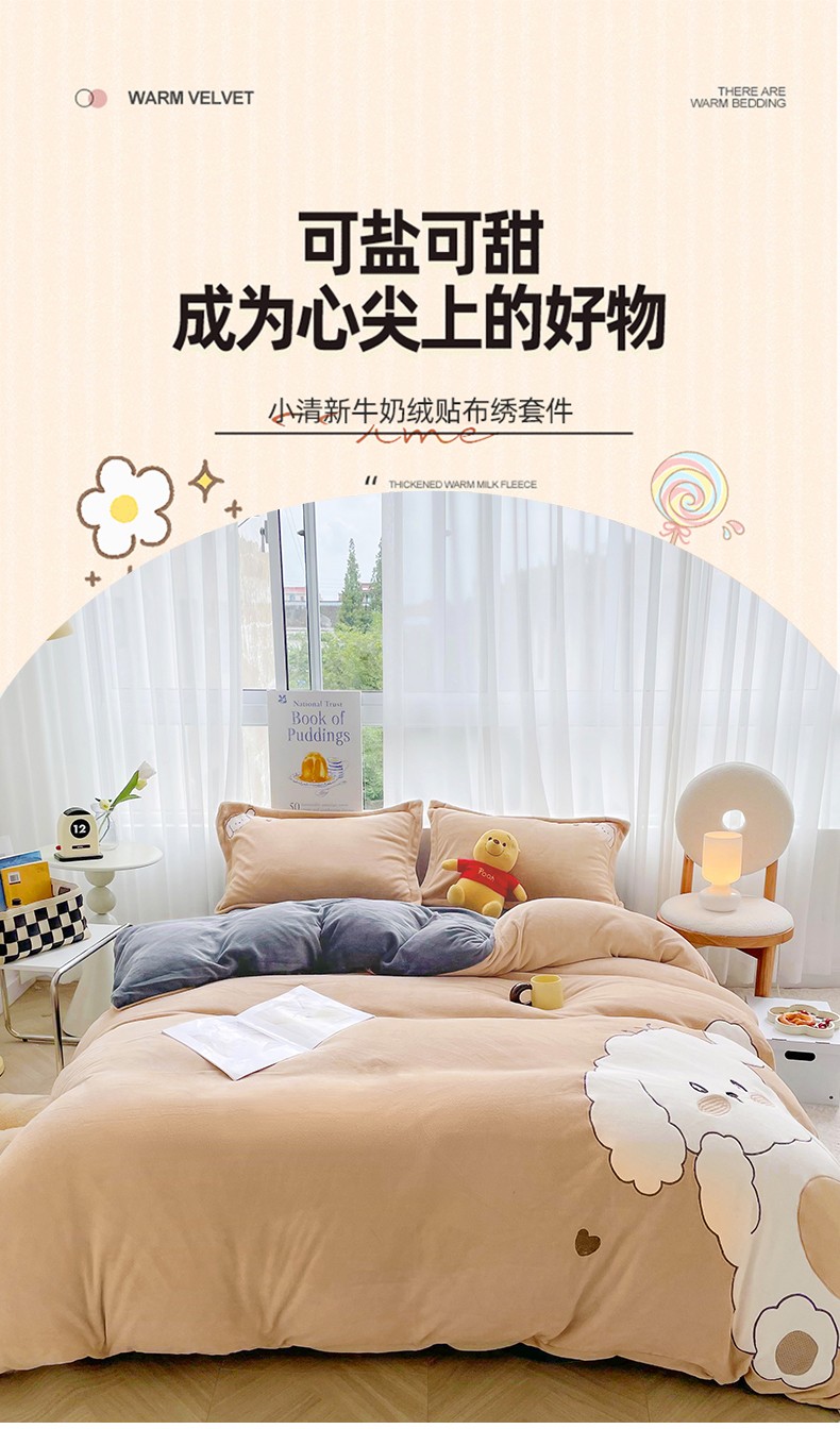 商品名称:推推 2025新款毛巾绣贴布绣牛奶绒四件套 俏耳狗-杏色+深灰