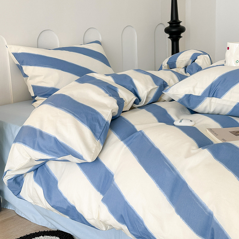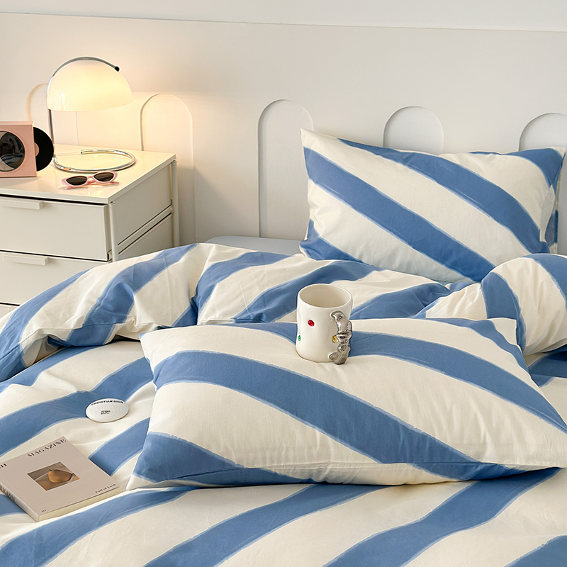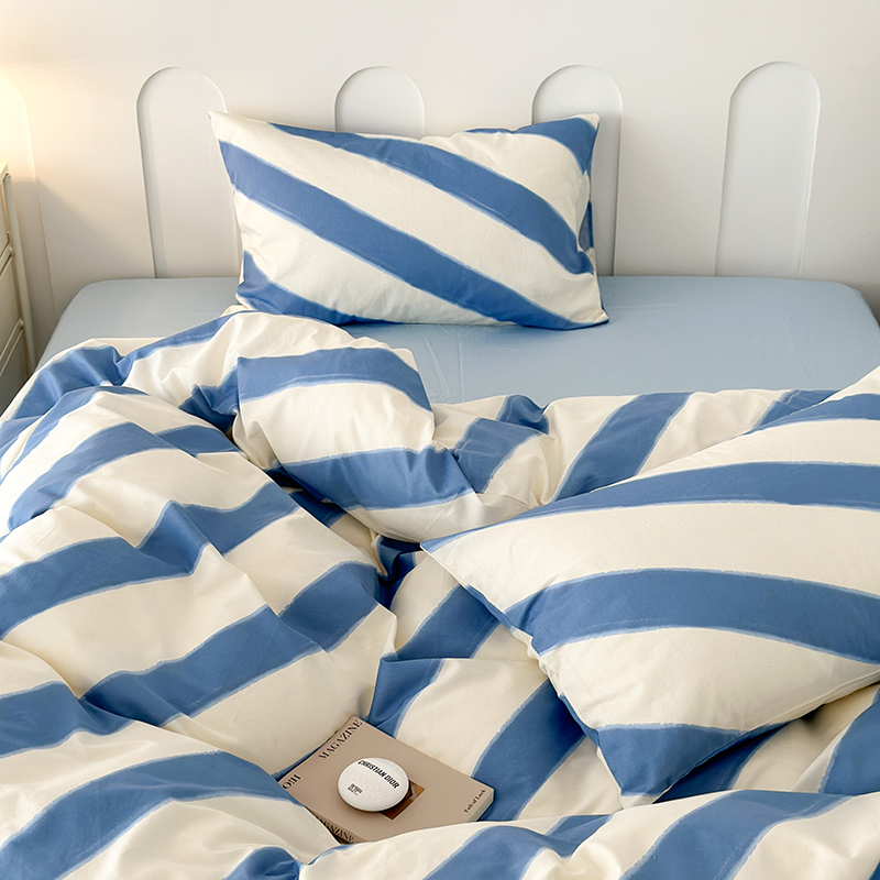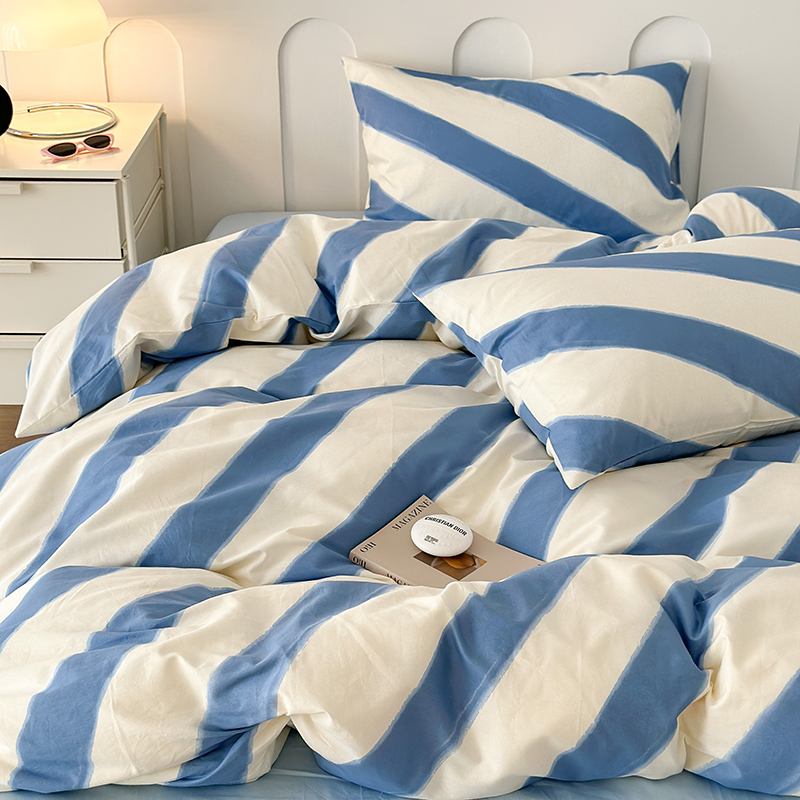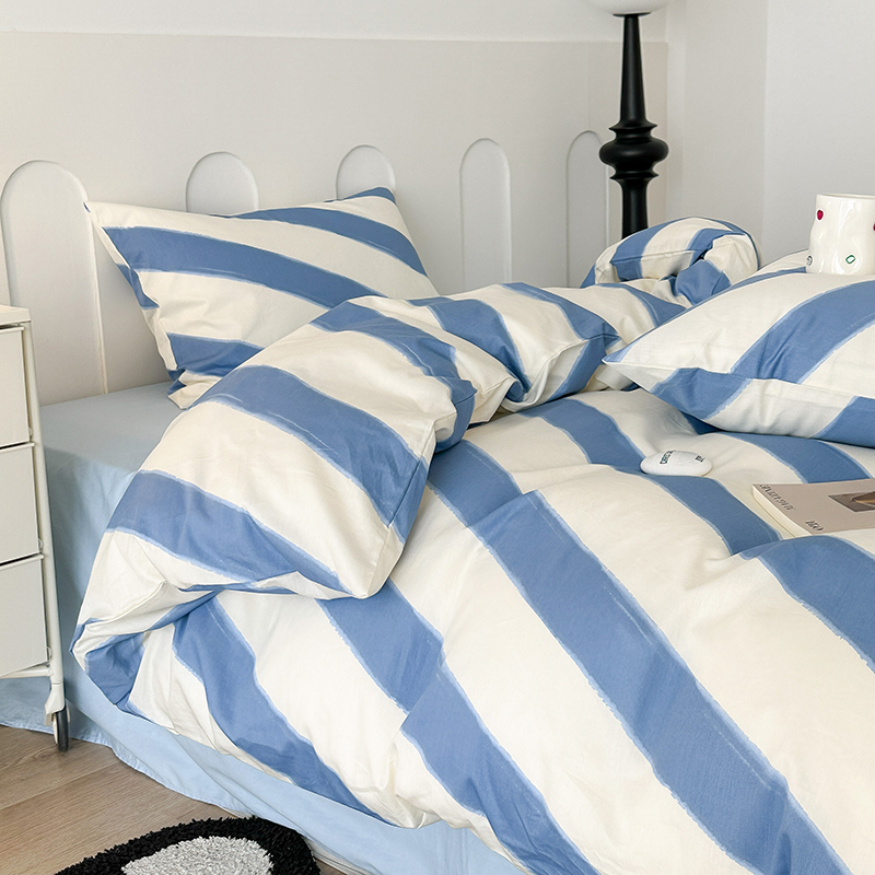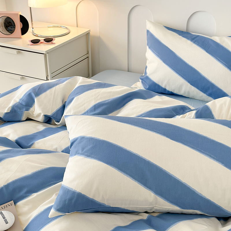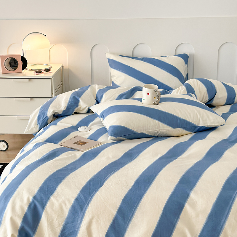 昔可家纺 2023新款多巴胺少女风条纹全棉四件套 海盐蓝条