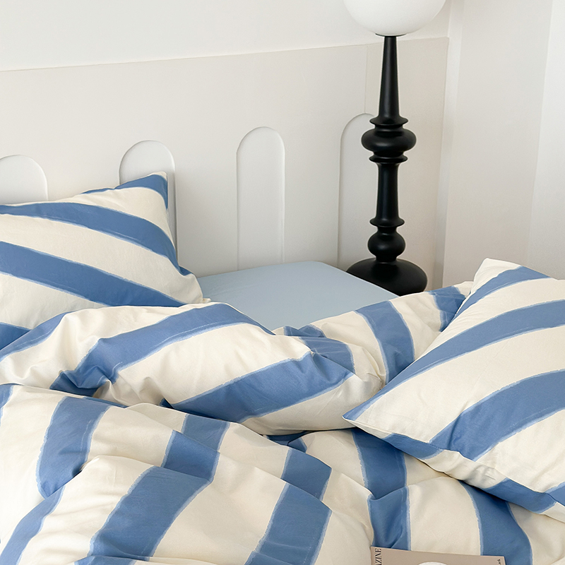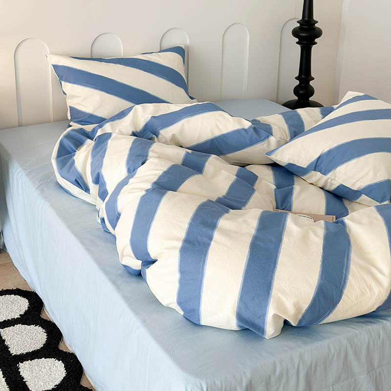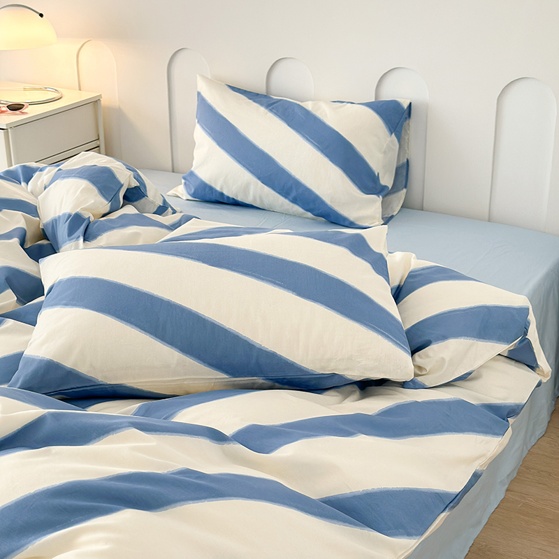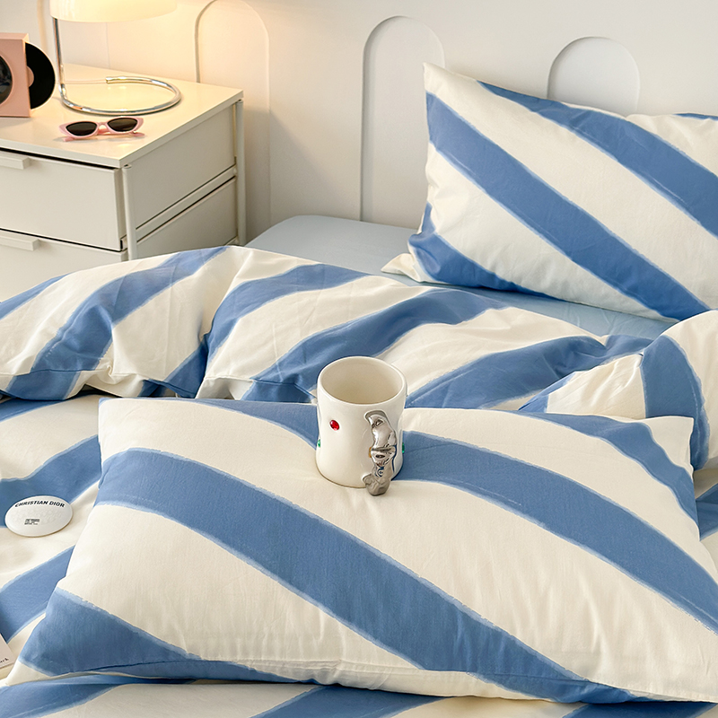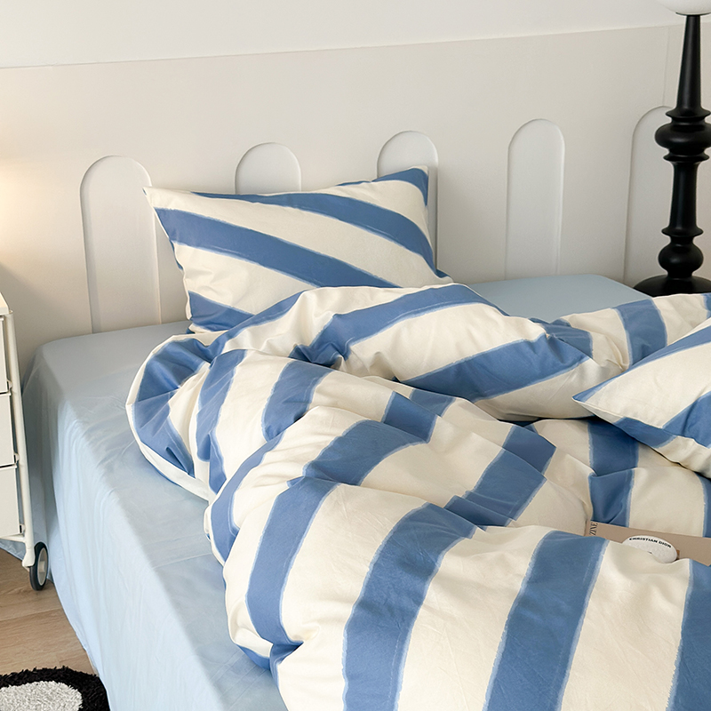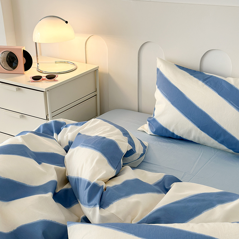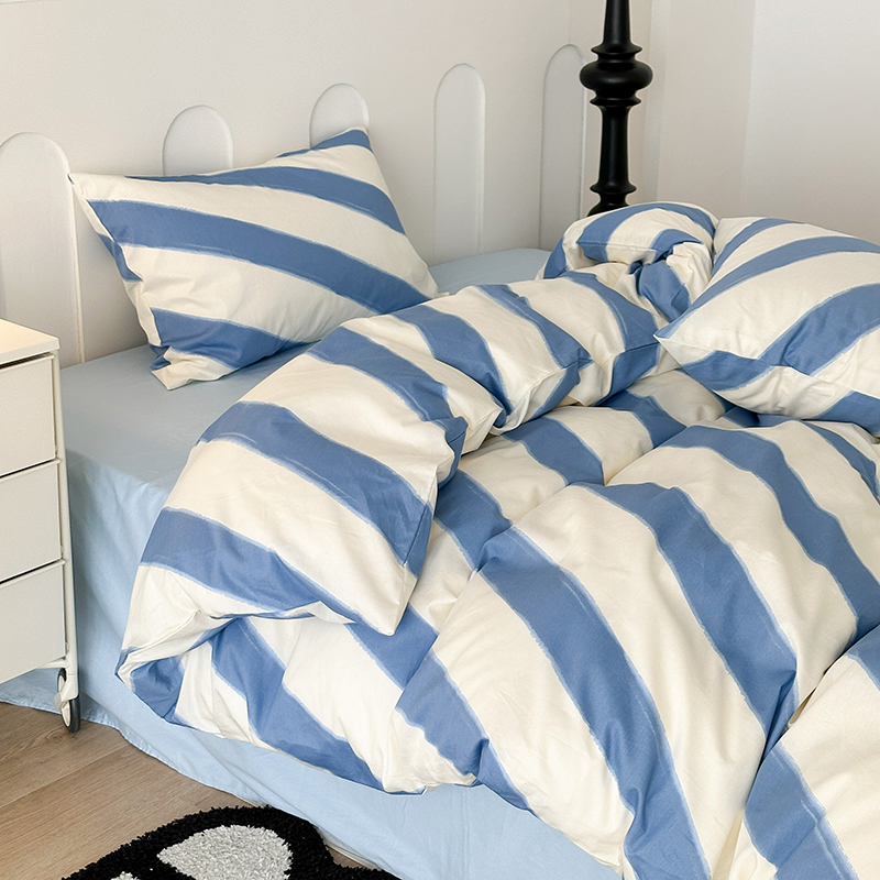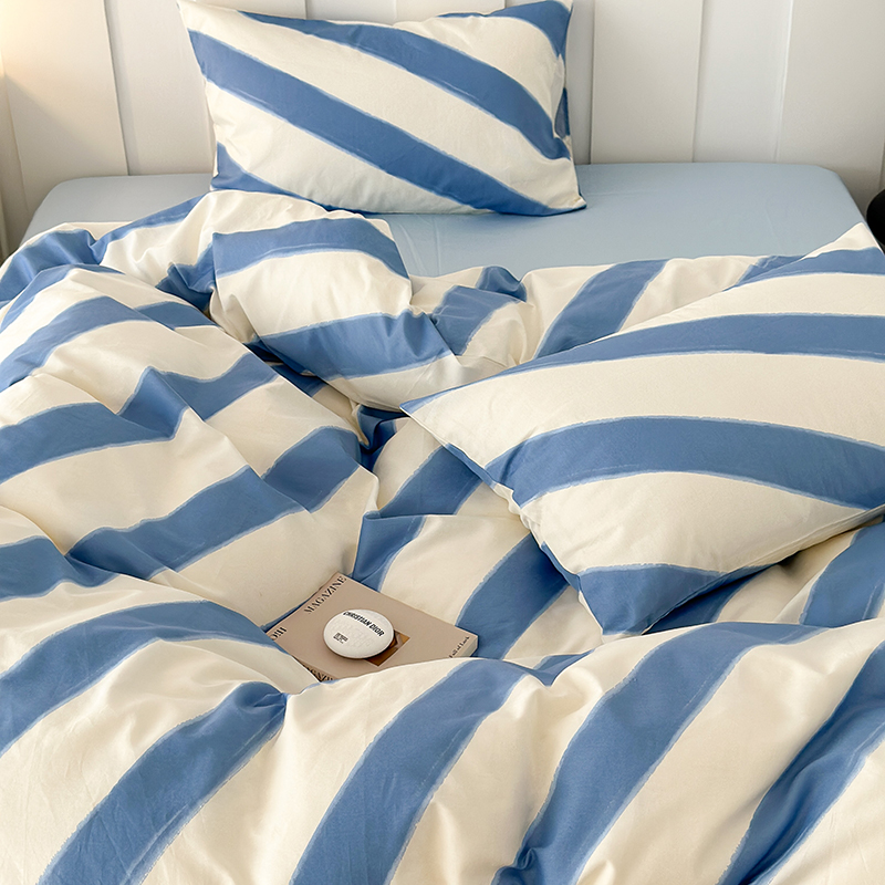 昔可家纺 2023新款多巴胺少女风条纹全棉四件套 海盐蓝条