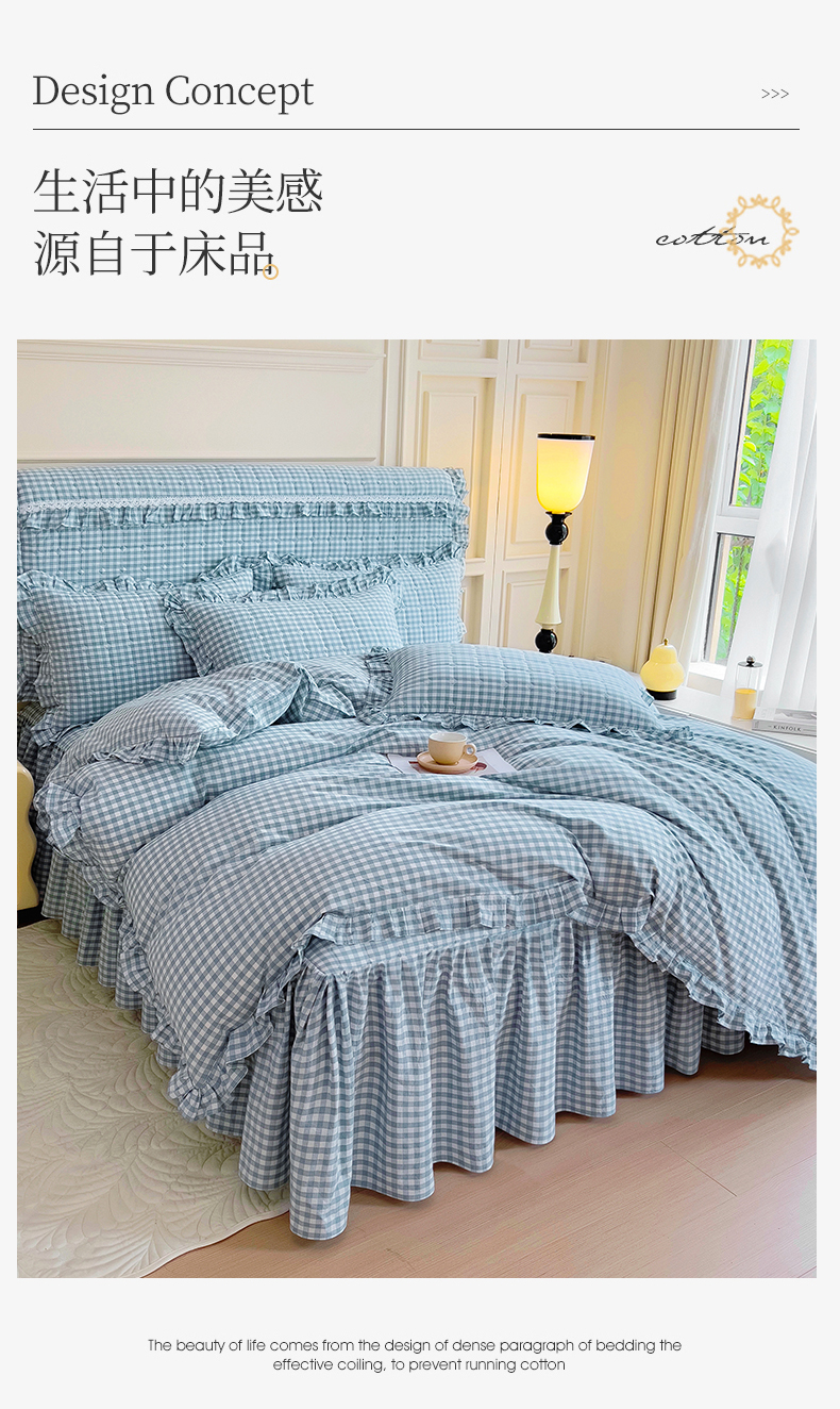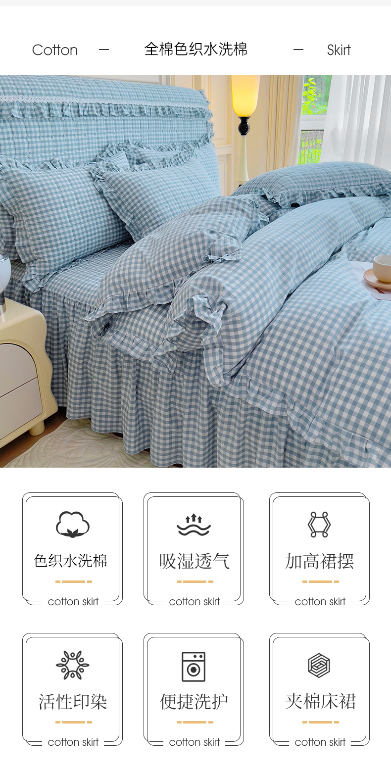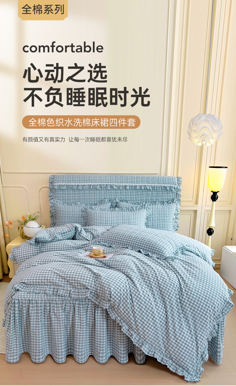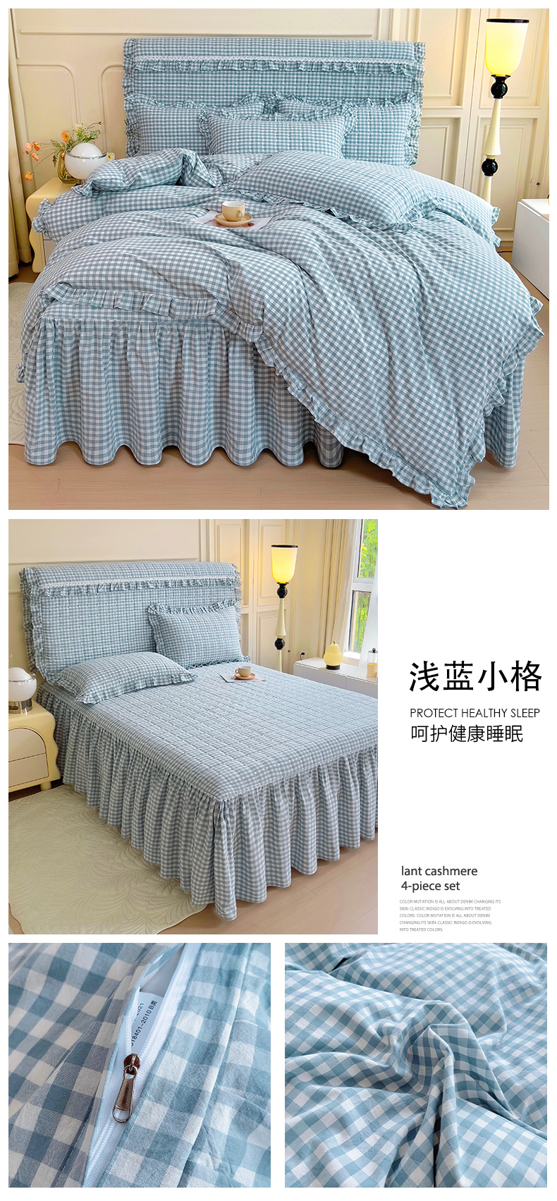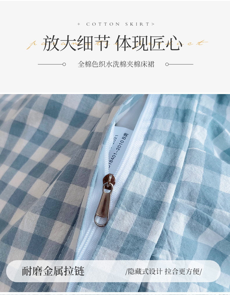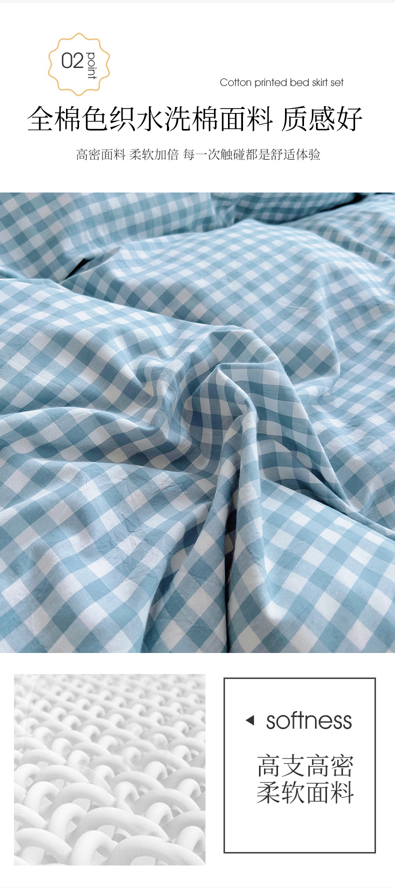 当前位置: 91家纺网 > 商品网购 > 床品套件 > 四件套 > 水洗棉四件套 > 十个点 2024新款色织水洗棉韵格系列床裙款四件套 浅蓝小格