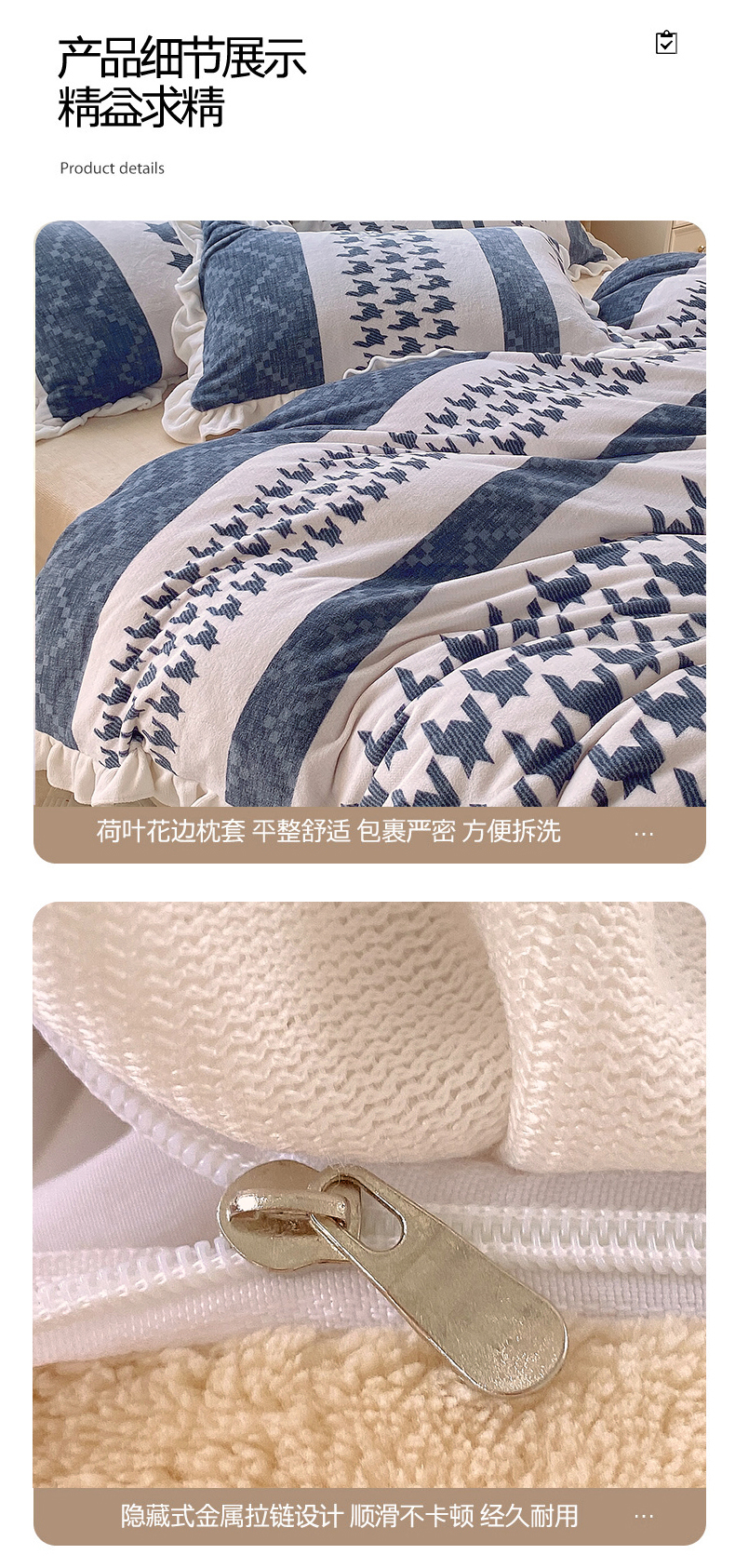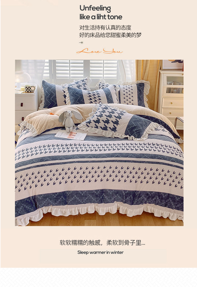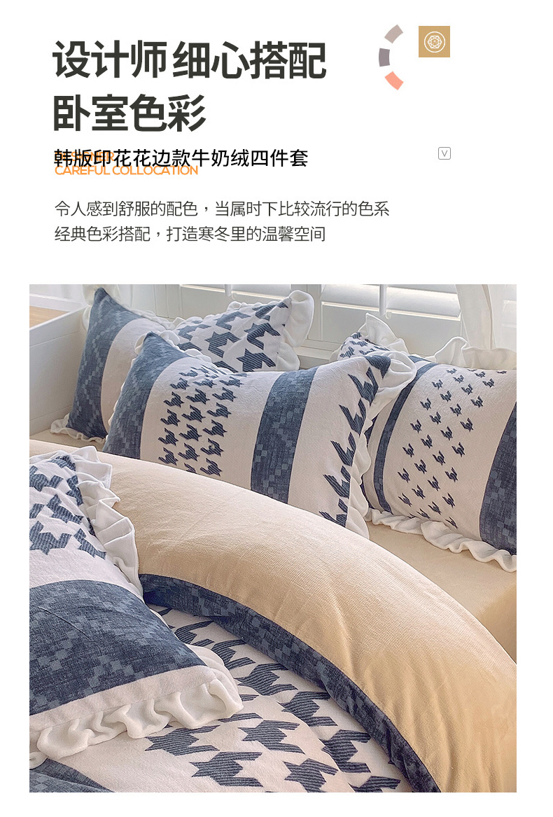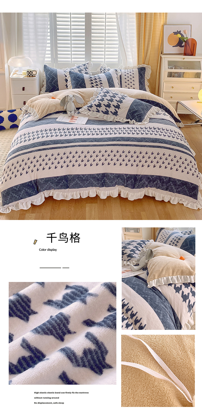 商品名称:宜家坊 2023新款直播韩版印花花边款牛奶绒四件套 千鸟格