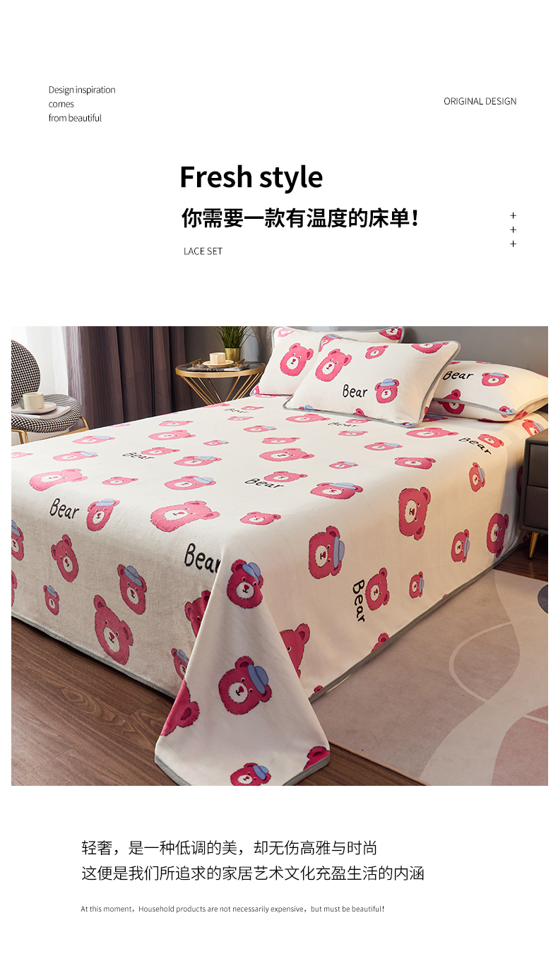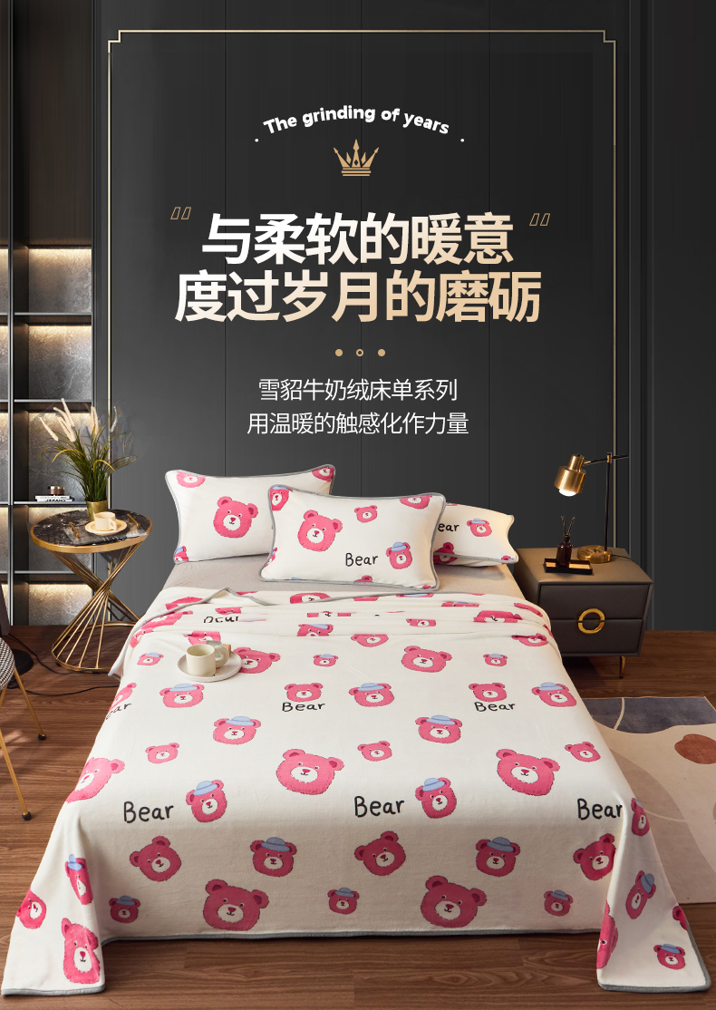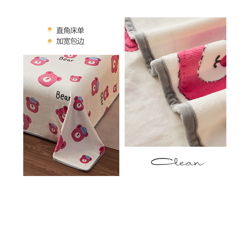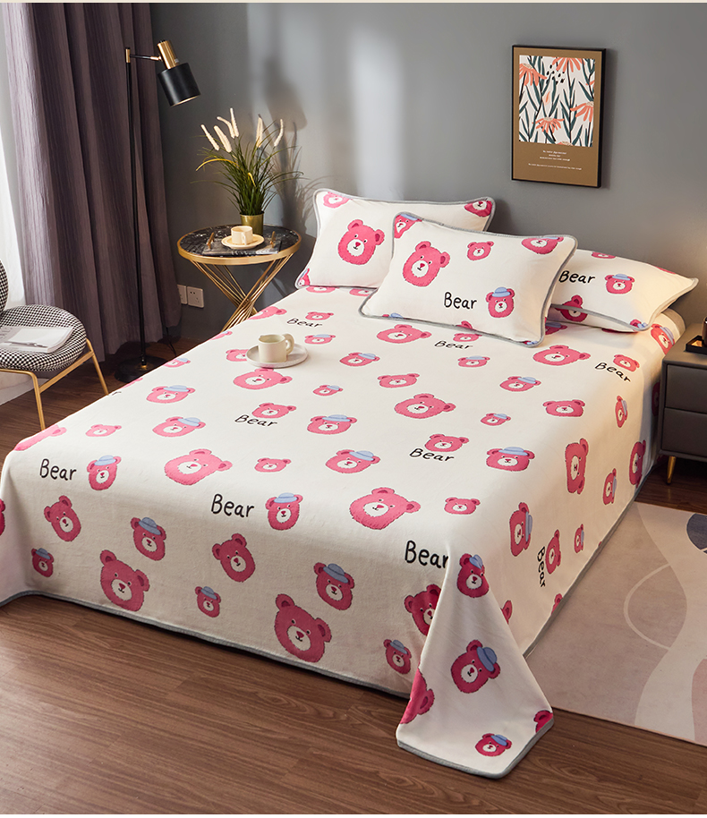 全季家居 2023新款纯色印花高克重抗静电包边牛奶绒床单-印花 粉熊派