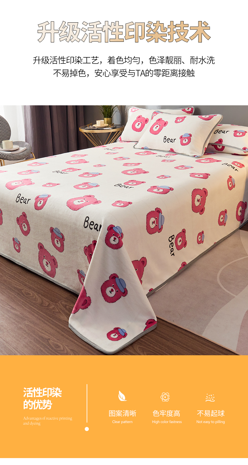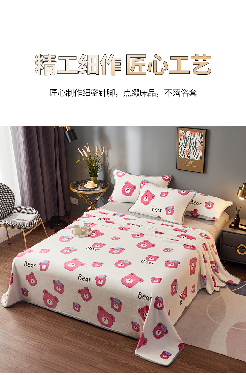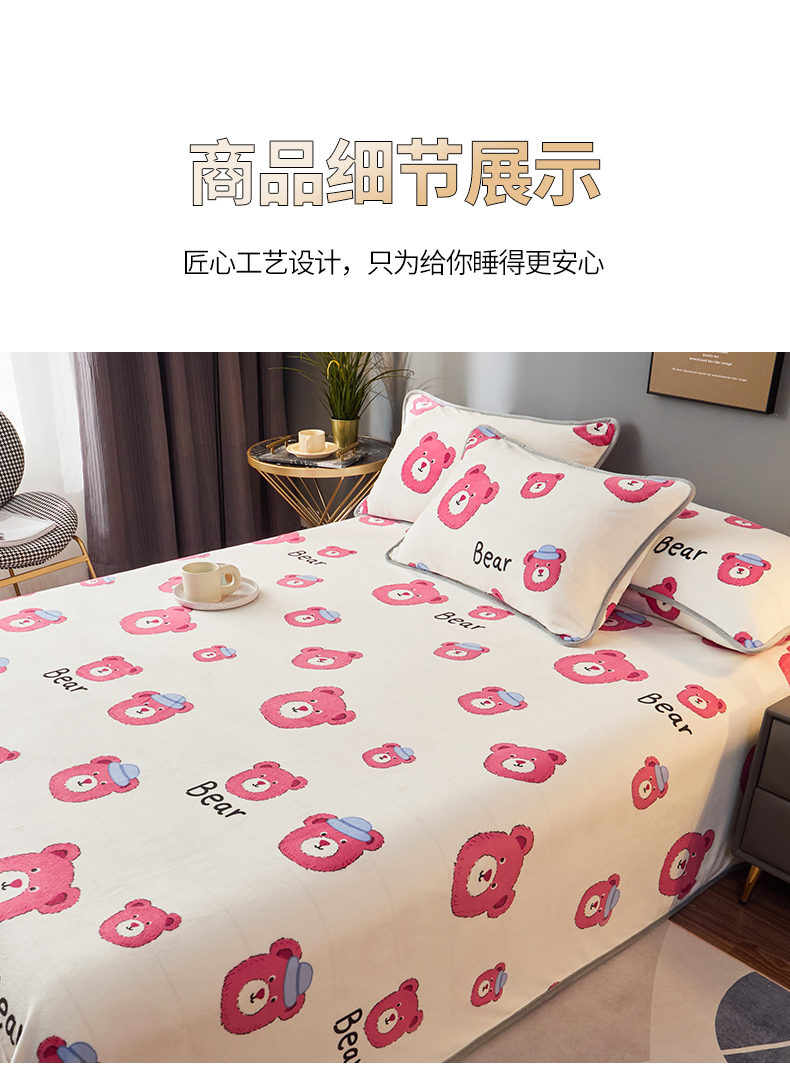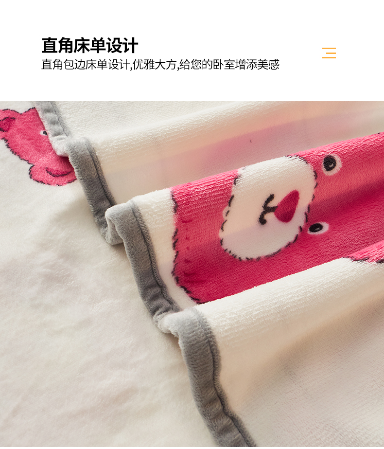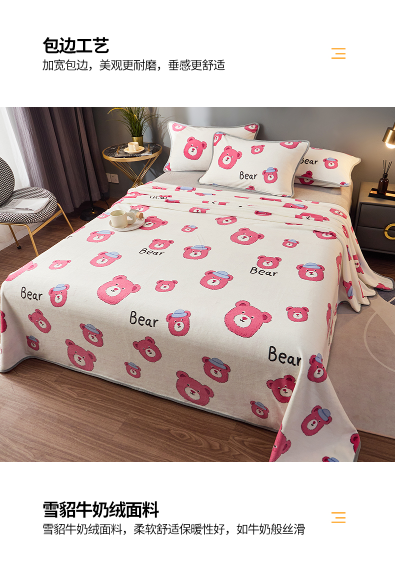 商品名称:全季家居 2023新款纯色印花高克重抗静电包边牛奶绒床单-印花 粉熊派
