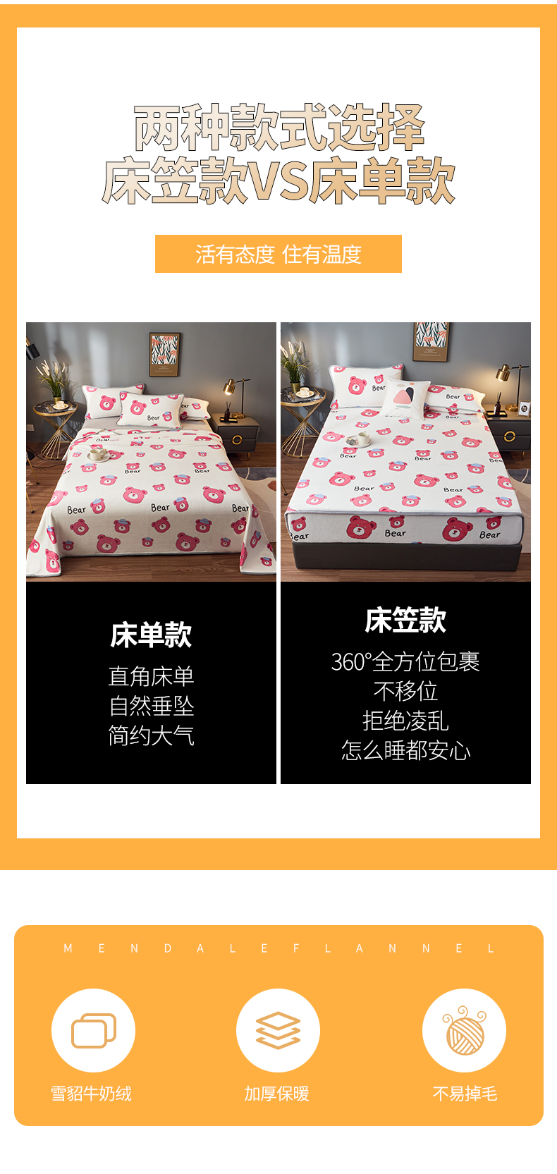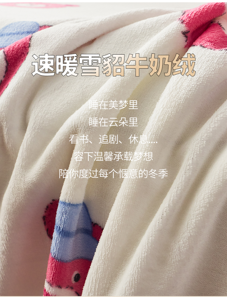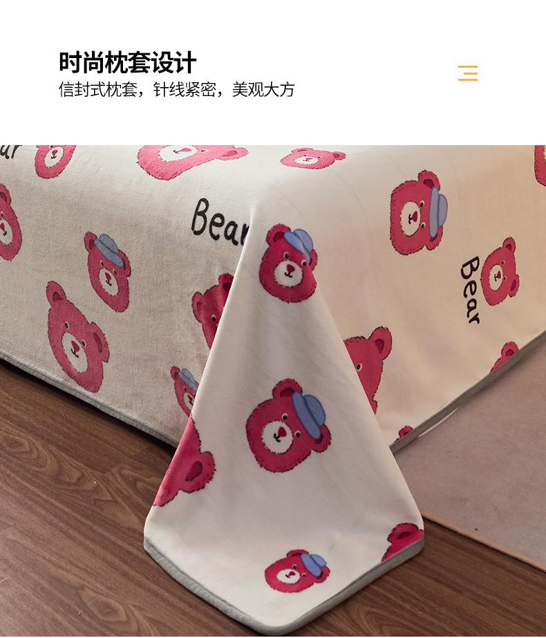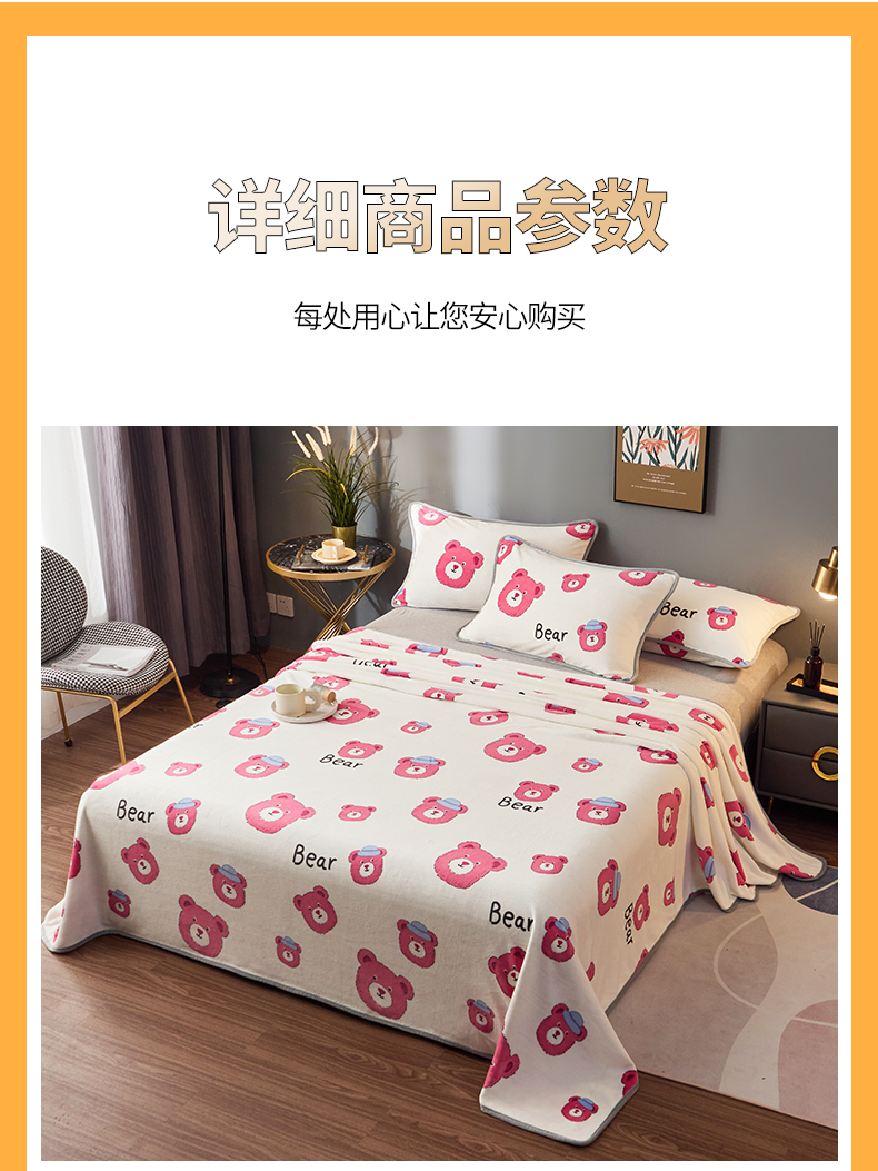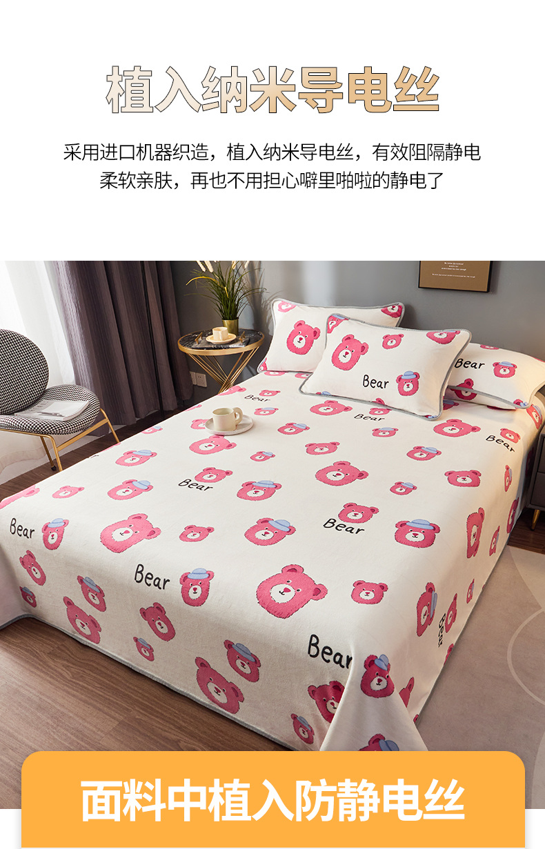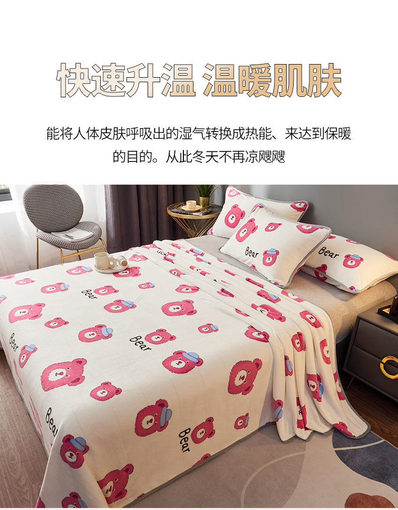 商品名称:全季家居 2023新款纯色印花高克重抗静电包边牛奶绒床单-印花 粉熊派