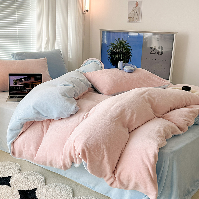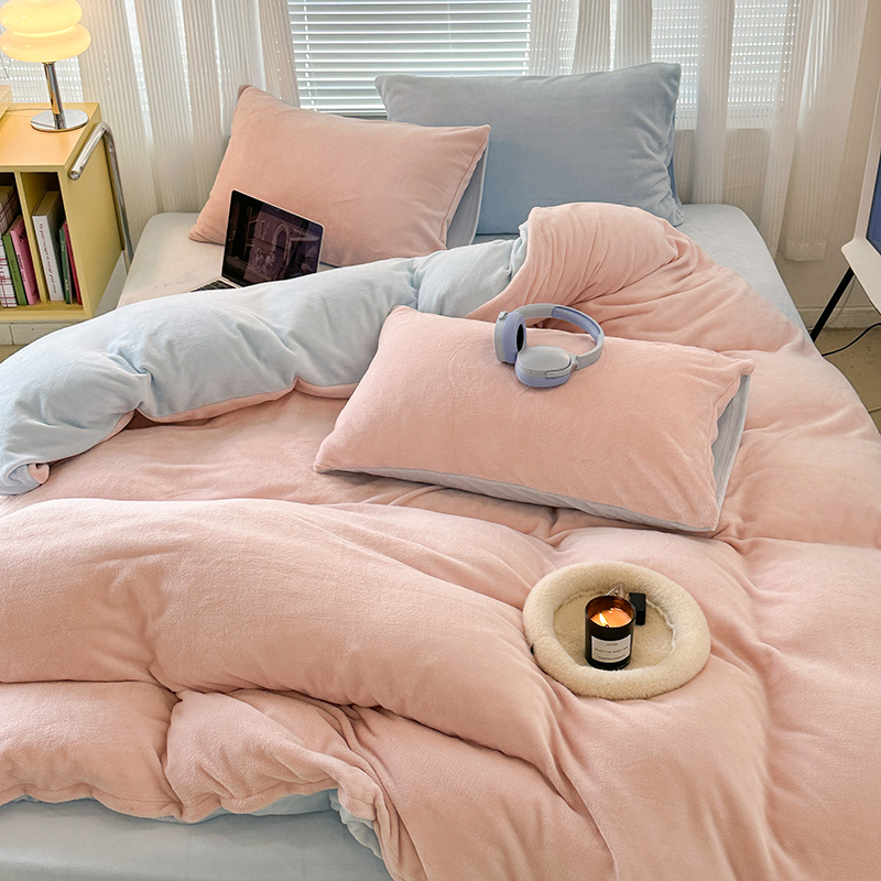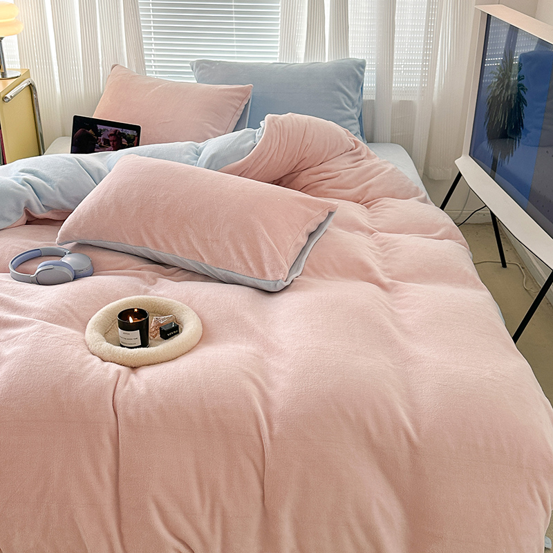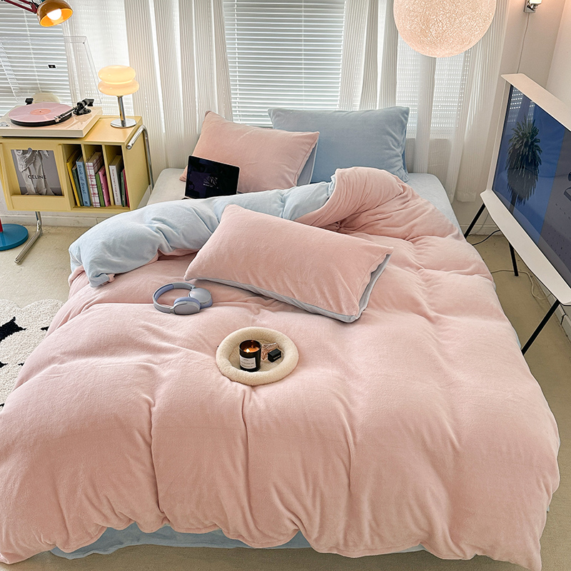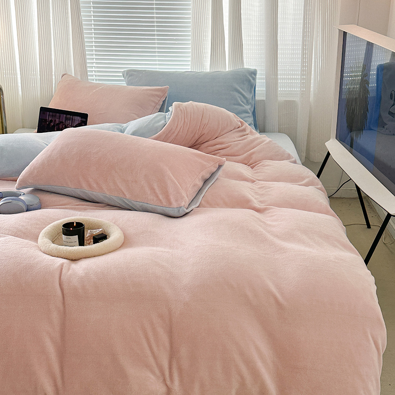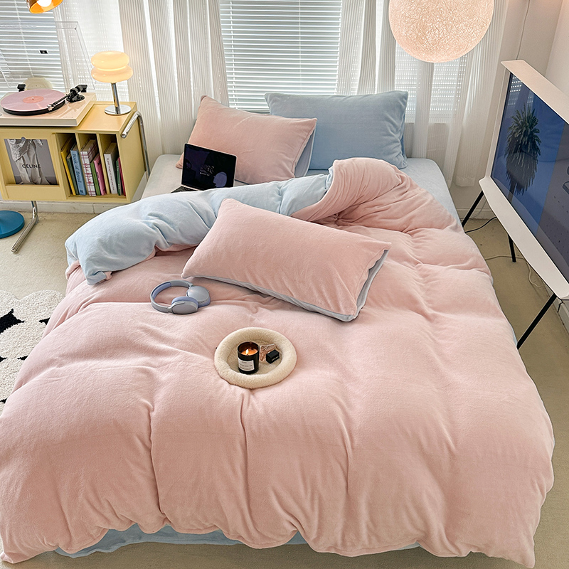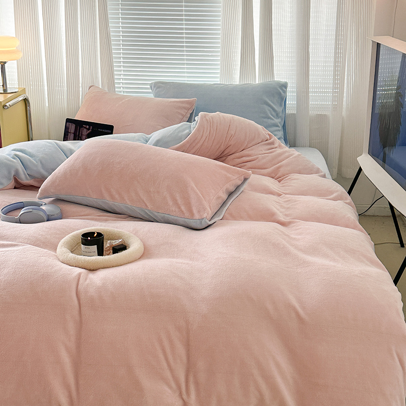 昔可家纺 2023新款奶油纯色系列双拼牛奶绒四件套 草莓慕斯