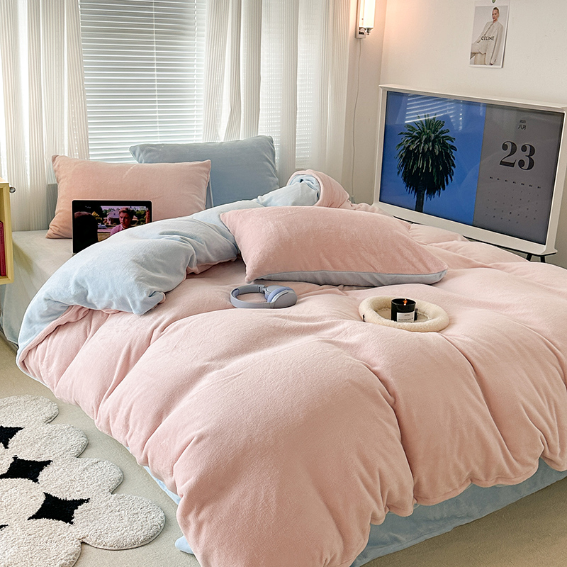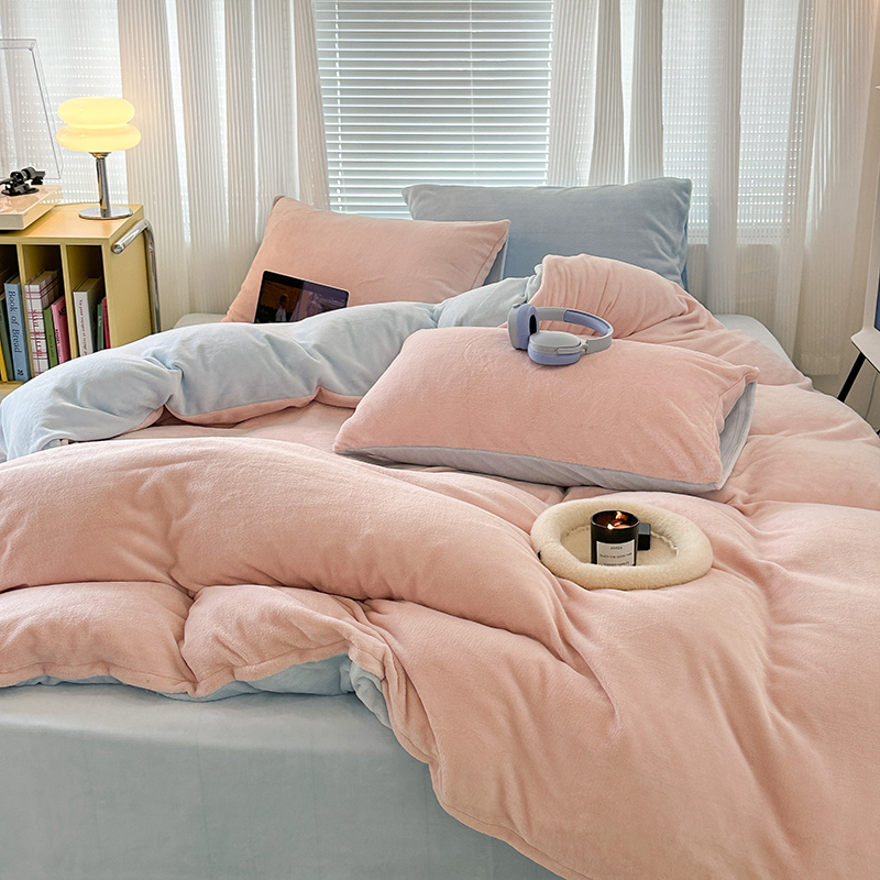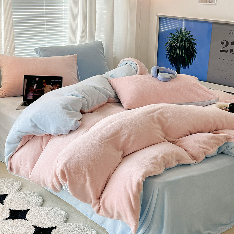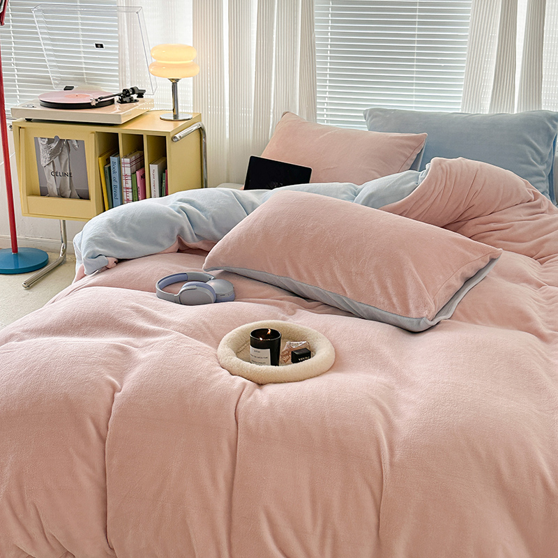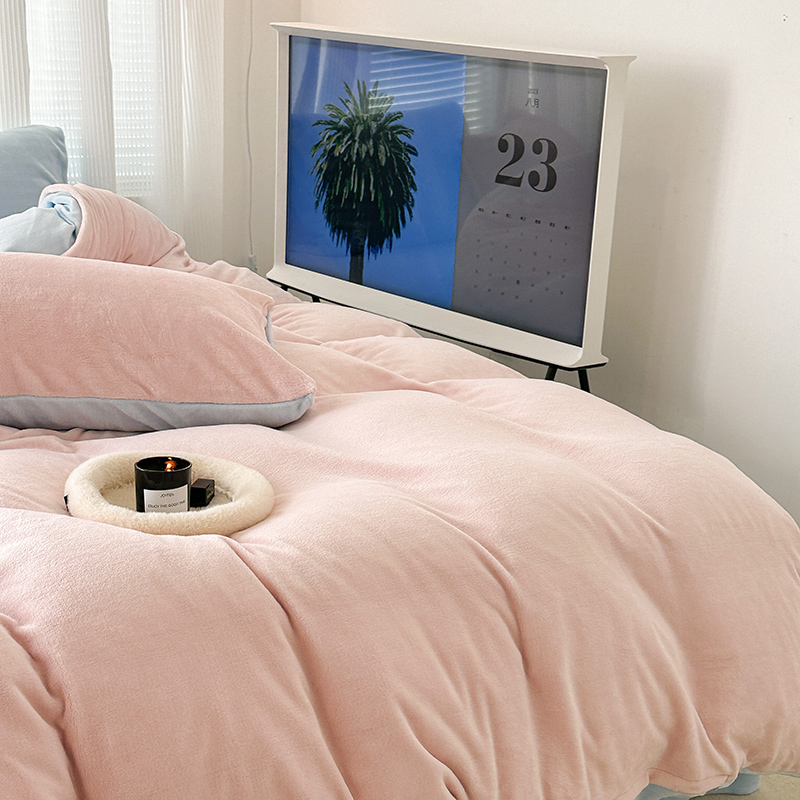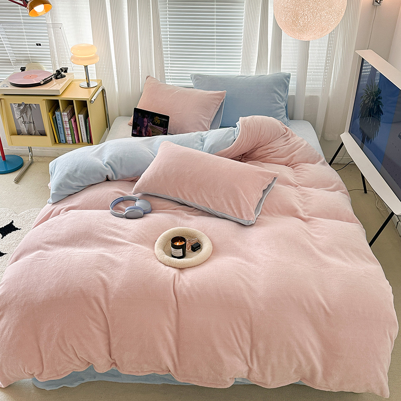 昔可家纺 2023新款奶油纯色系列双拼牛奶绒四件套 草莓慕斯