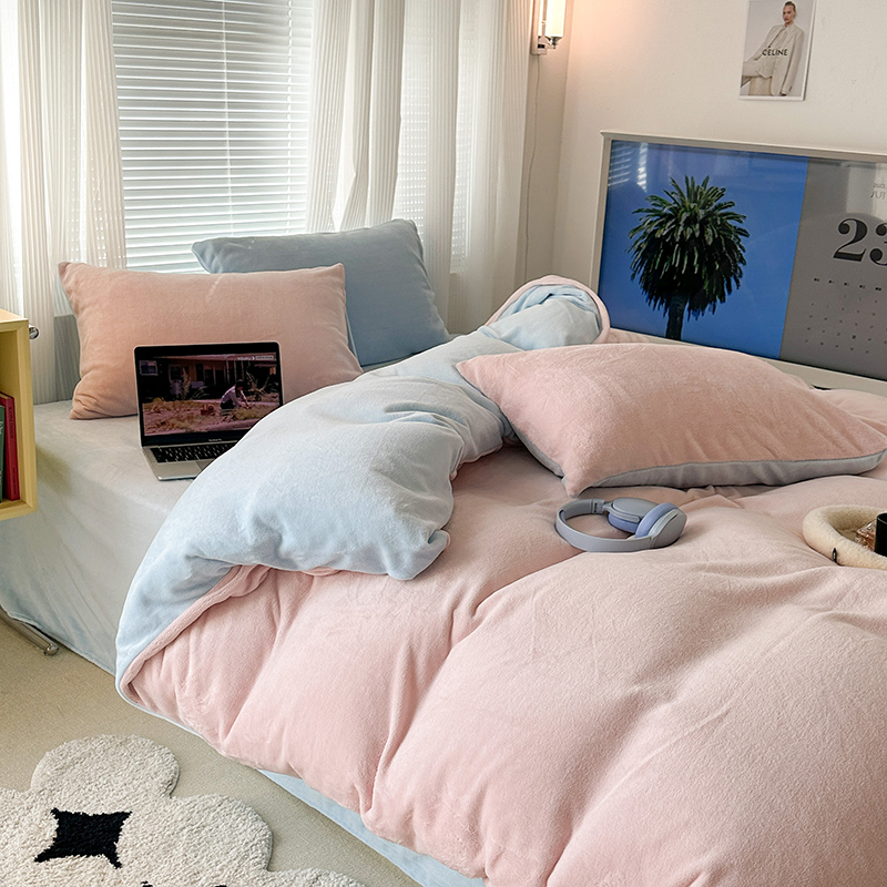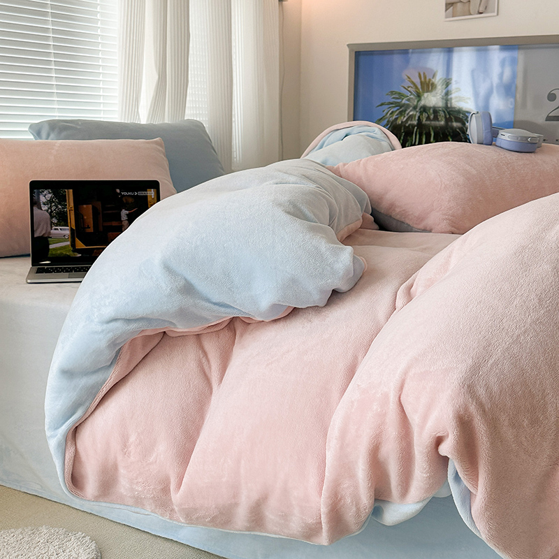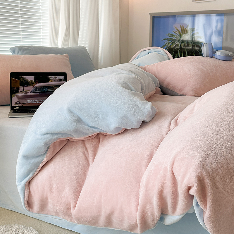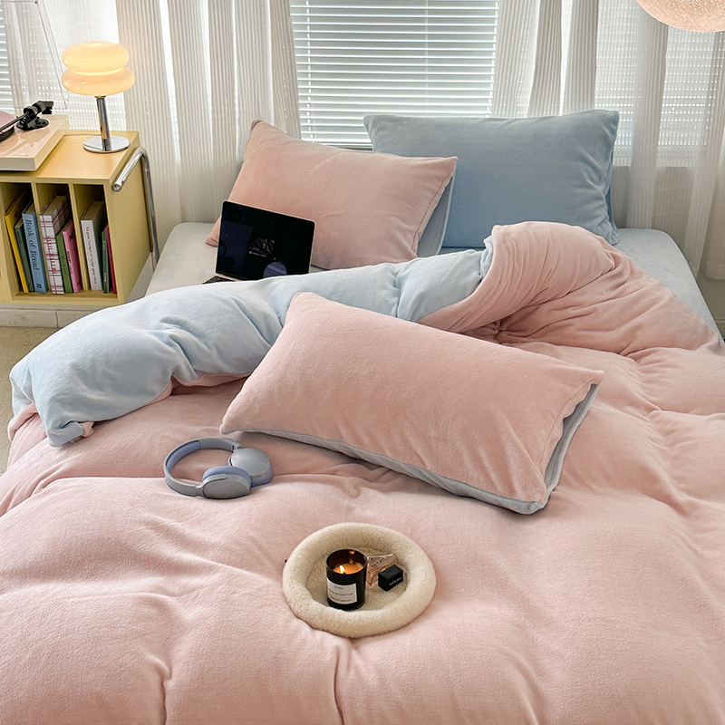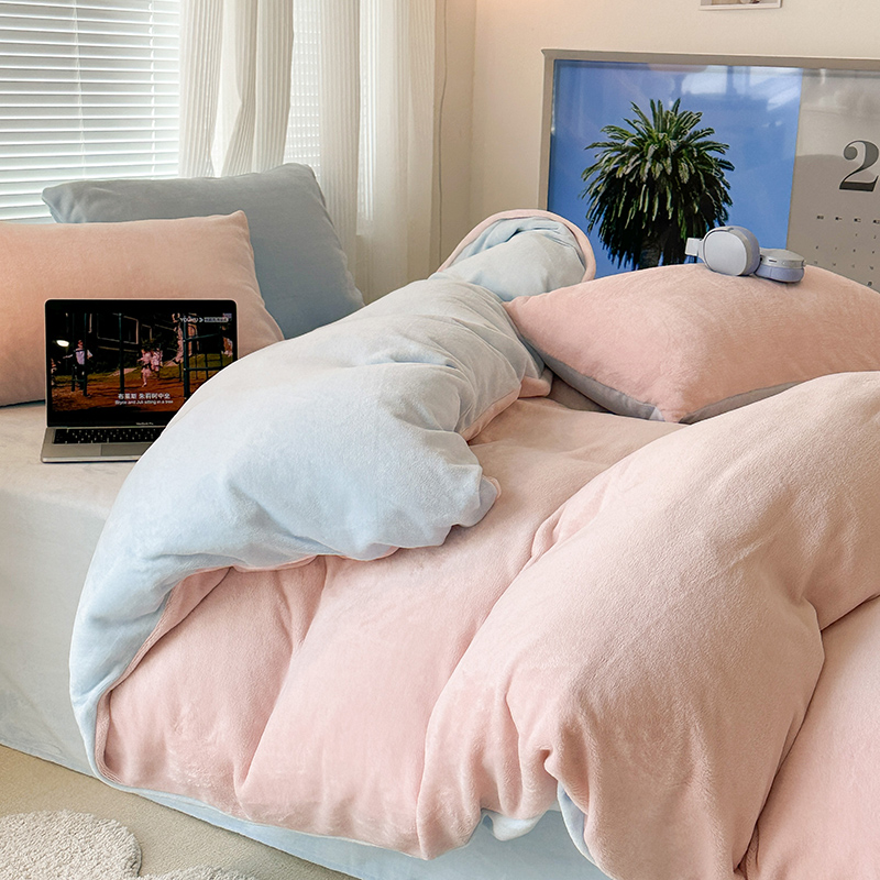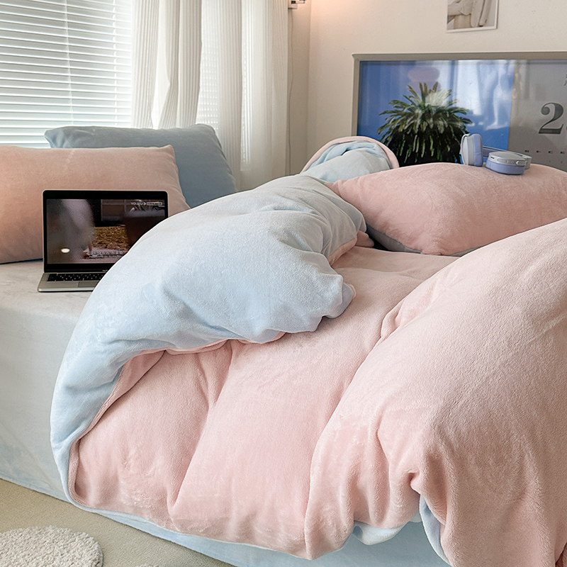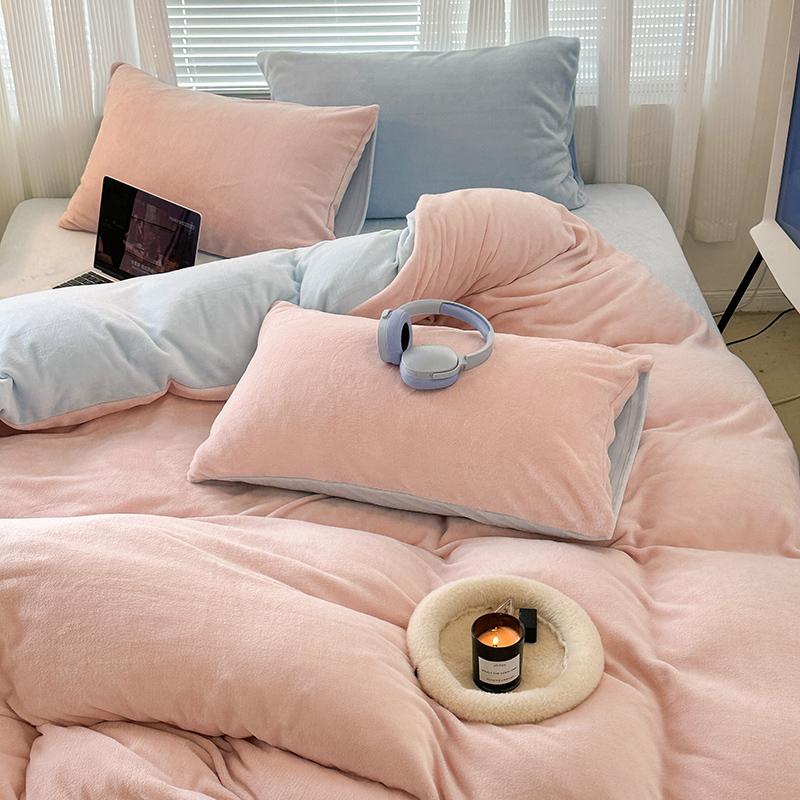 昔可家纺 2023新款奶油纯色系列双拼牛奶绒四件套 草莓慕斯