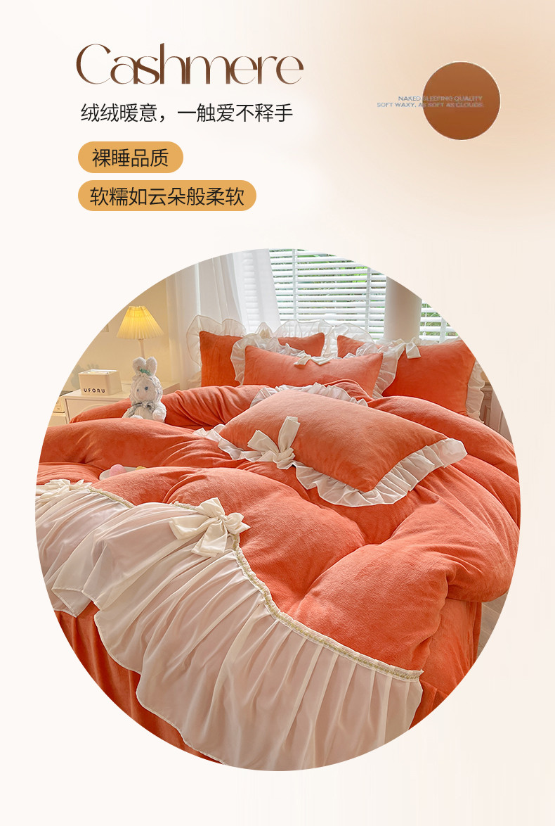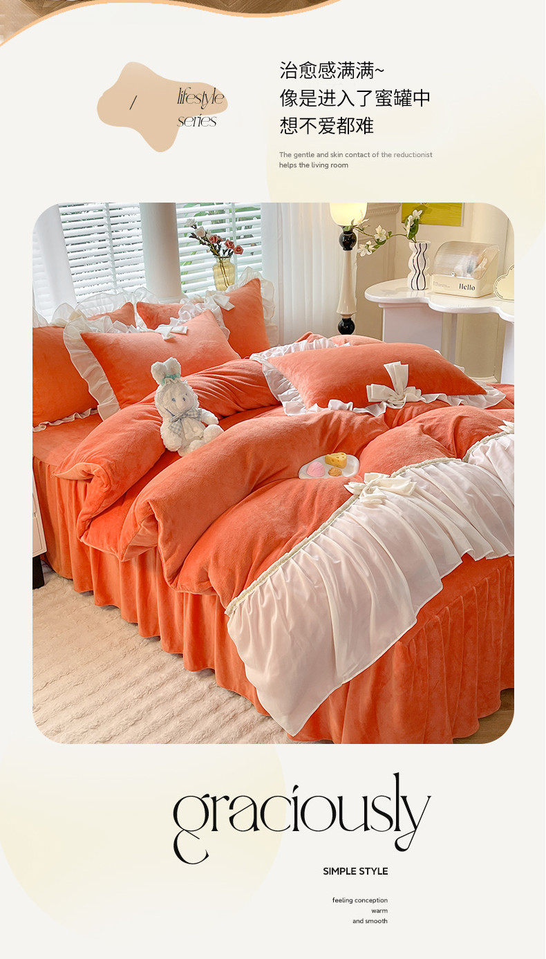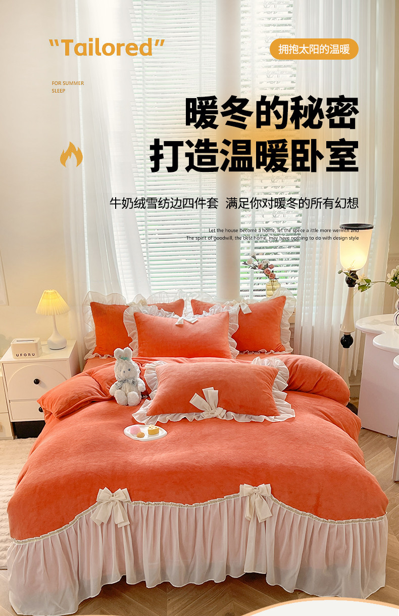 (总)芭比蔓 2024新款直播供货韩版花边款牛奶绒四件套,爱玛橙,宝石红,湖蓝,倾国粉,秋月黄,深灰,珍珠白,竹青绿