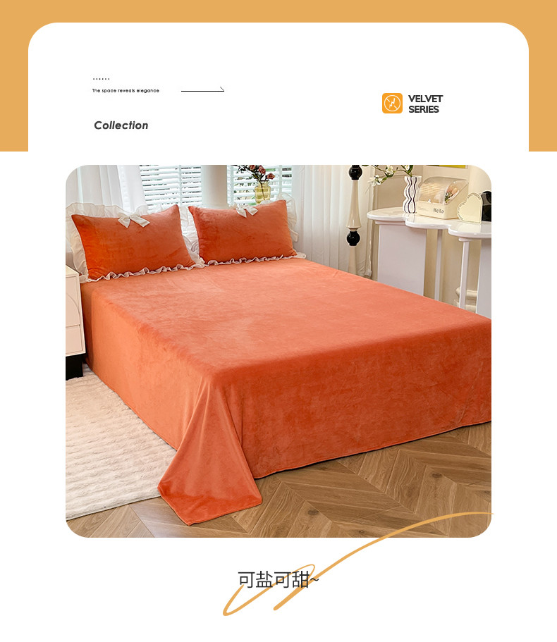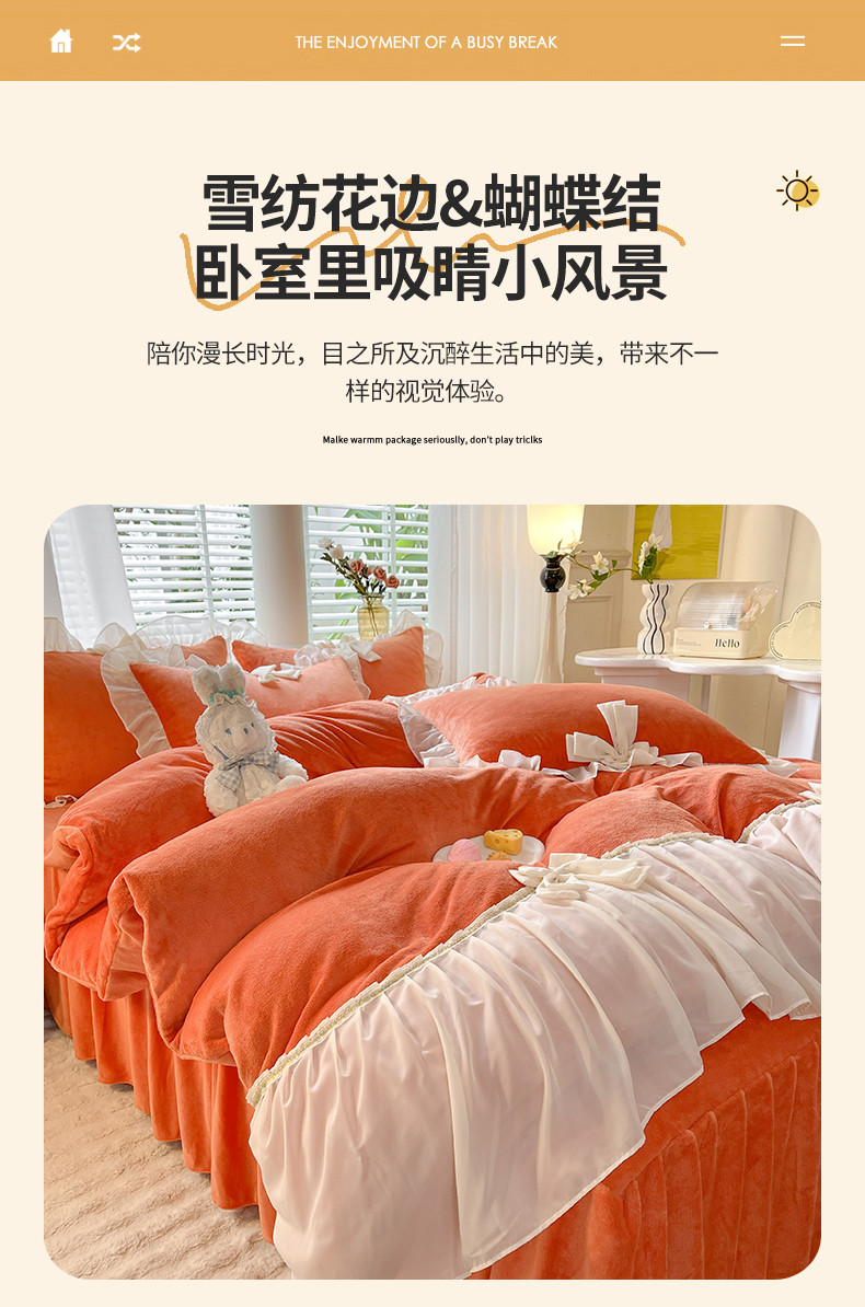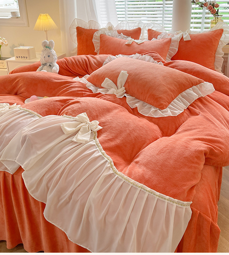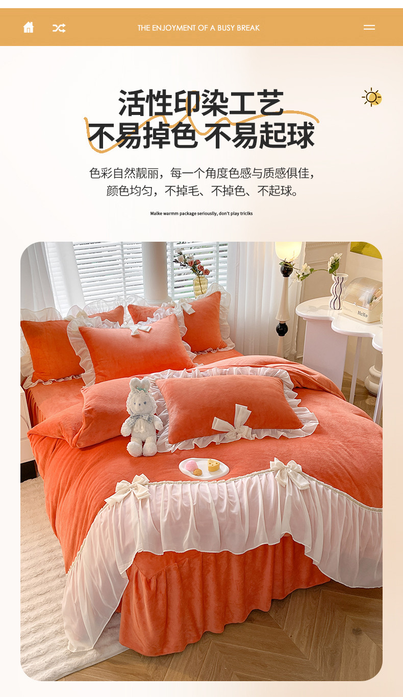 (总)芭比蔓 2024新款直播供货韩版花边款牛奶绒四件套,爱玛橙,宝石红,湖蓝,倾国粉,秋月黄,深灰,珍珠白,竹青绿