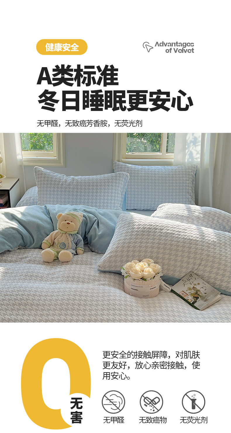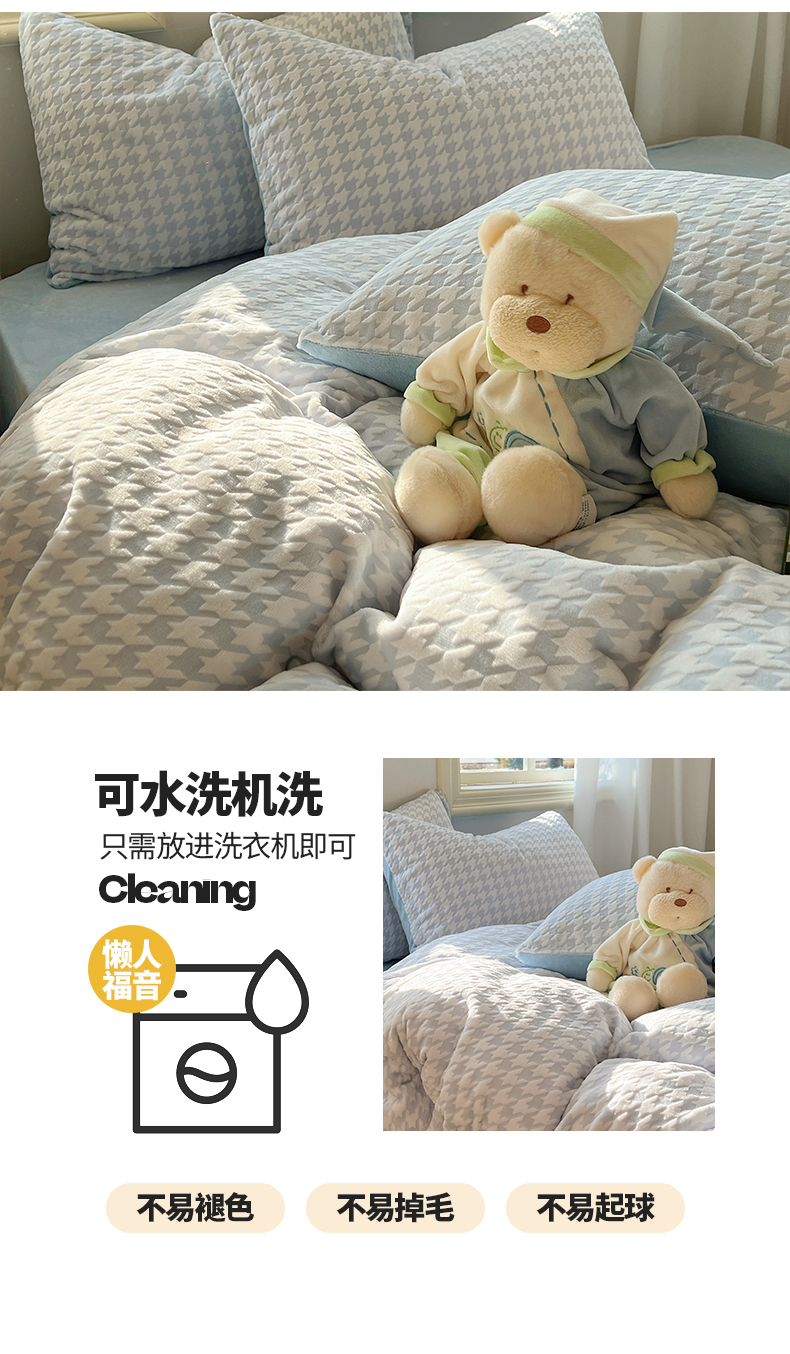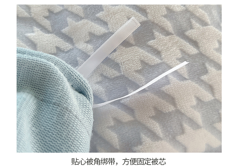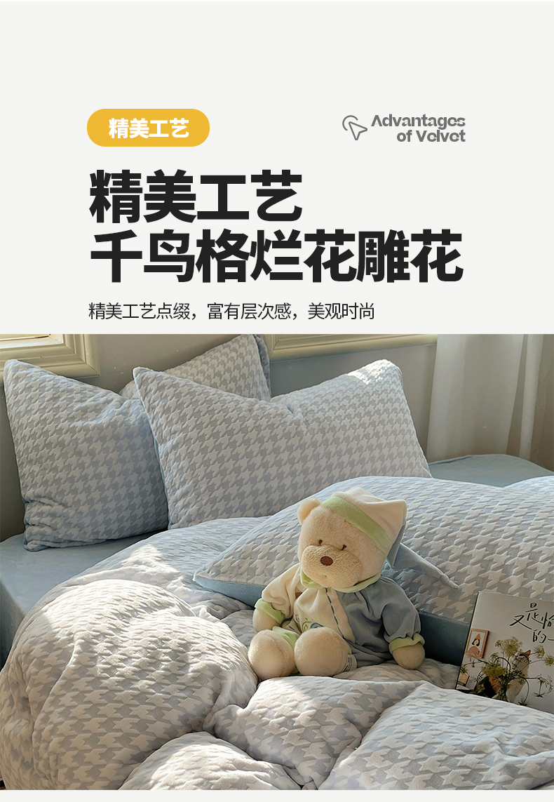 商品名称:桃子家居 2023新款A类高克重230克3D立体雕花烂花提花千鸟格少女花边款简单款牛奶绒四件套 绒烂花-蓝千鸟格