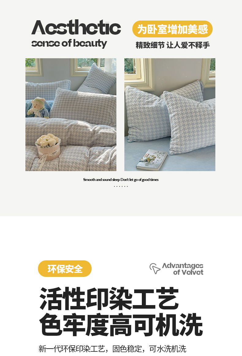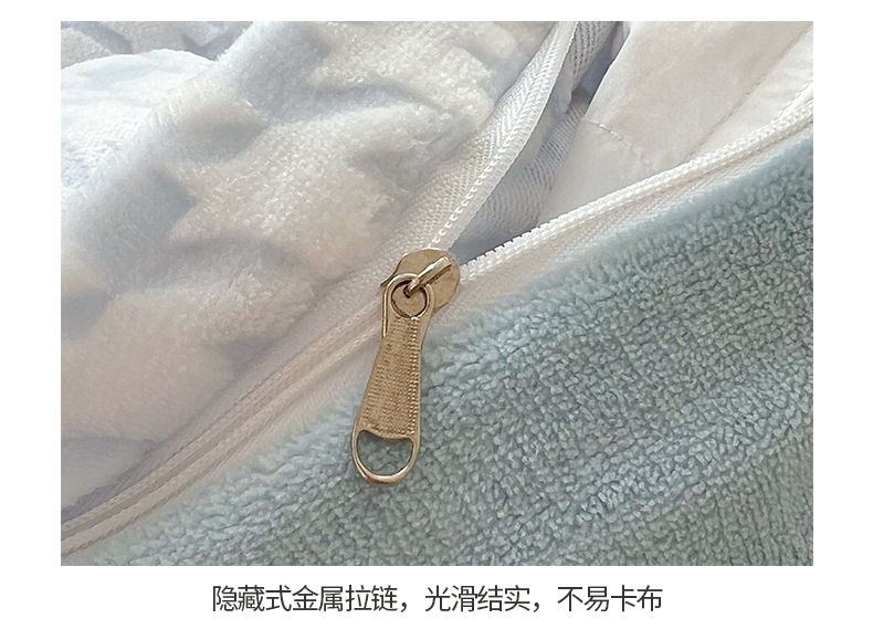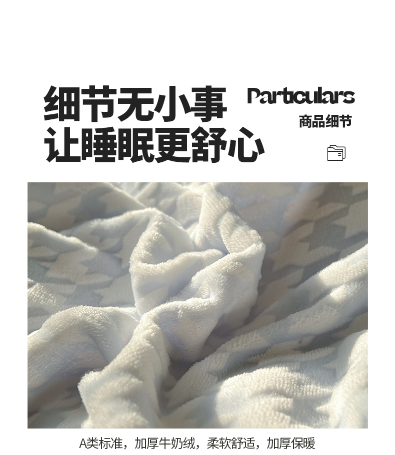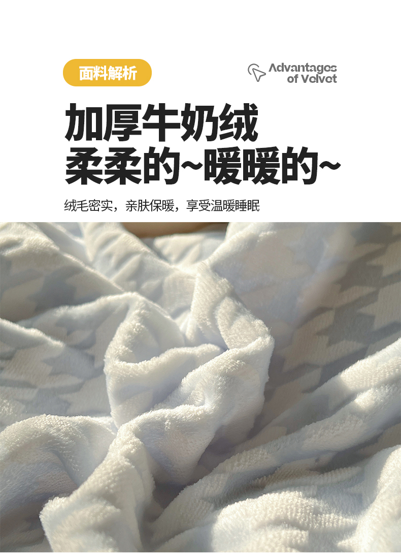 商品名称:桃子家居 2023新款A类高克重230克3D立体雕花烂花提花千鸟格少女花边款简单款牛奶绒四件套 绒烂花-蓝千鸟格
