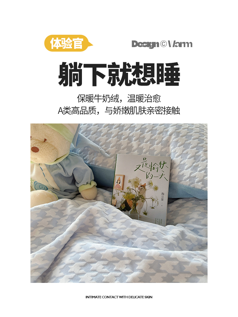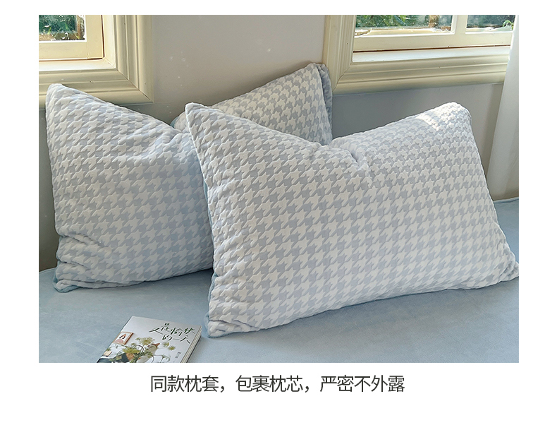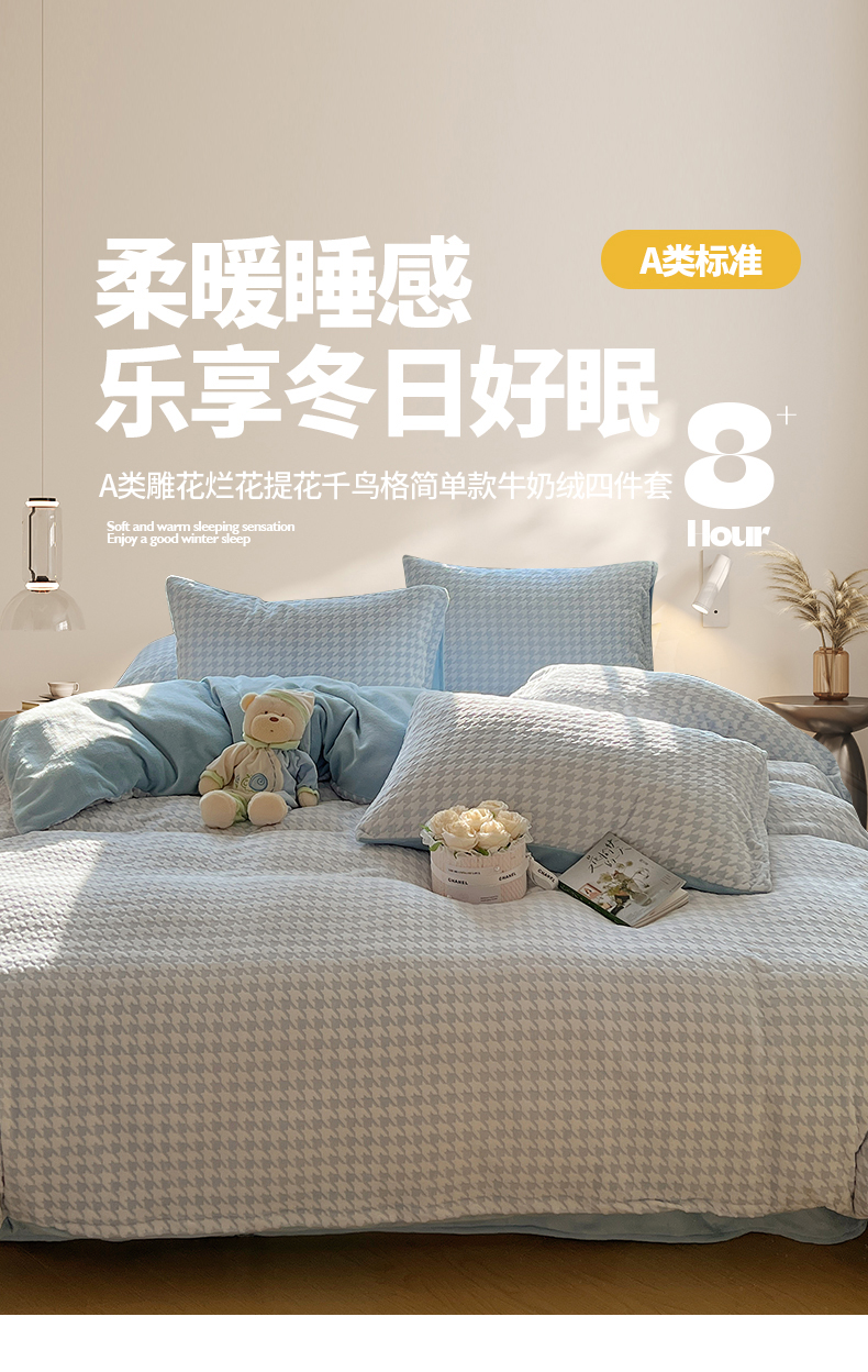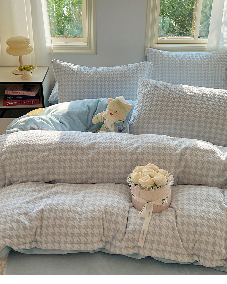 桃子家居 2023新款A类高克重230克3D立体雕花烂花提花千鸟格少女花边款简单款牛奶绒四件套 绒烂花-蓝千鸟格