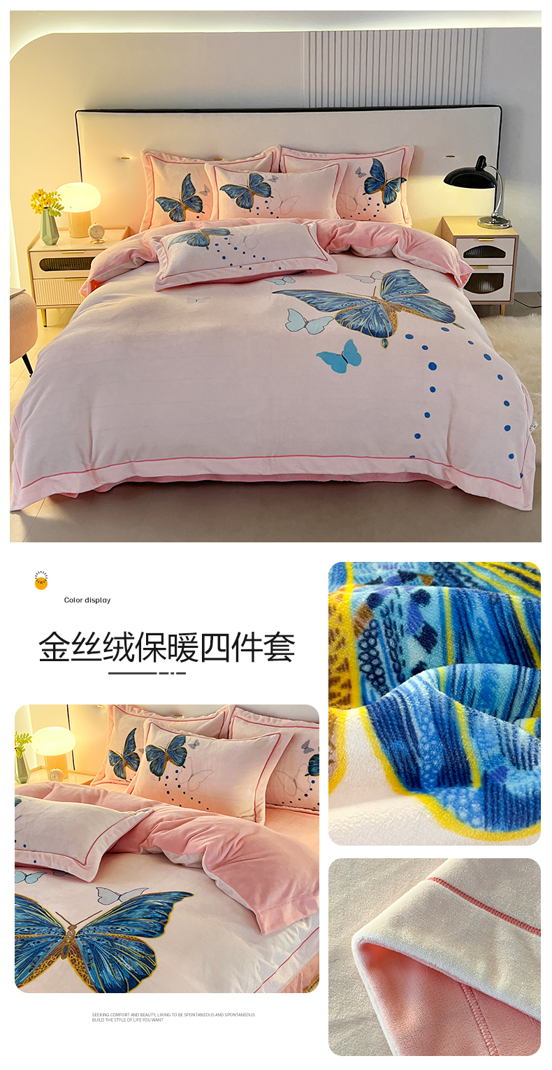 商品名称:富之航家纺 2023新款230克金丝绒四件套 梦蝶-秋樱粉