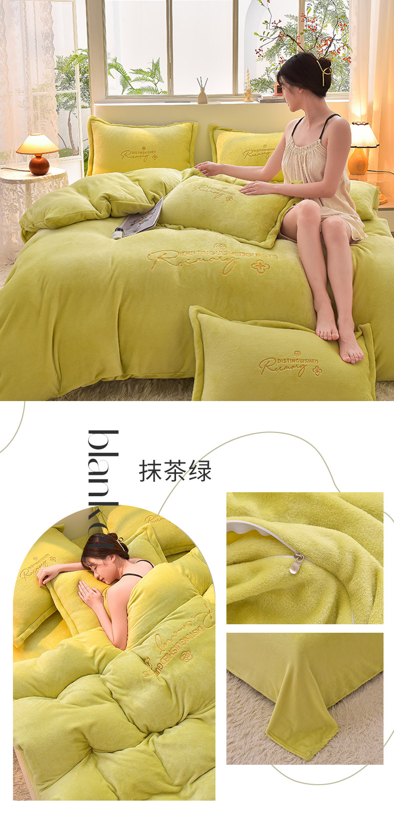 商品名称:简爱家纺2025新款保暖MISS款法莱绒刺绣四件套抹茶绿