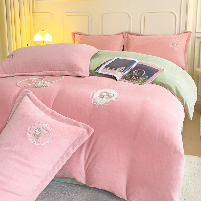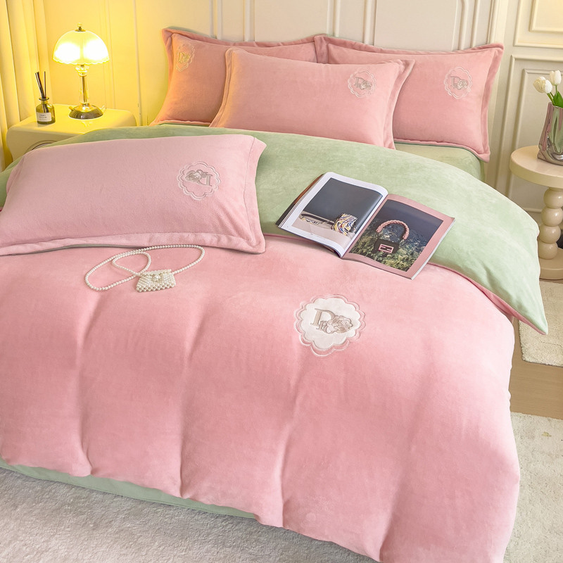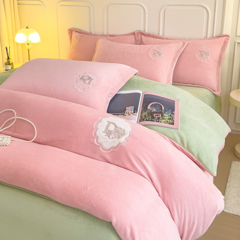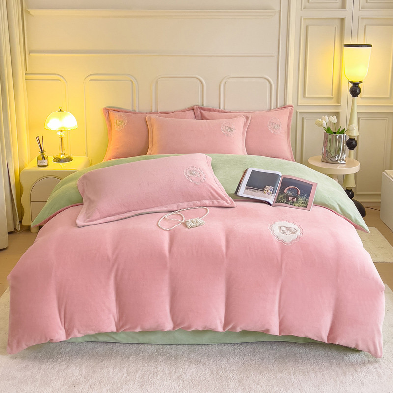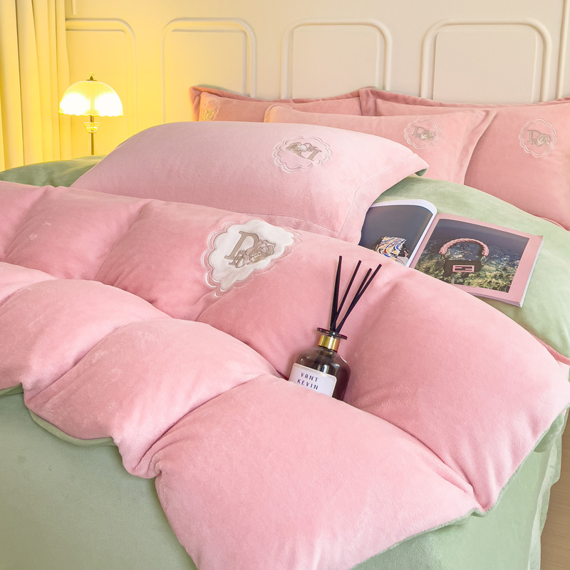 牛奶绒双拼小香风刺绣贴布绣四件套-戴安娜(含买家秀)戴安娜-蜜桃粉