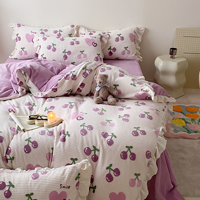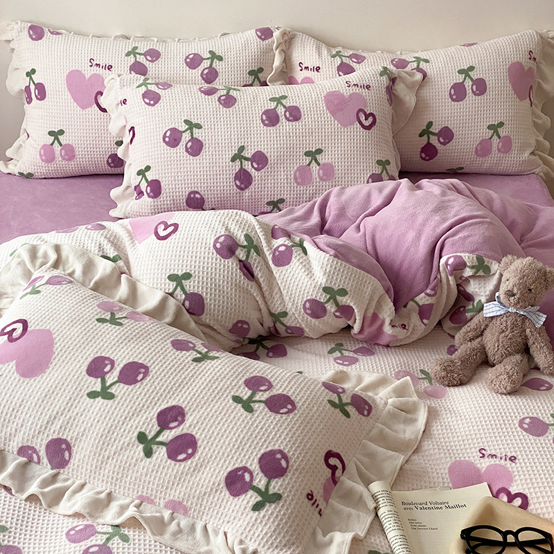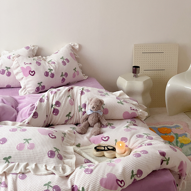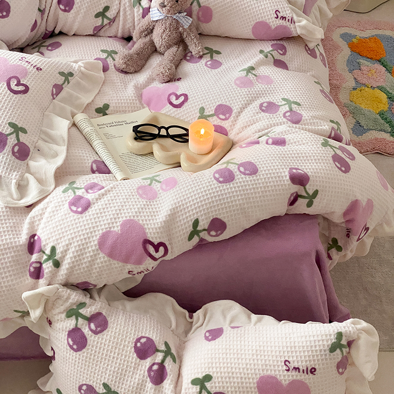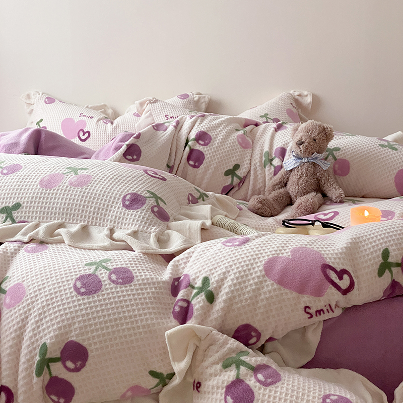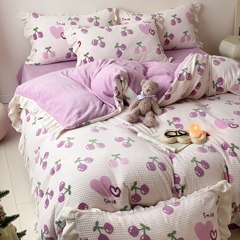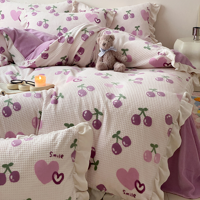 潘朵拉家纺 2023新款雕花韩式华夫格花边牛奶绒四件套 车厘子