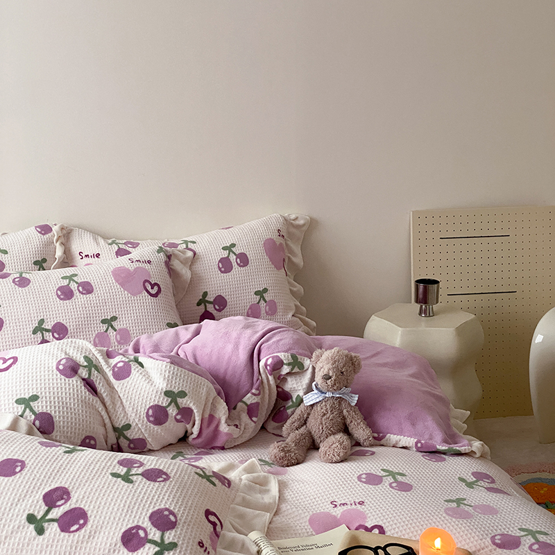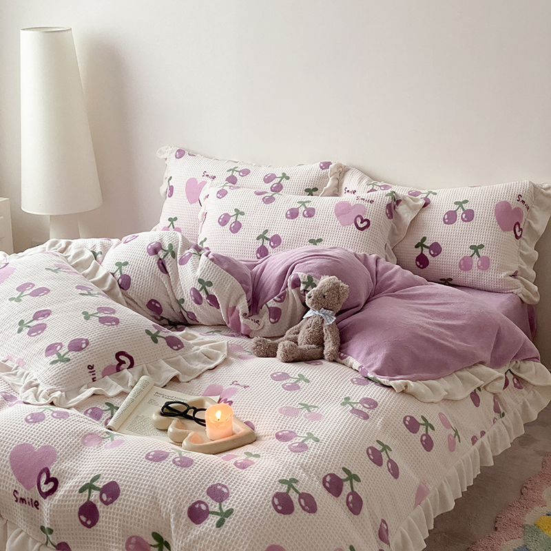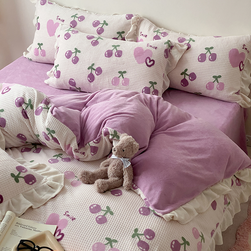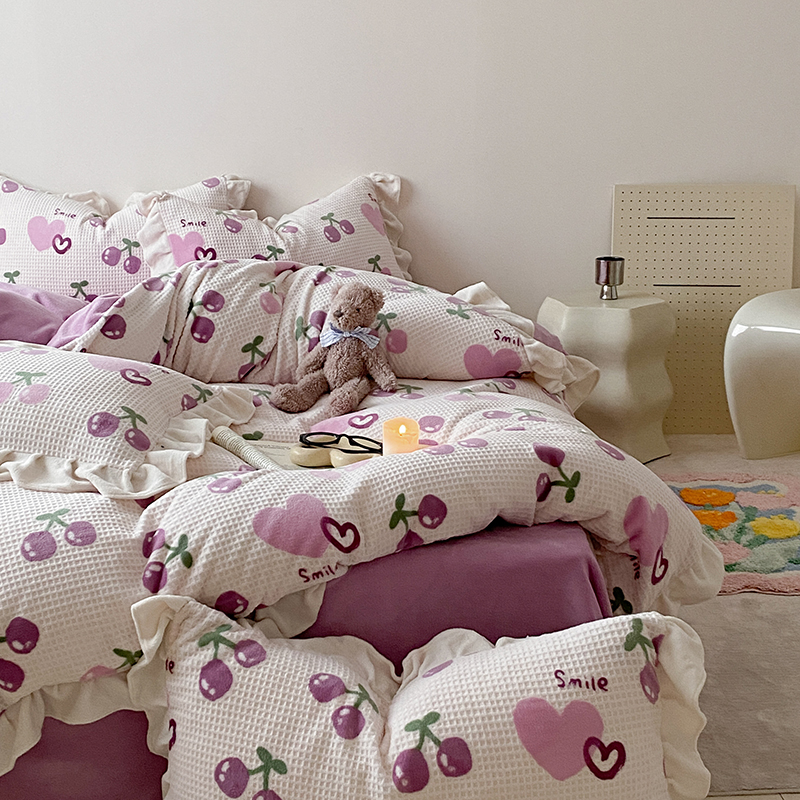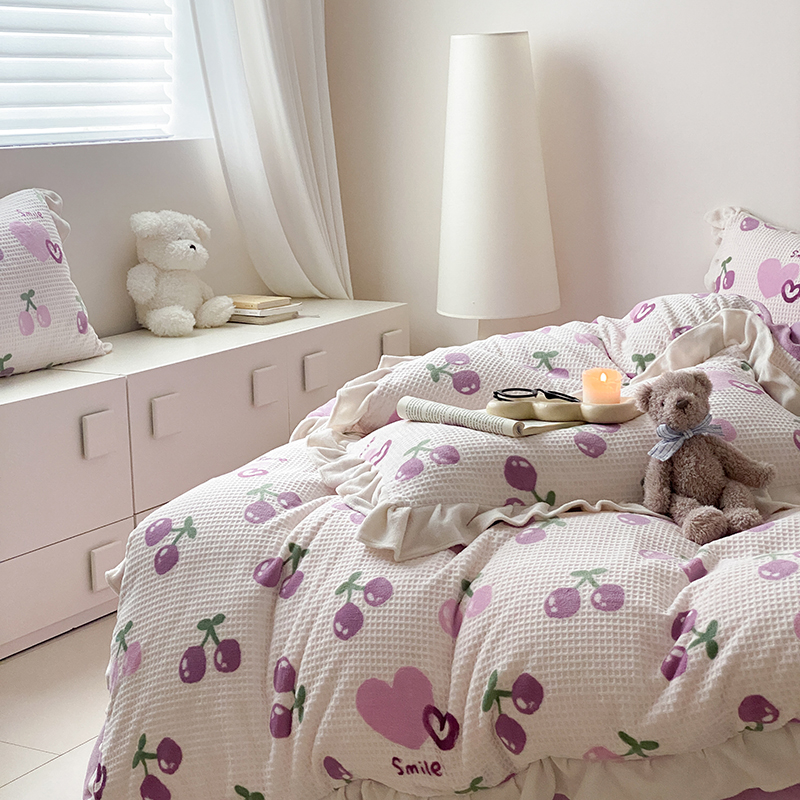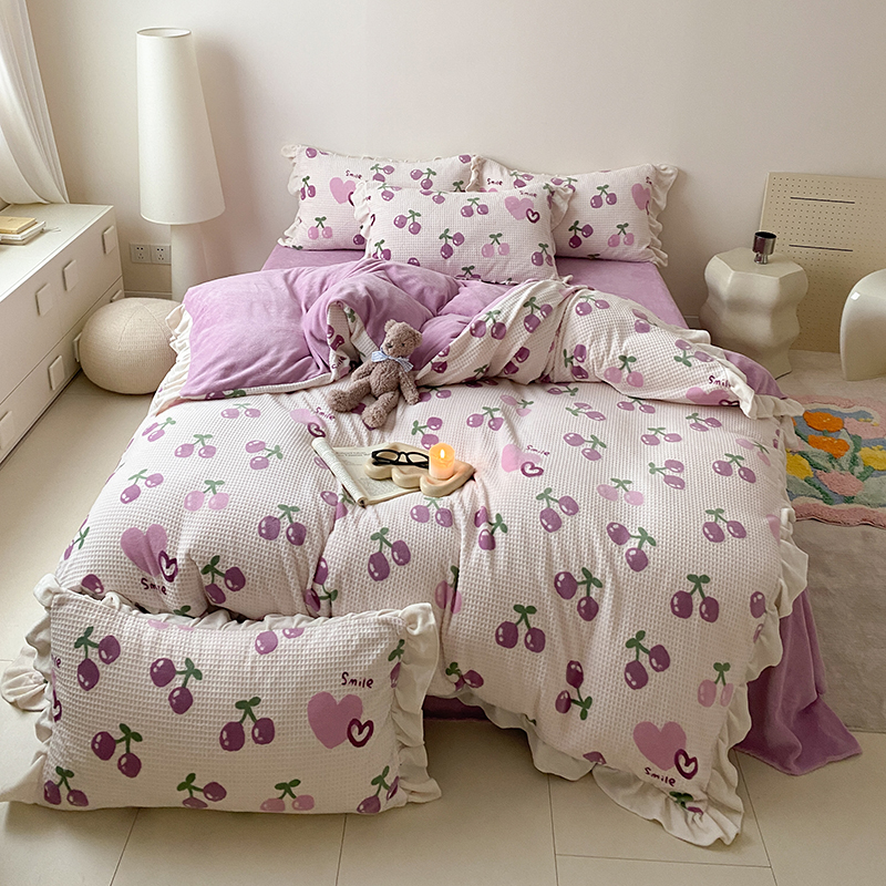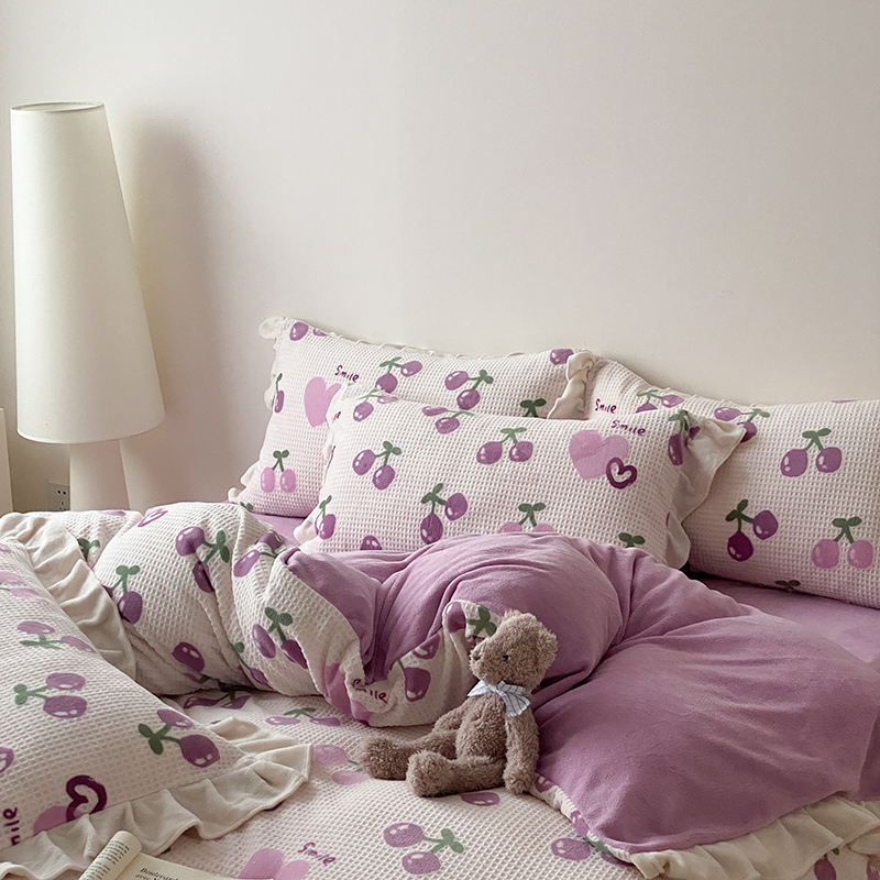 潘朵拉家纺 2023新款雕花韩式华夫格花边牛奶绒四件套 车厘子