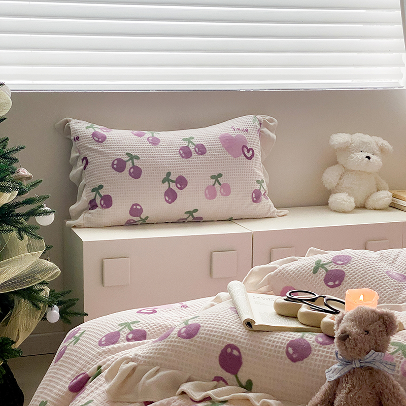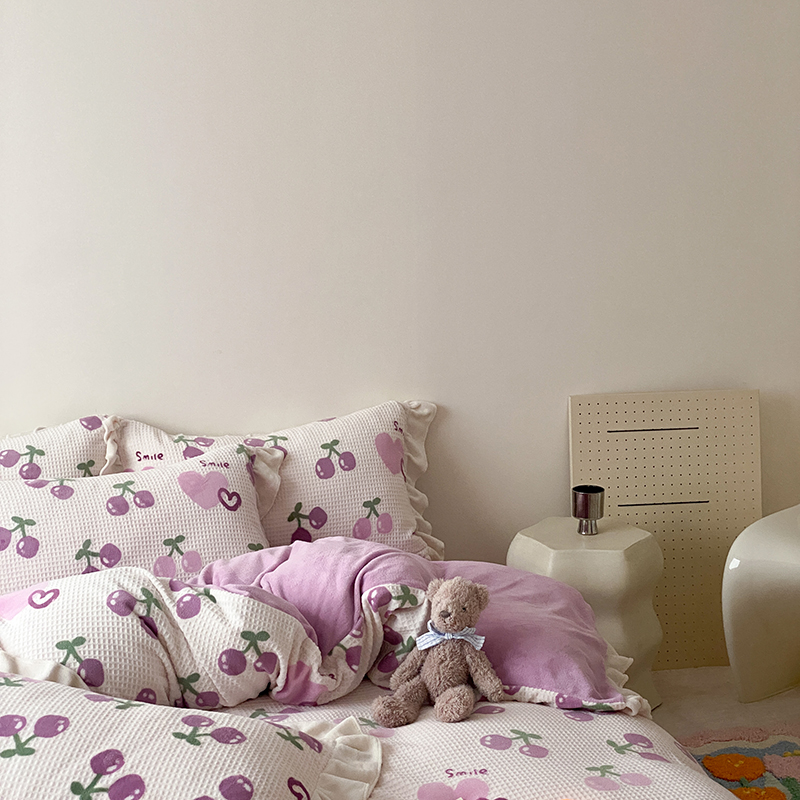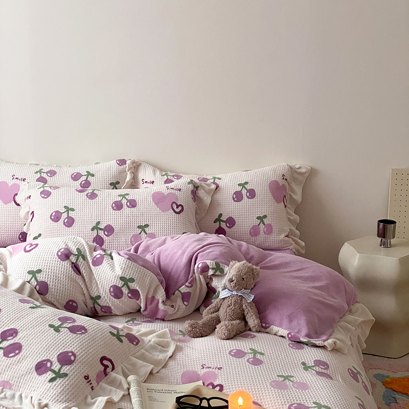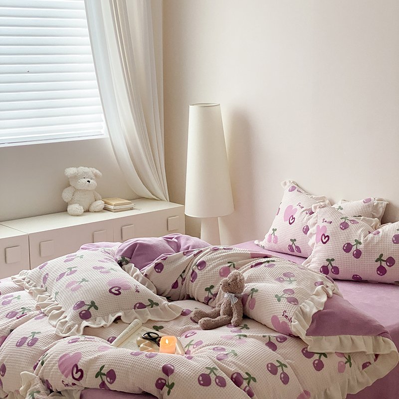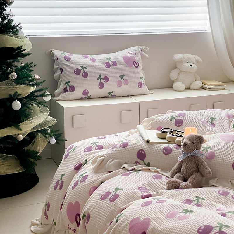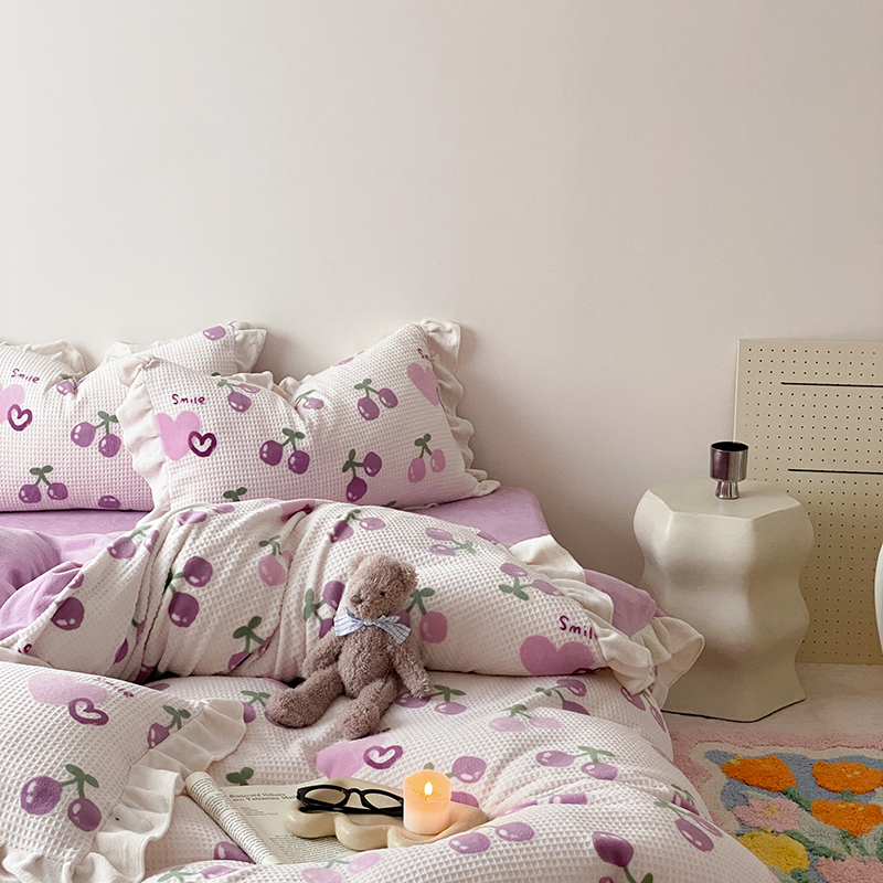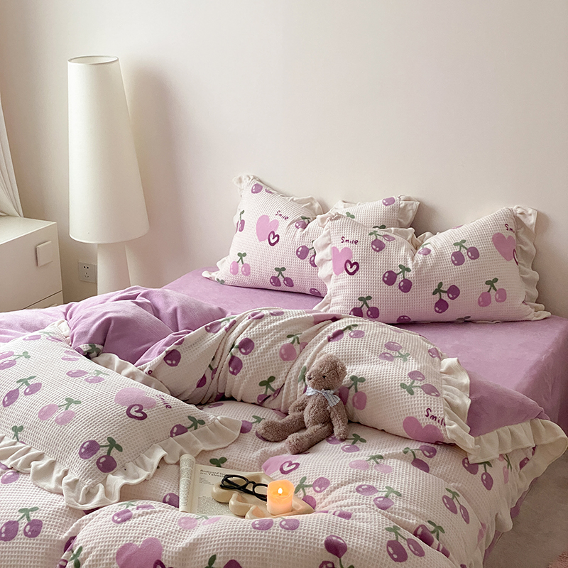 潘朵拉家纺 2023新款雕花韩式华夫格花边牛奶绒四件套 车厘子