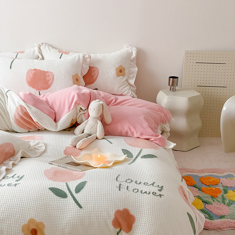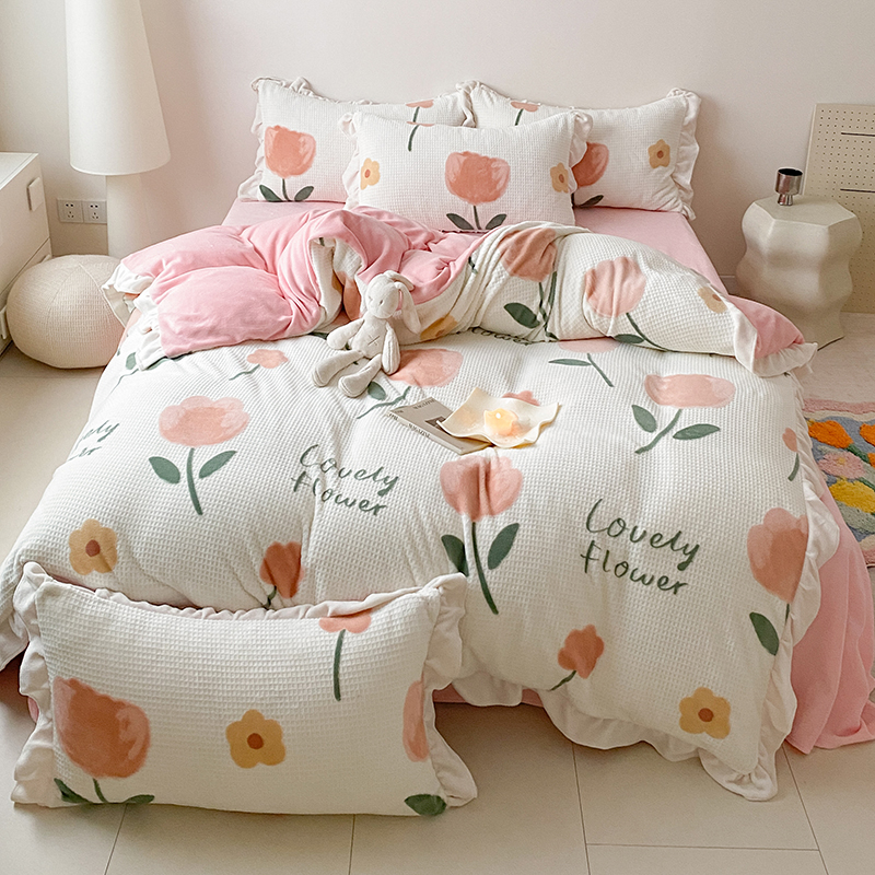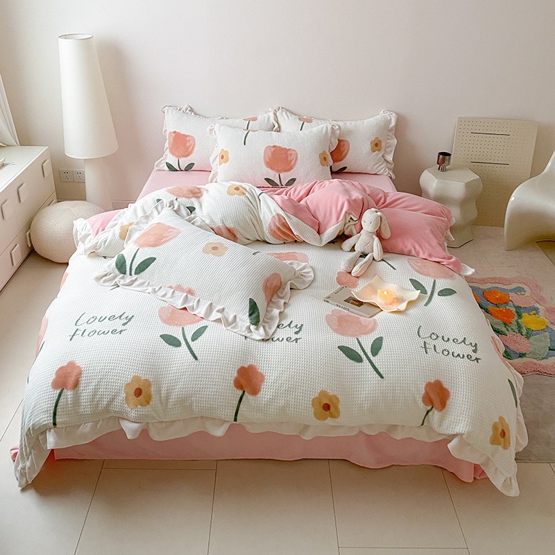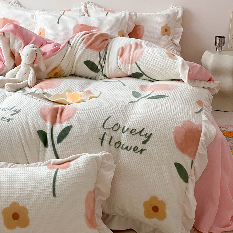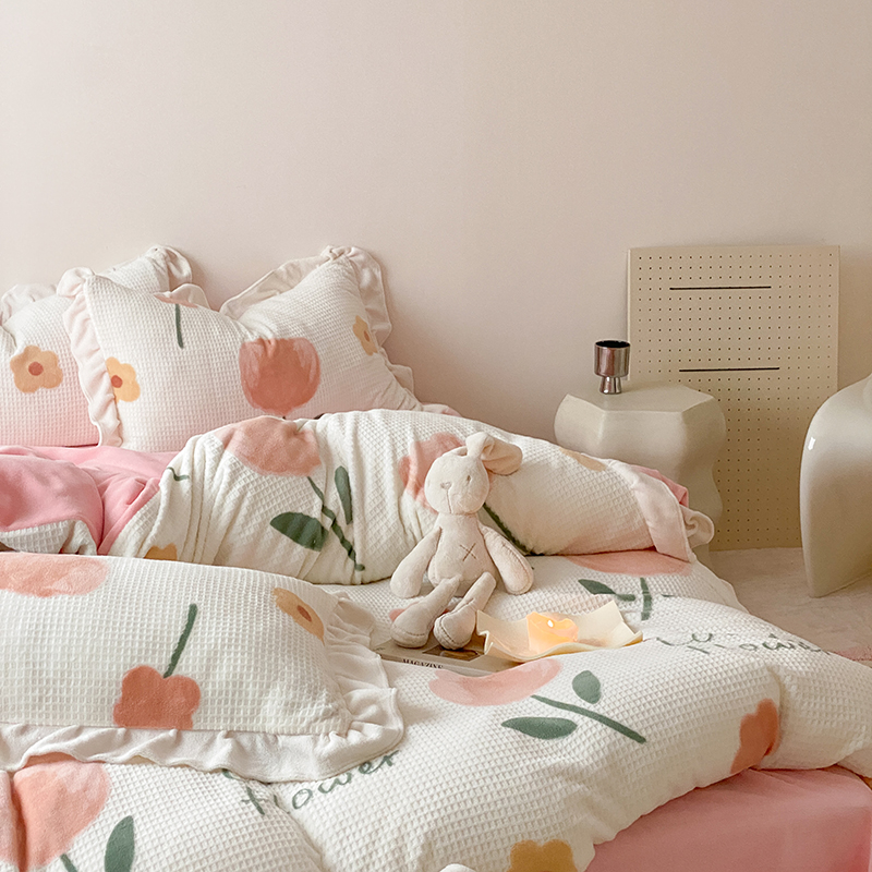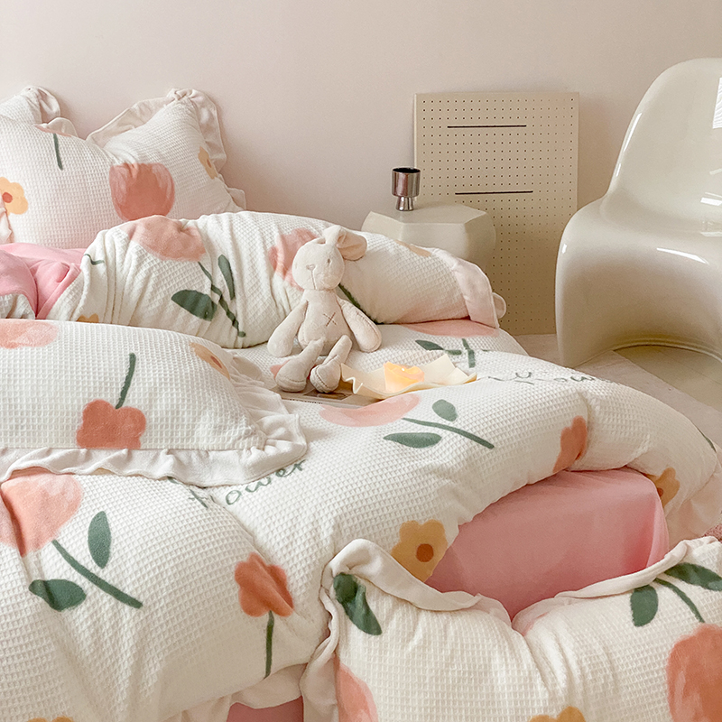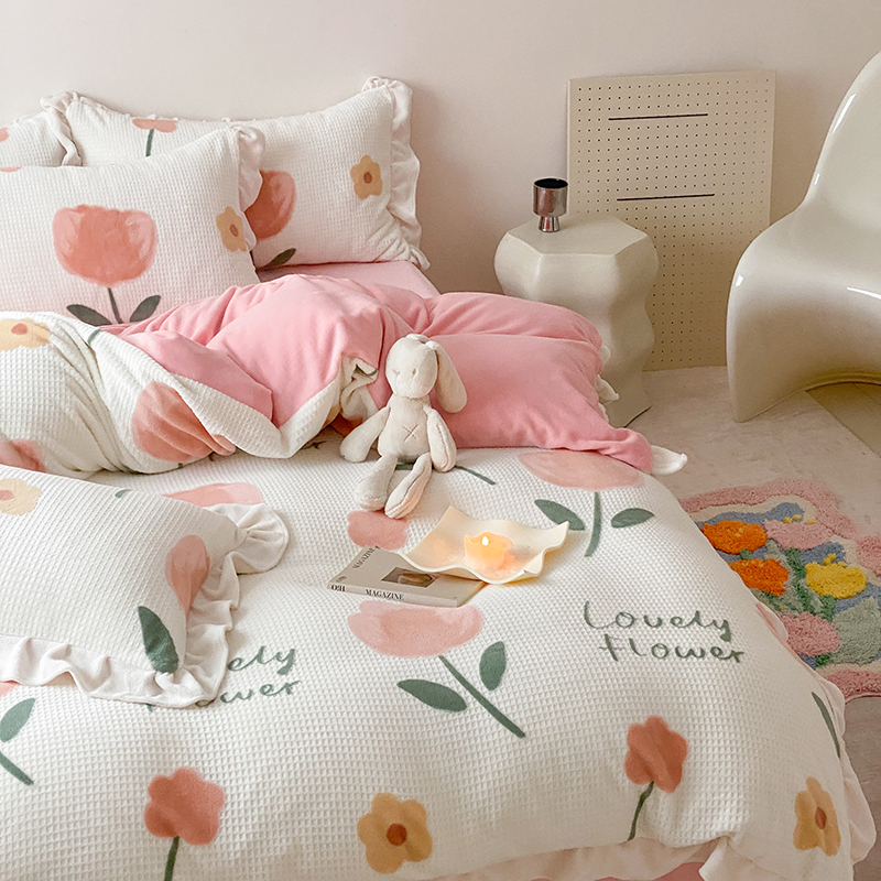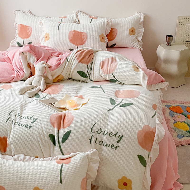 潘朵拉家纺 2023新款雕花韩式华夫格花边牛奶绒四件套 小情调