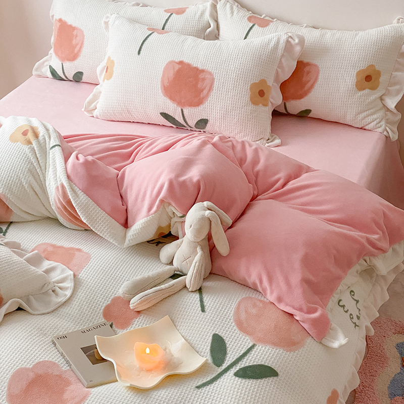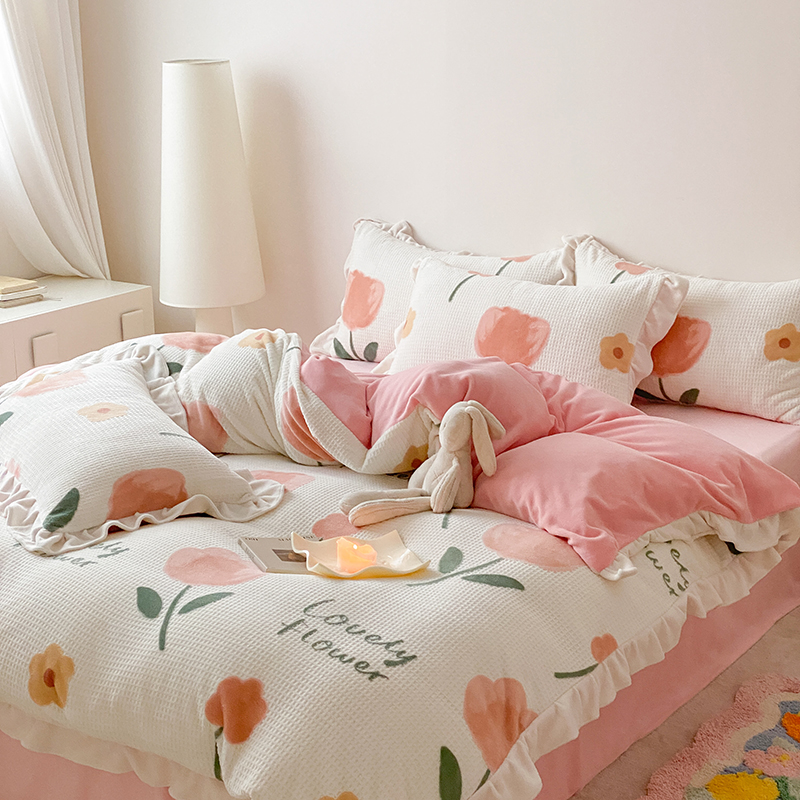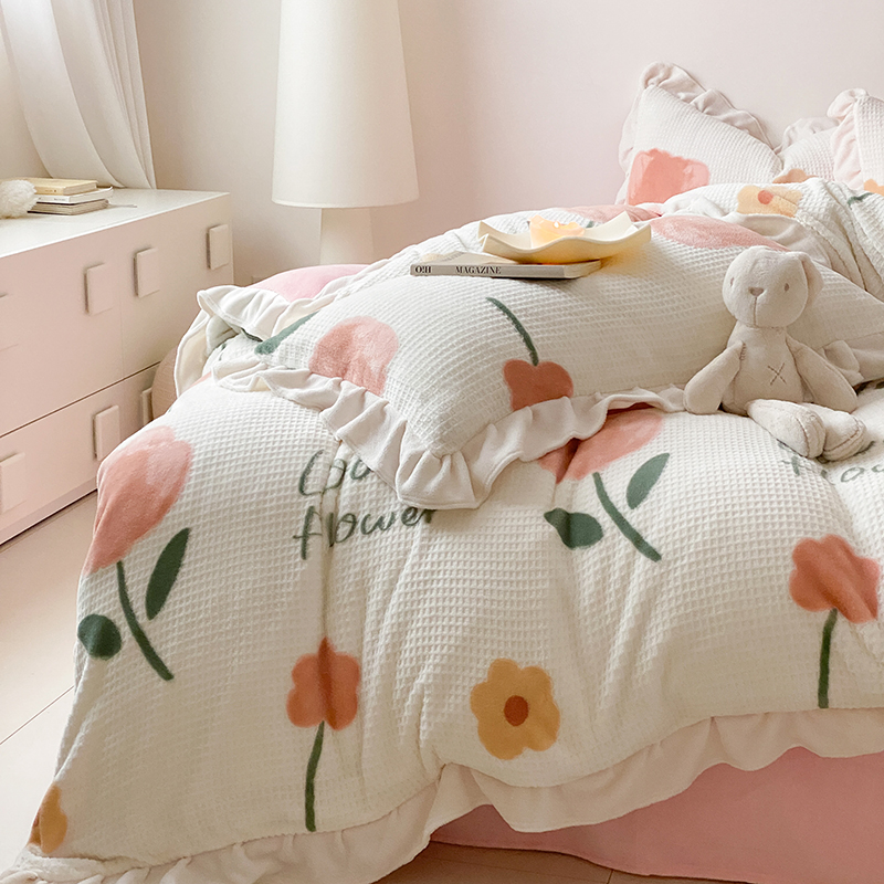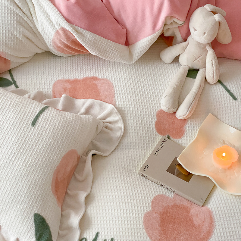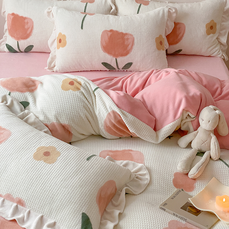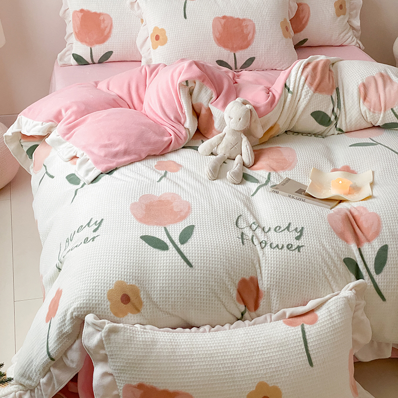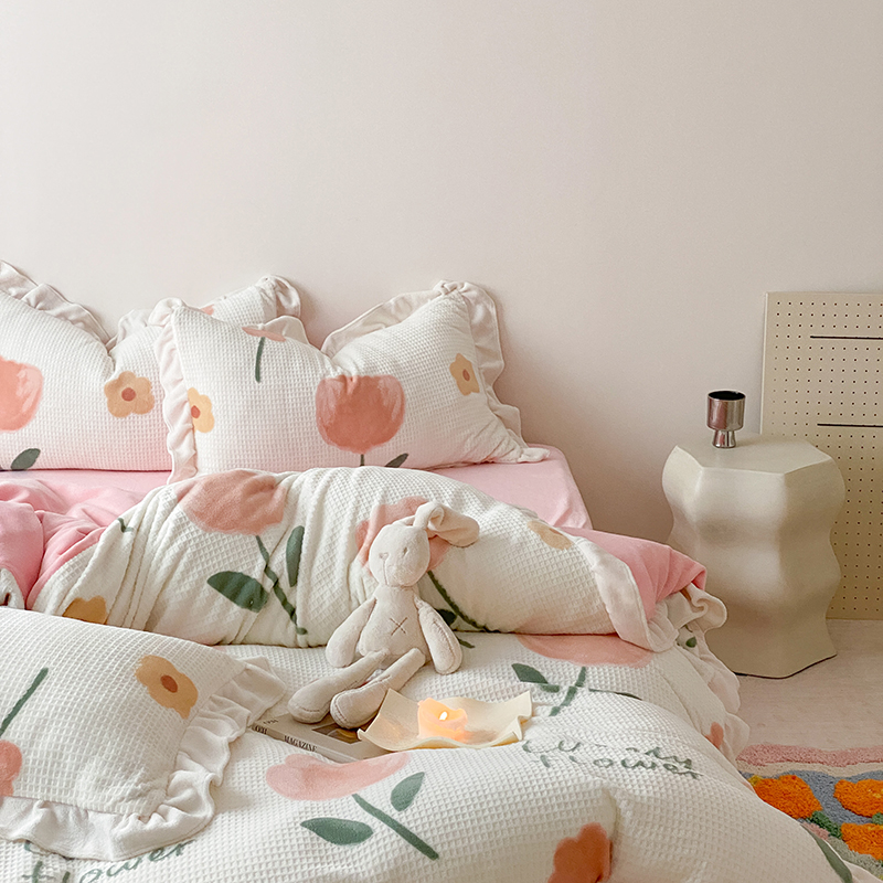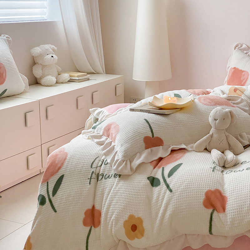潘朵拉家纺 2023新款雕花韩式华夫格花边牛奶绒四件套 小情调