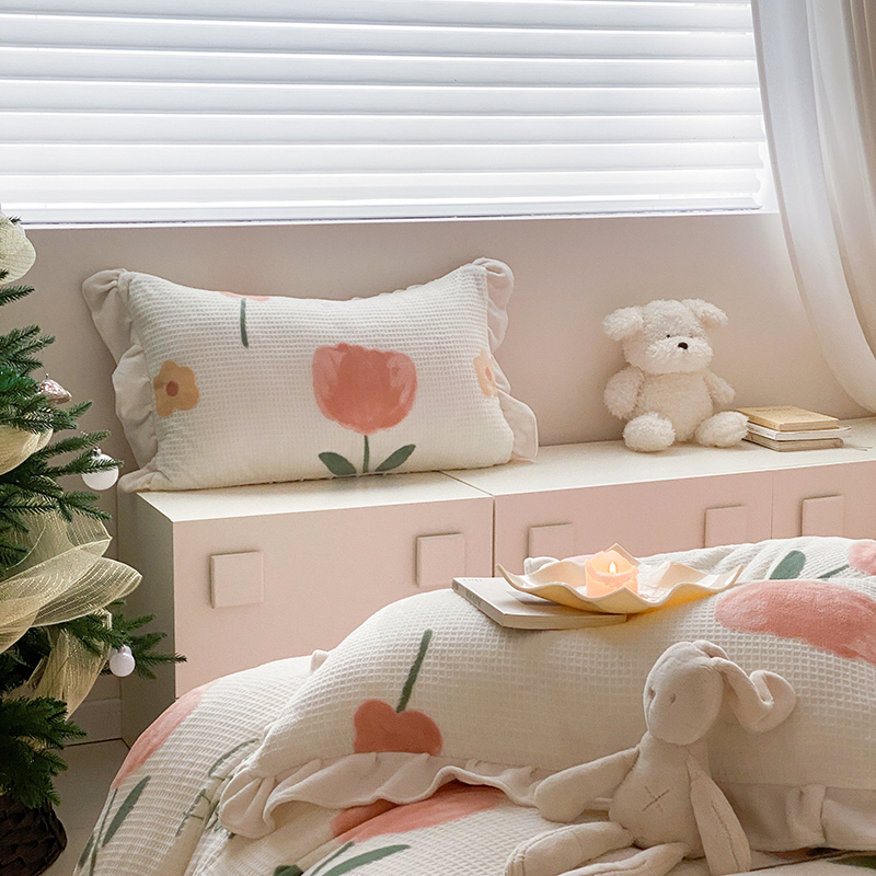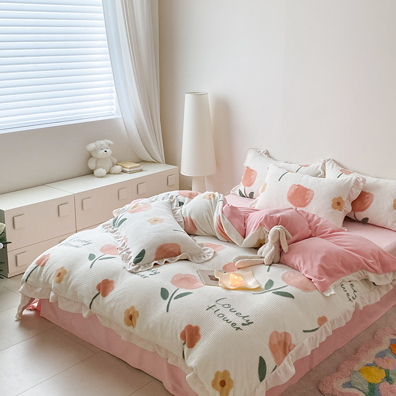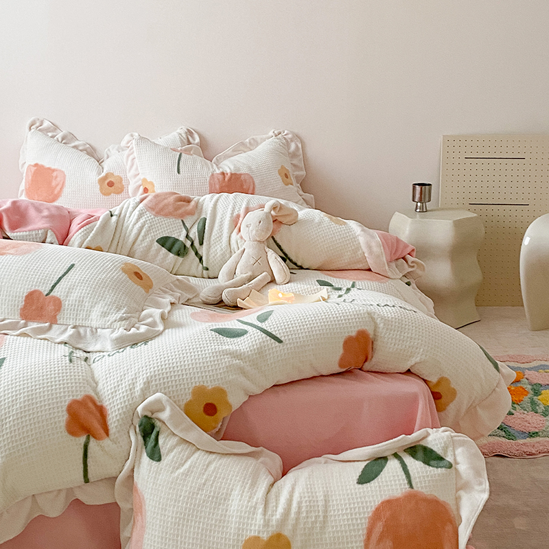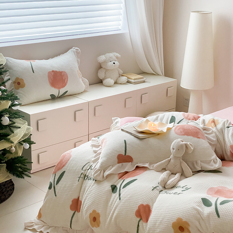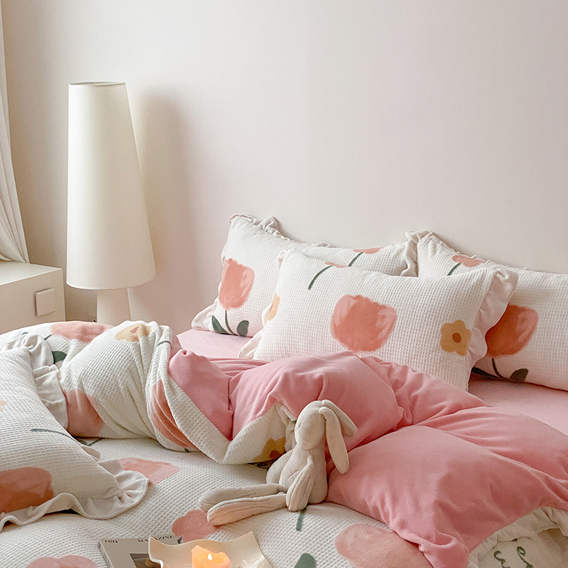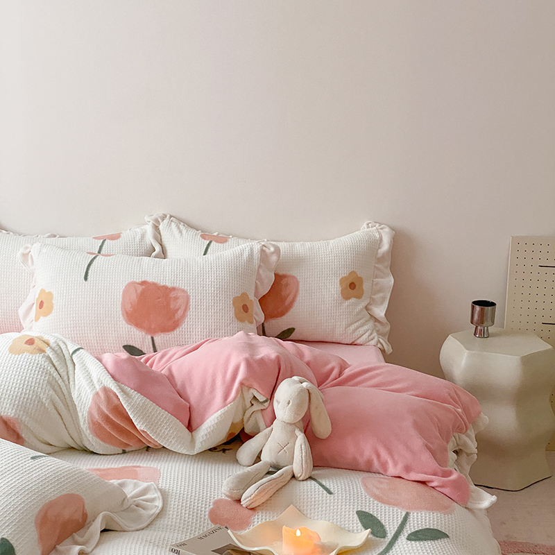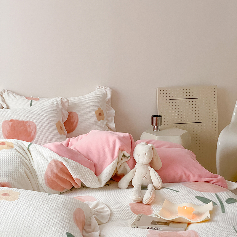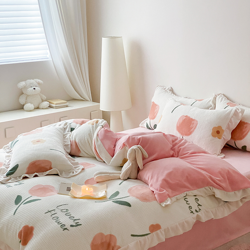 潘朵拉家纺 2023新款雕花韩式华夫格花边牛奶绒四件套 小情调