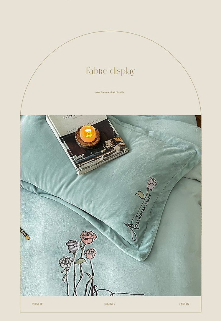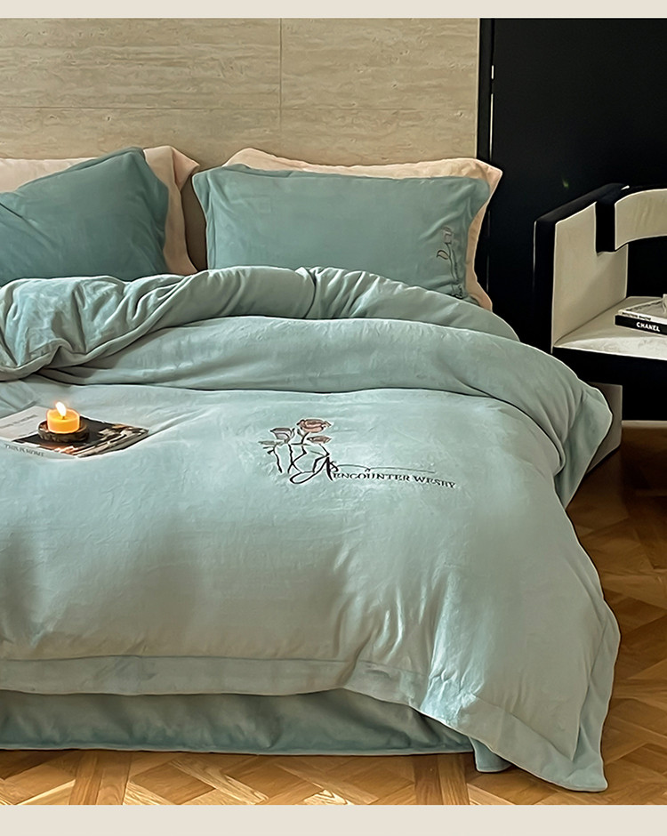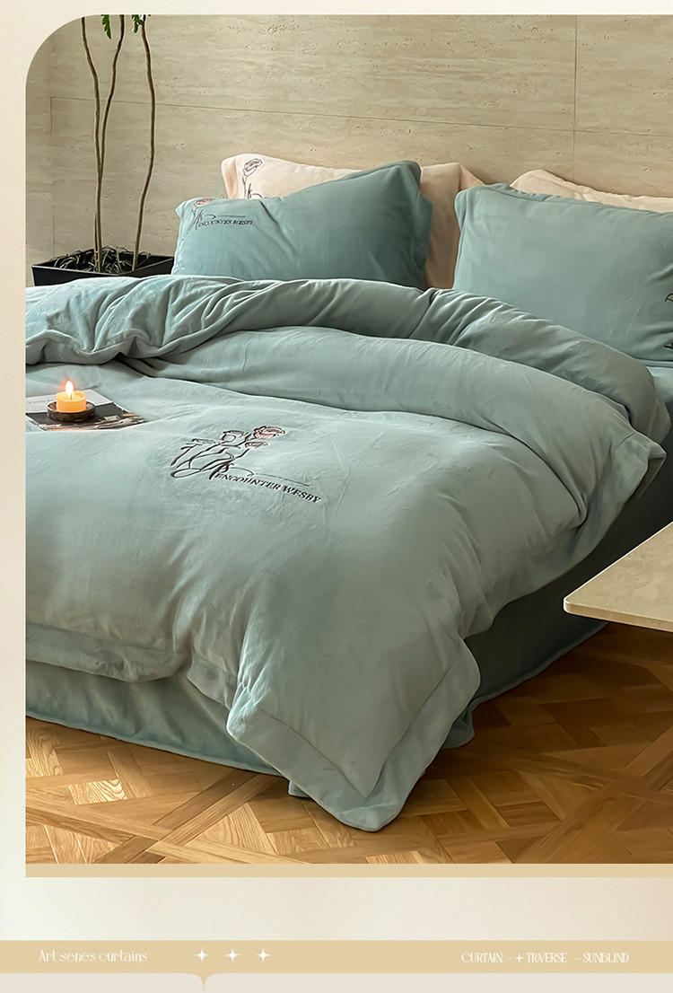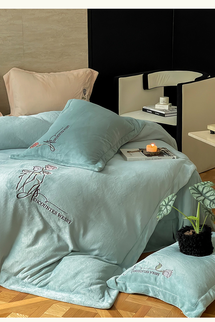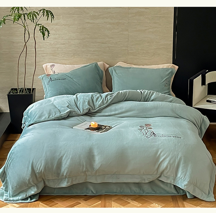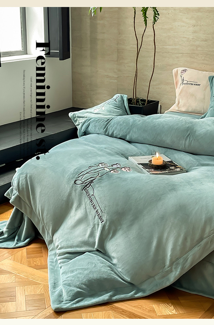名品优仓 2023新款高克重230克牛奶绒绣花款四件套-保加利亚 保加利亚-普鲁士蓝