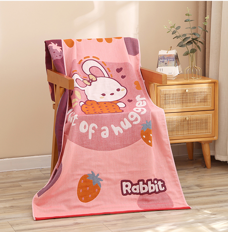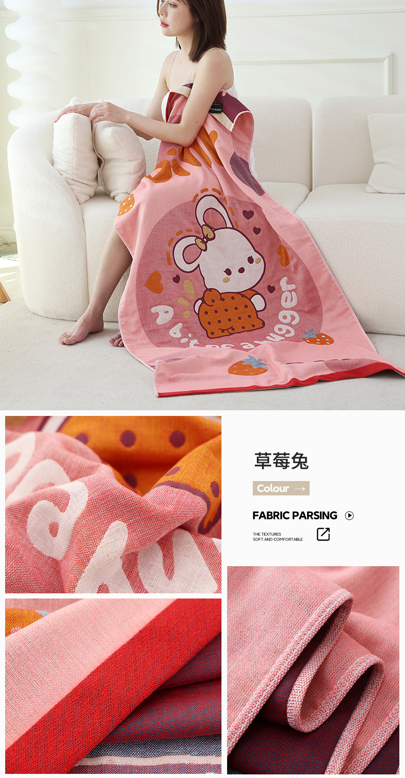 当前位置: 91家纺网 > 商品网购 > 居家日用 > 毛巾/浴巾/浴袍 > 浴巾 > 朴尔家纺-毛巾被 2023新款加大浴巾纯棉四层纱布家用男女柔软不掉毛通用成人全棉洗澡大裹巾儿童卡通 80*160cm草莓兔