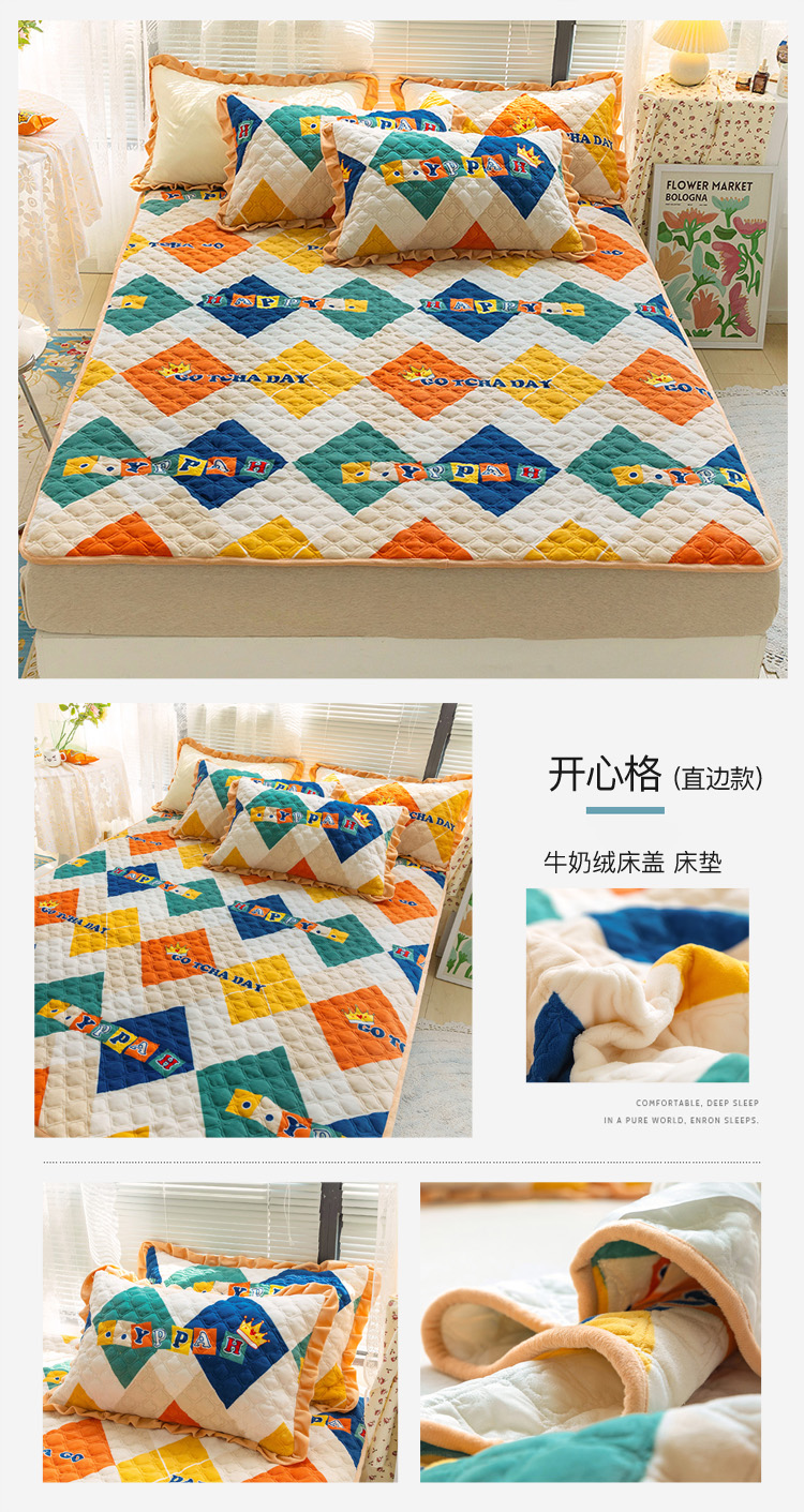 羽爱家纺 2024新款牛奶绒直边款床盖床垫 开心格