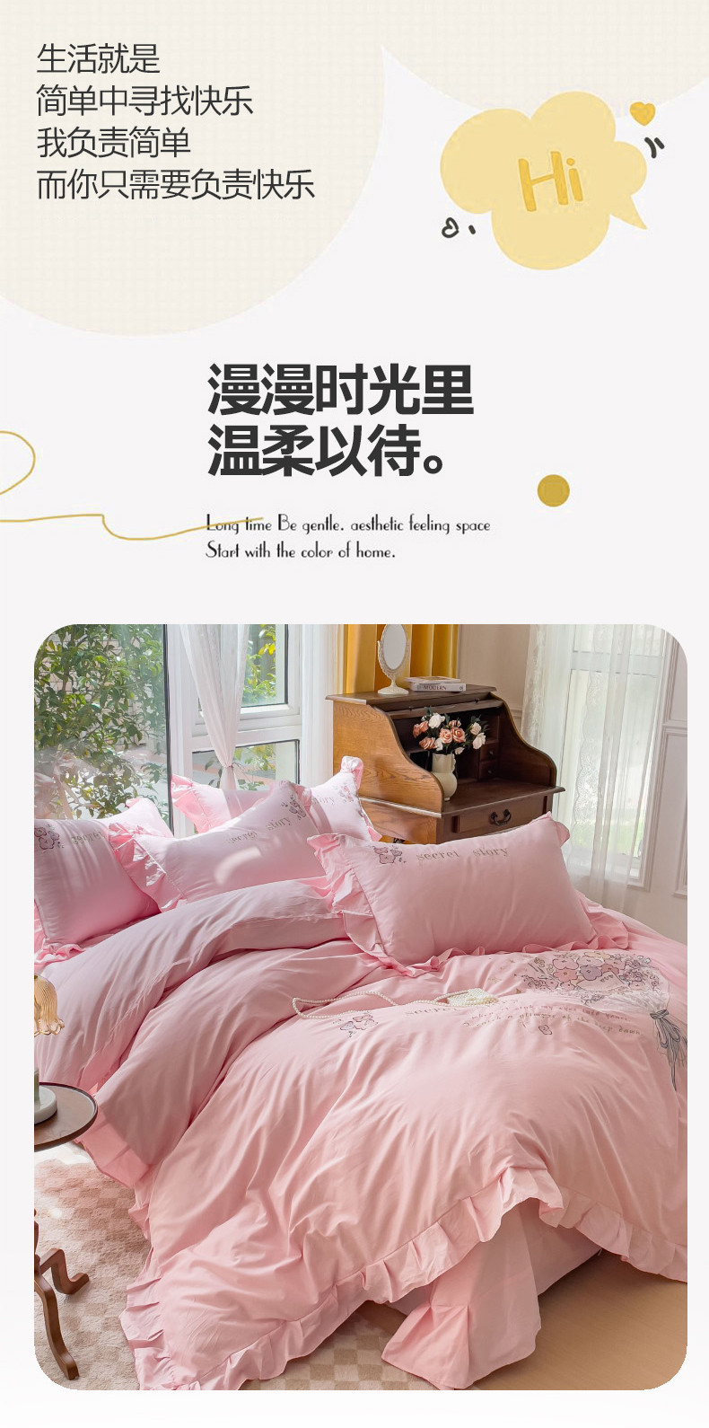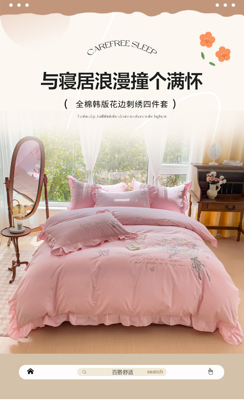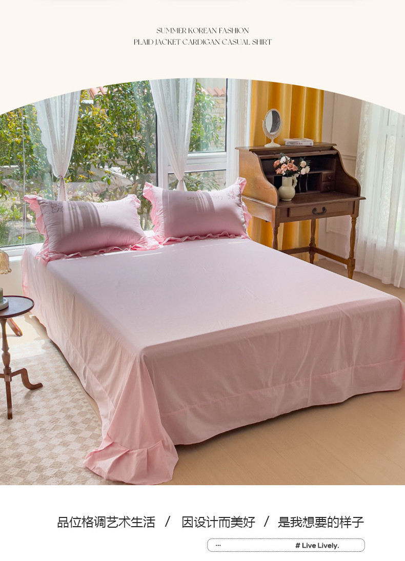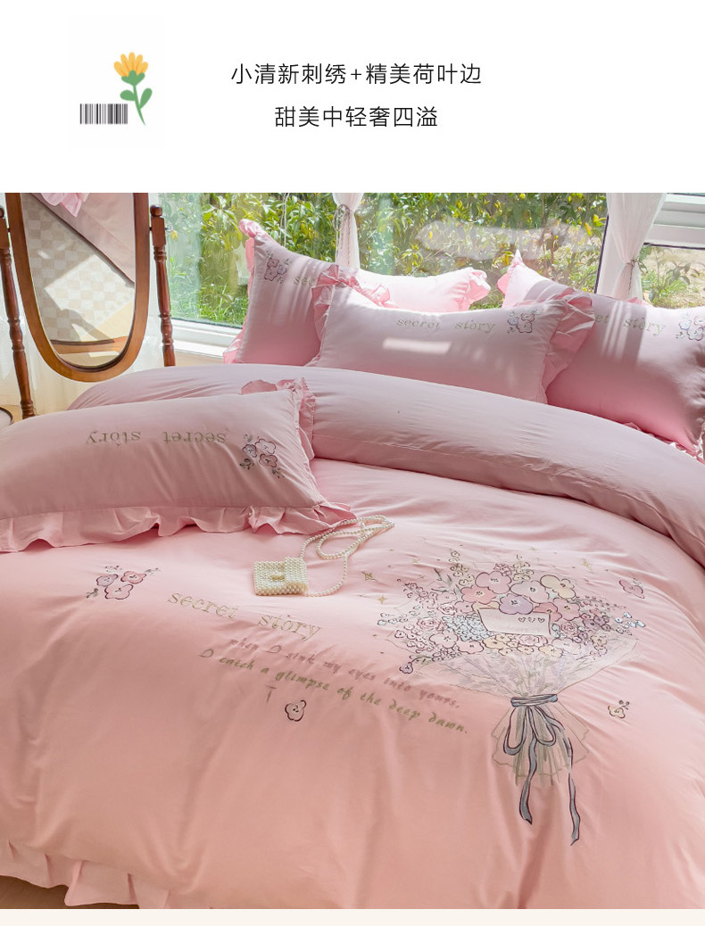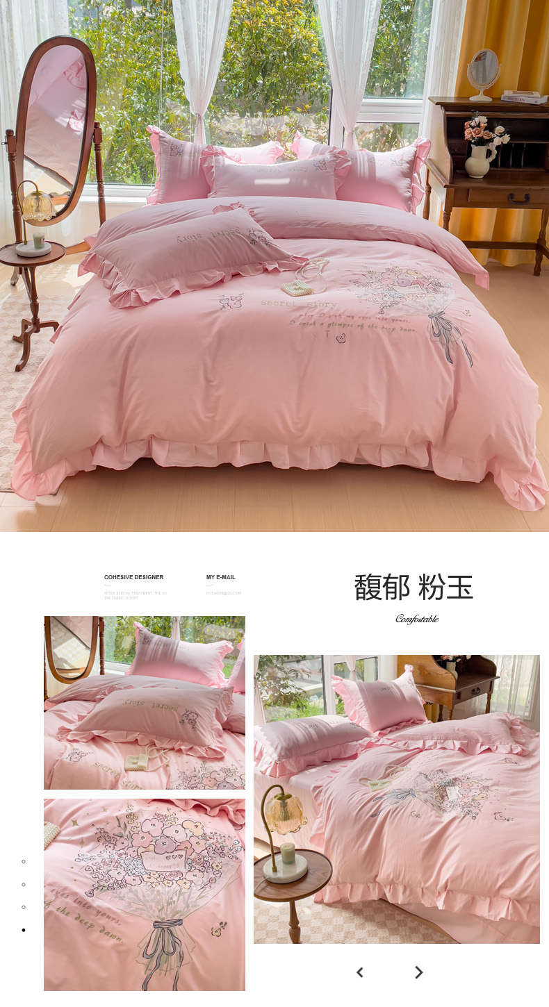 星尚家纺 2024新款全棉水洗棉韩版花边绣花纯棉四件套-馥郁 粉玉