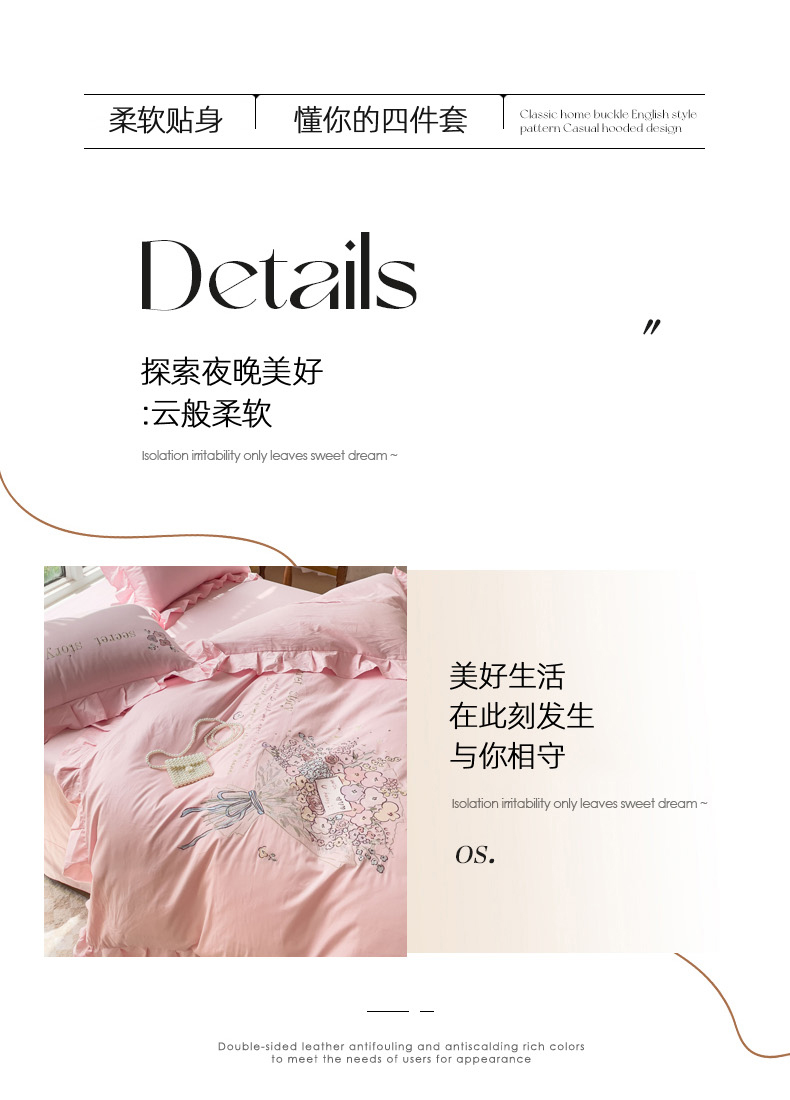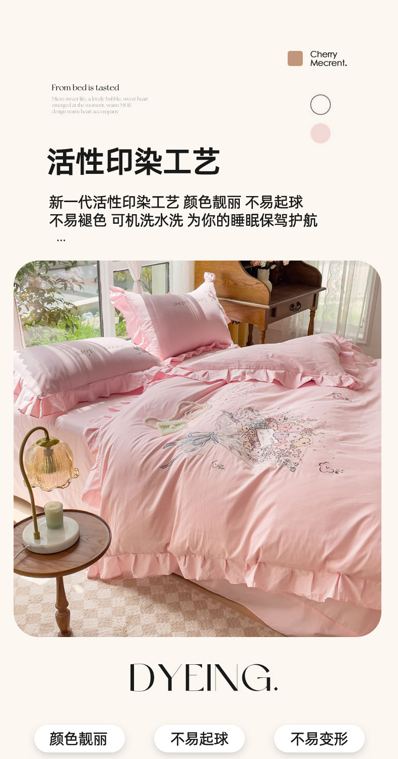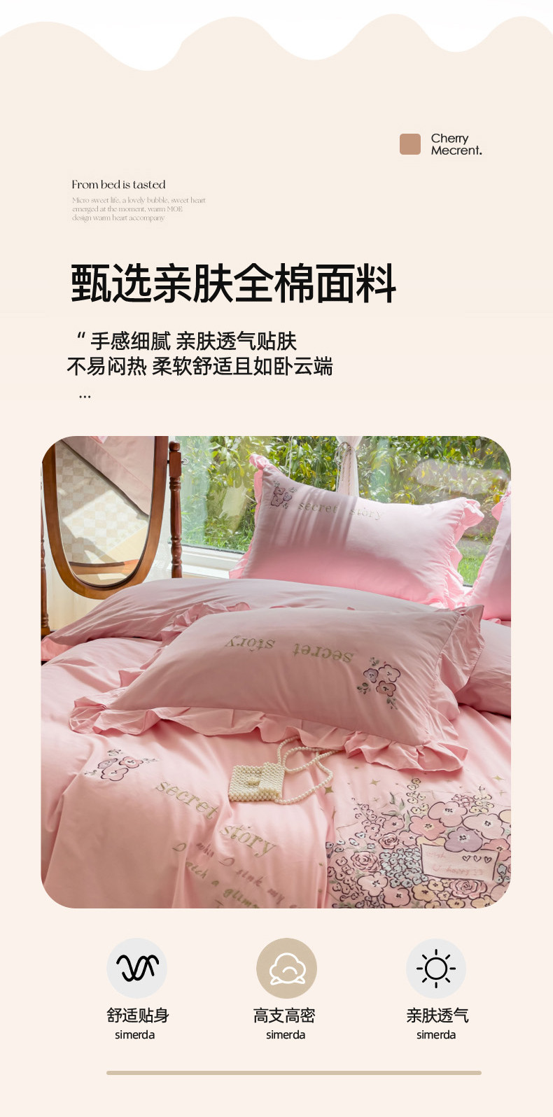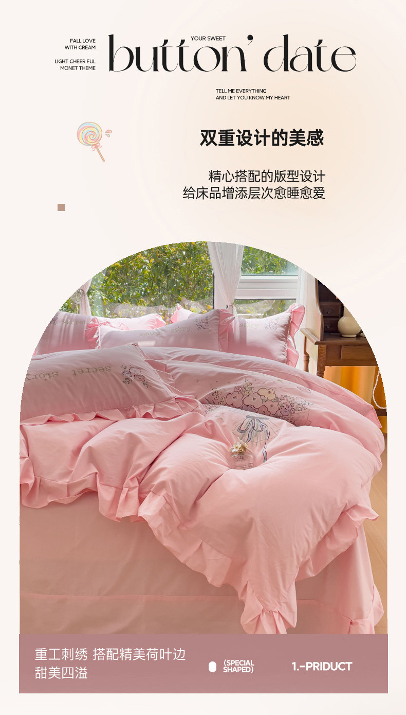 星尚家纺 2024新款全棉水洗棉韩版花边绣花纯棉四件套-馥郁 粉玉