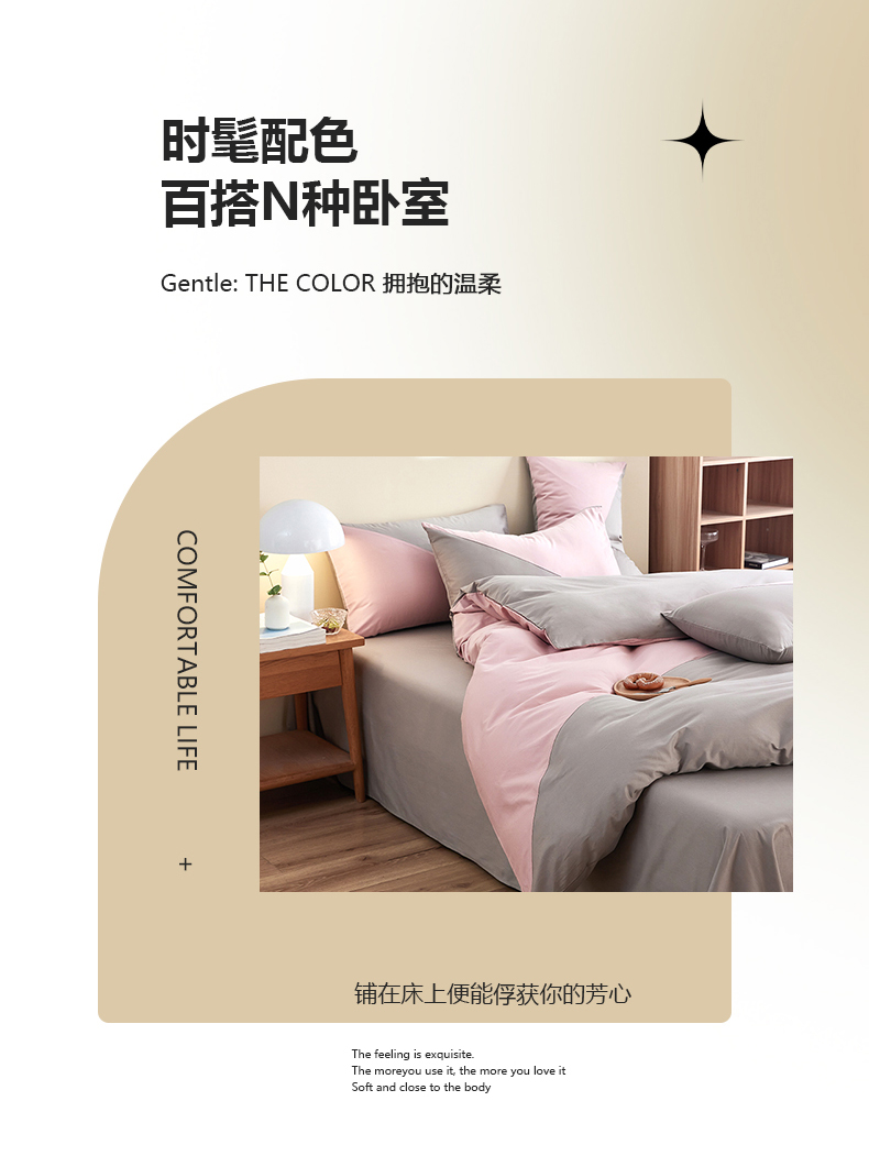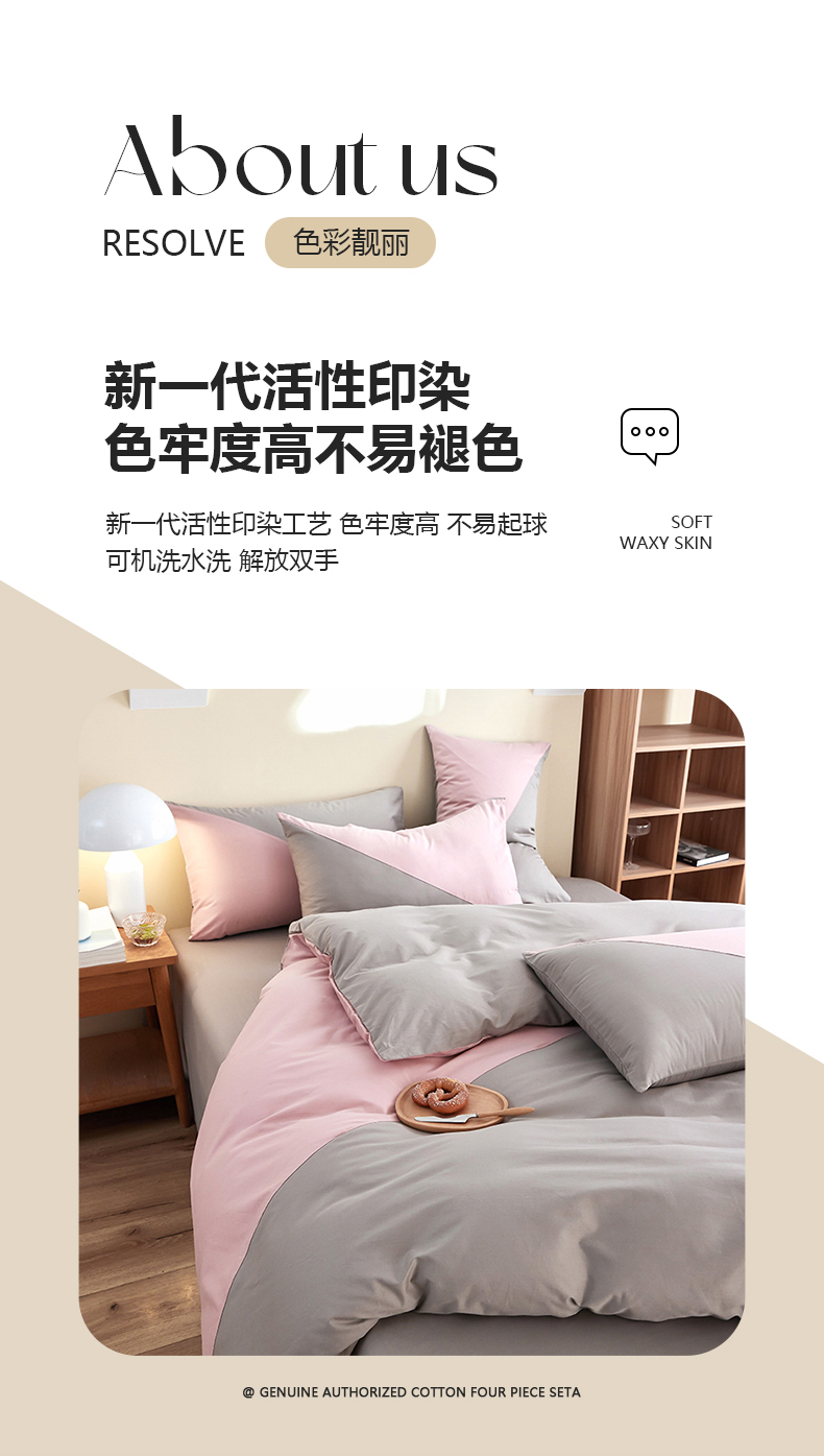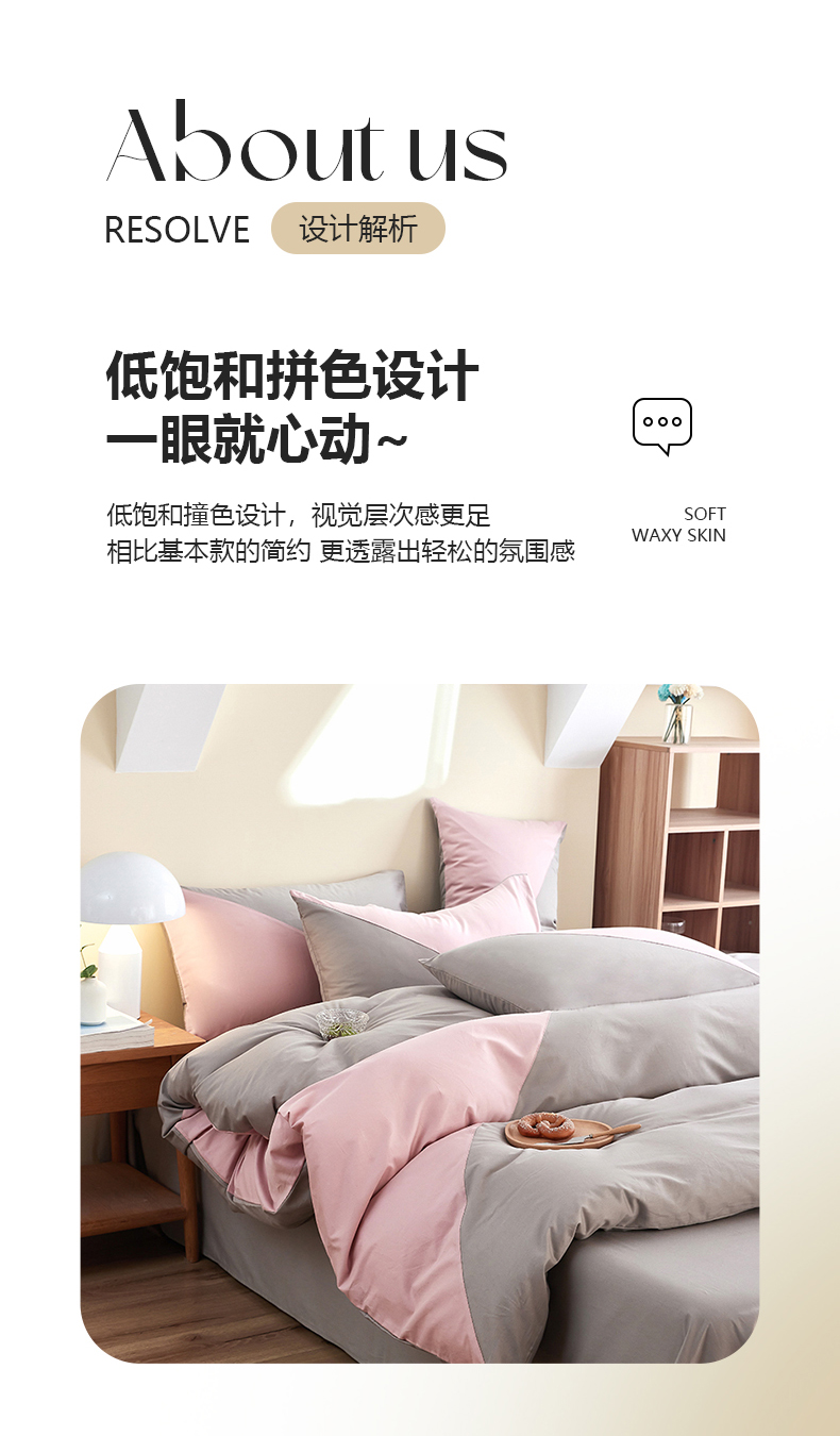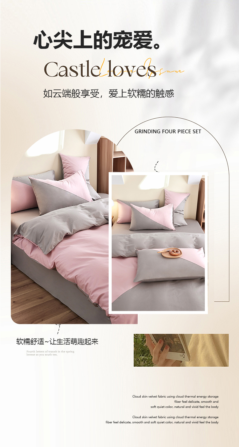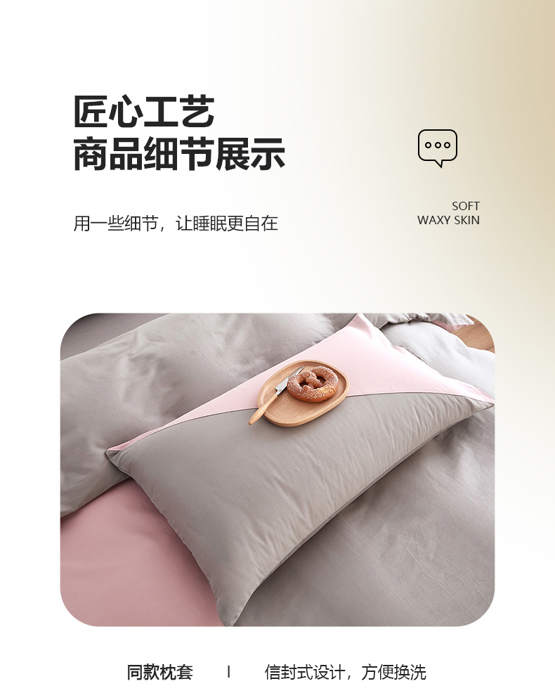 商品名称:慕希家纺 2024新款40S全棉喷气13372简约三角拼四件套 简约-浅粉灰