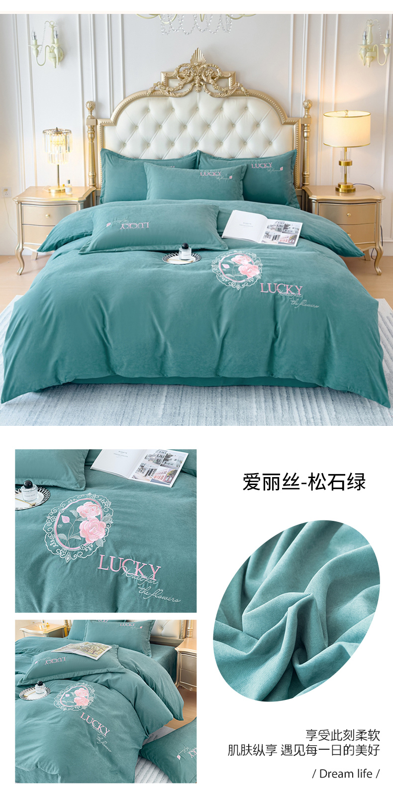 (总)逸林家纺《原希尔顿逸林》 2025新款法式蕾丝花边牛奶绒四件套韩版花边加厚牛奶绒四件套,倾城-草绿,倾城-豆沙,倾城-奶黄,倾城-少女粉,倾城-天蓝,倾城-紫