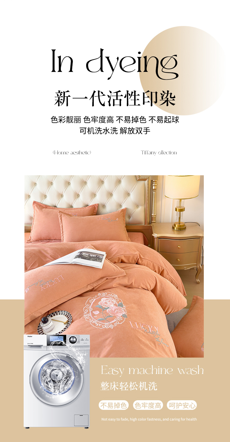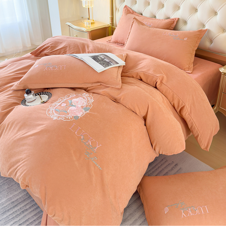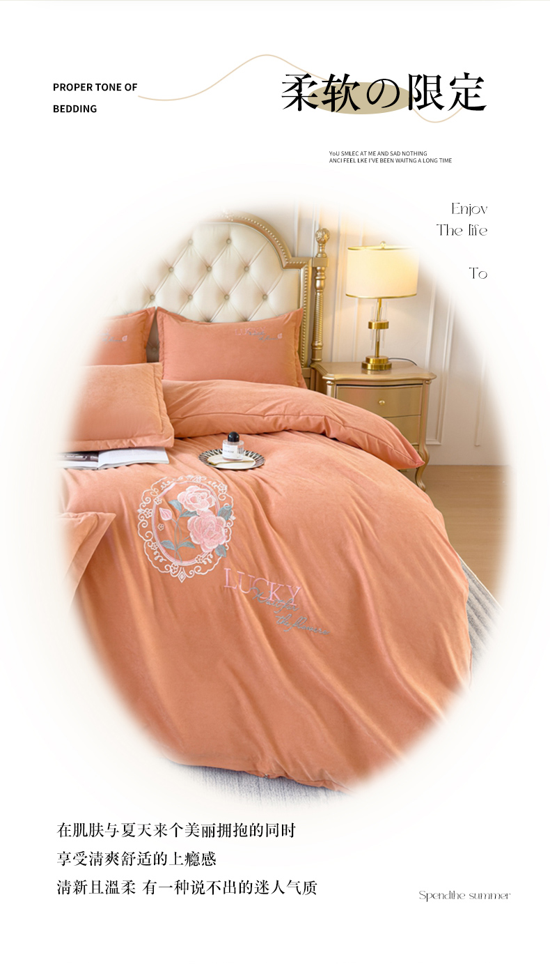 (总)逸林家纺《原希尔顿逸林》 2024新款斜纹磨毛四件套水洗斜纹棉蛋白棉绣花四件套 爱丽丝系列,爱丽丝-艾玛橙,爱丽丝-宾利蓝,爱丽丝-豆沙粉,爱丽丝-高级灰,爱丽丝-松石绿,爱丽丝-香槟色