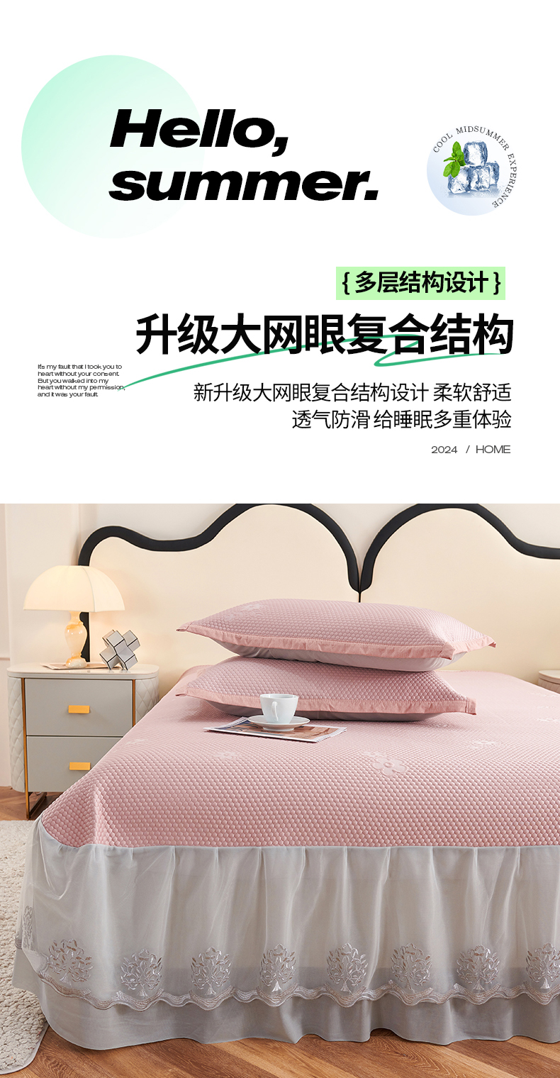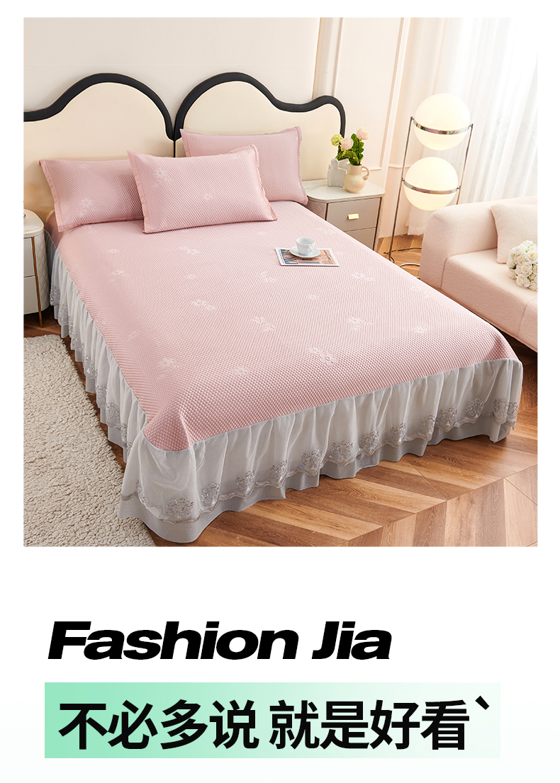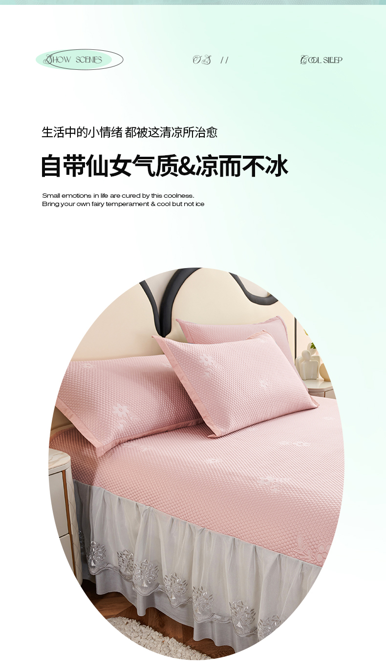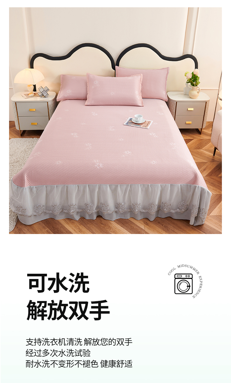商品名称:宜派家纺 2024新款雪花冷感席三件套床单式床裙款 樱花-粉