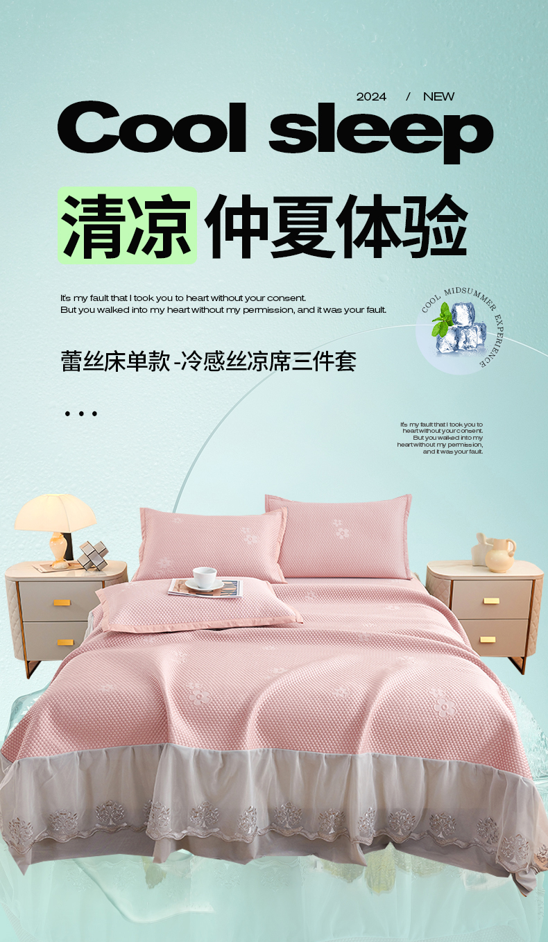 宜派家纺 2024新款雪花冷感席三件套床单式床裙款 樱花-粉