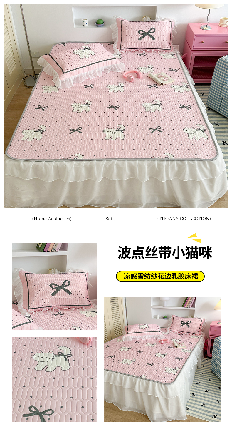昔可 新款床裙款乳胶凉席双层雪纺纱乳胶凉席三件套 波点丝带小猫咪