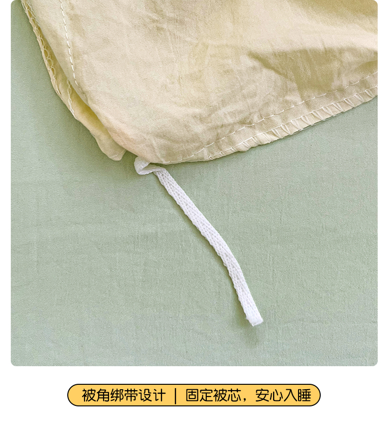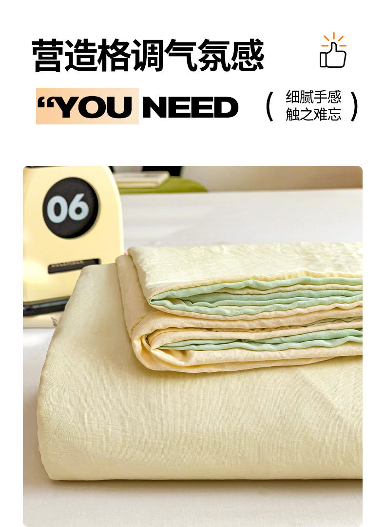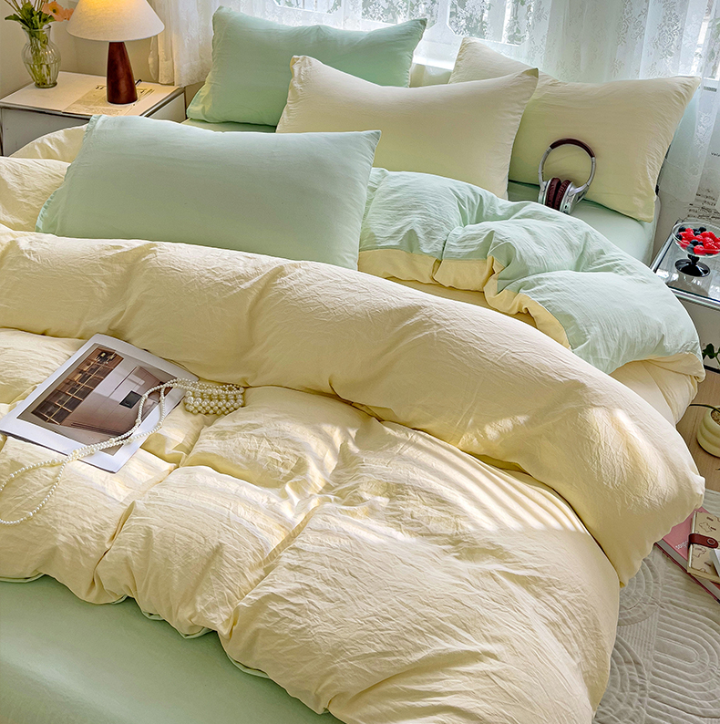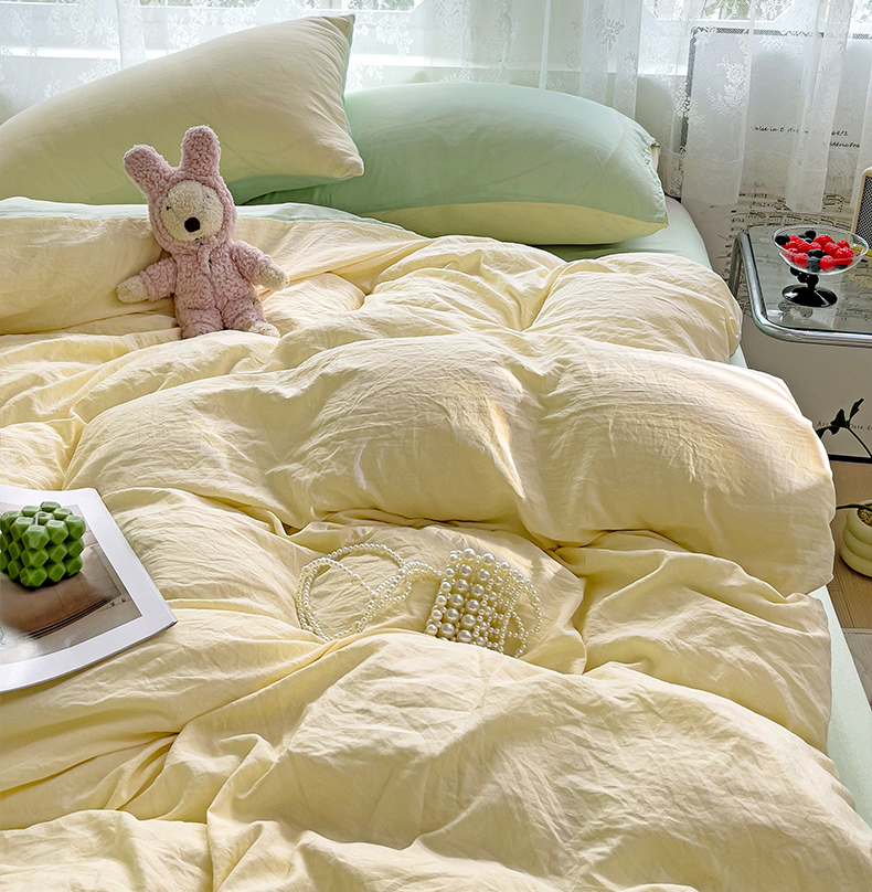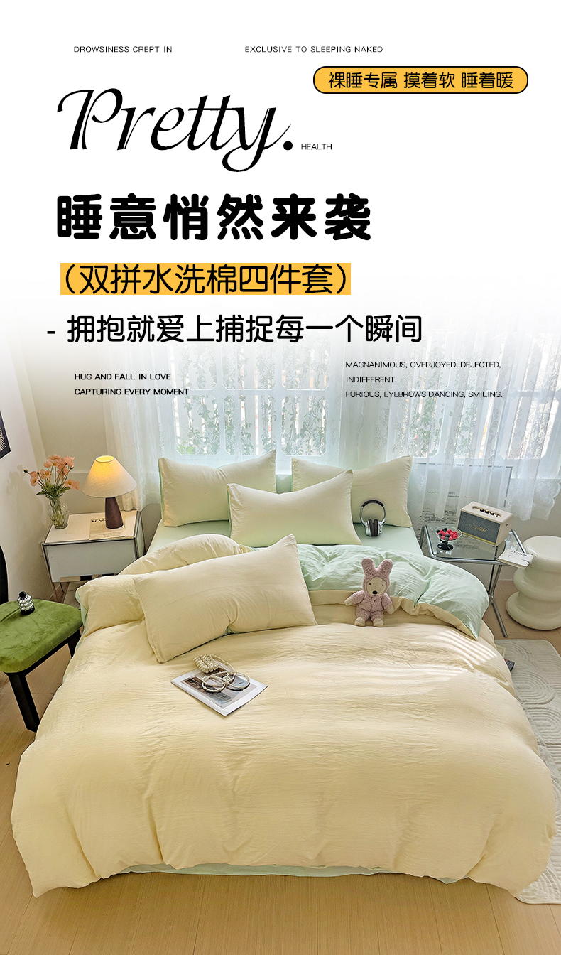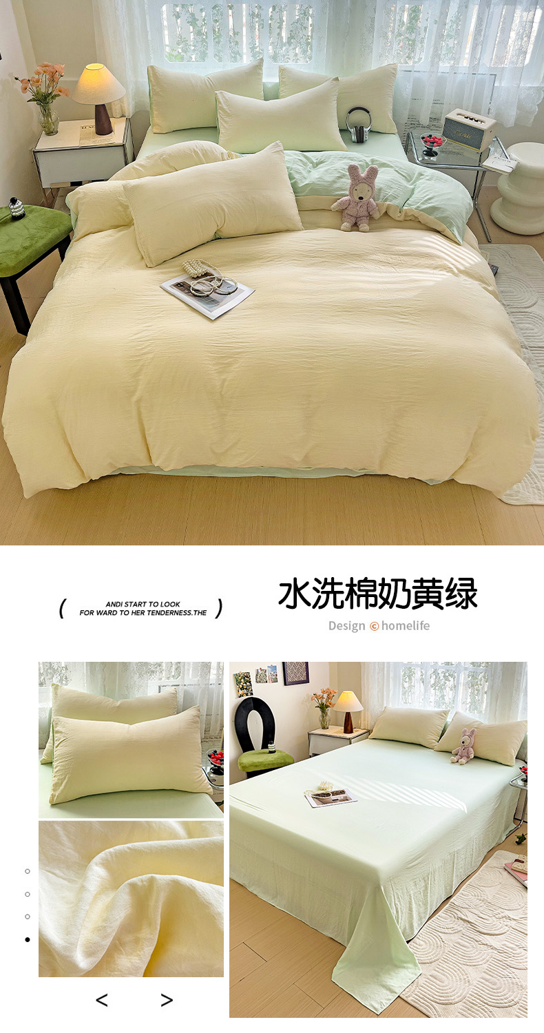 当前位置: 91家纺网 > 商品网购 > 床品套件 > 四件套 > 水洗棉四件套 > 韩巢家纺 2024新款ins风超柔褶皱亲肤水洗棉四件套 -纯色双拼系列(提供卖家秀) 水洗棉奶黄绿