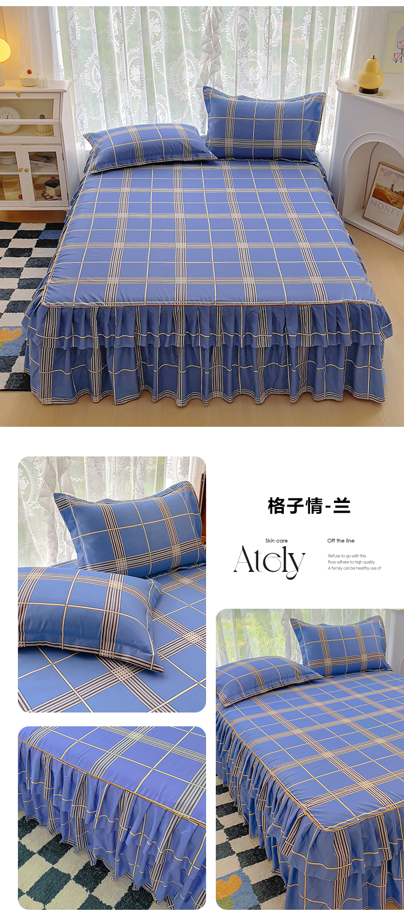 • 91家纺网 家纺一手货源 找家纺 易辰美 2024新款芦荟棉床裙三件套 格子情-兰