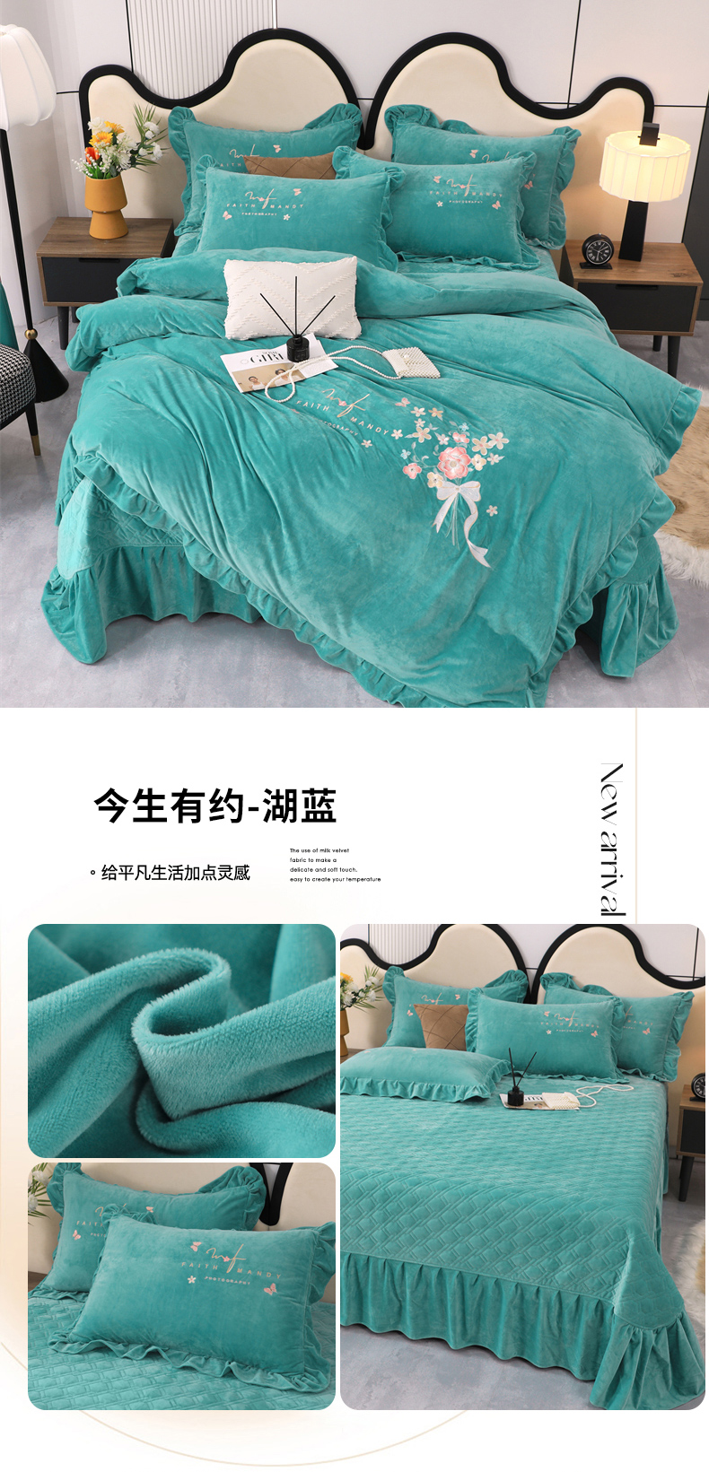 (总)优姿家纺 2025新款牛奶绒花边绣花床盖四件套,花漾时光-果绿,花漾时光-玖红色,花漾时光-米色,花漾时光-桃红色,花漾时光-天空兰,花漾时光-雾霾蓝