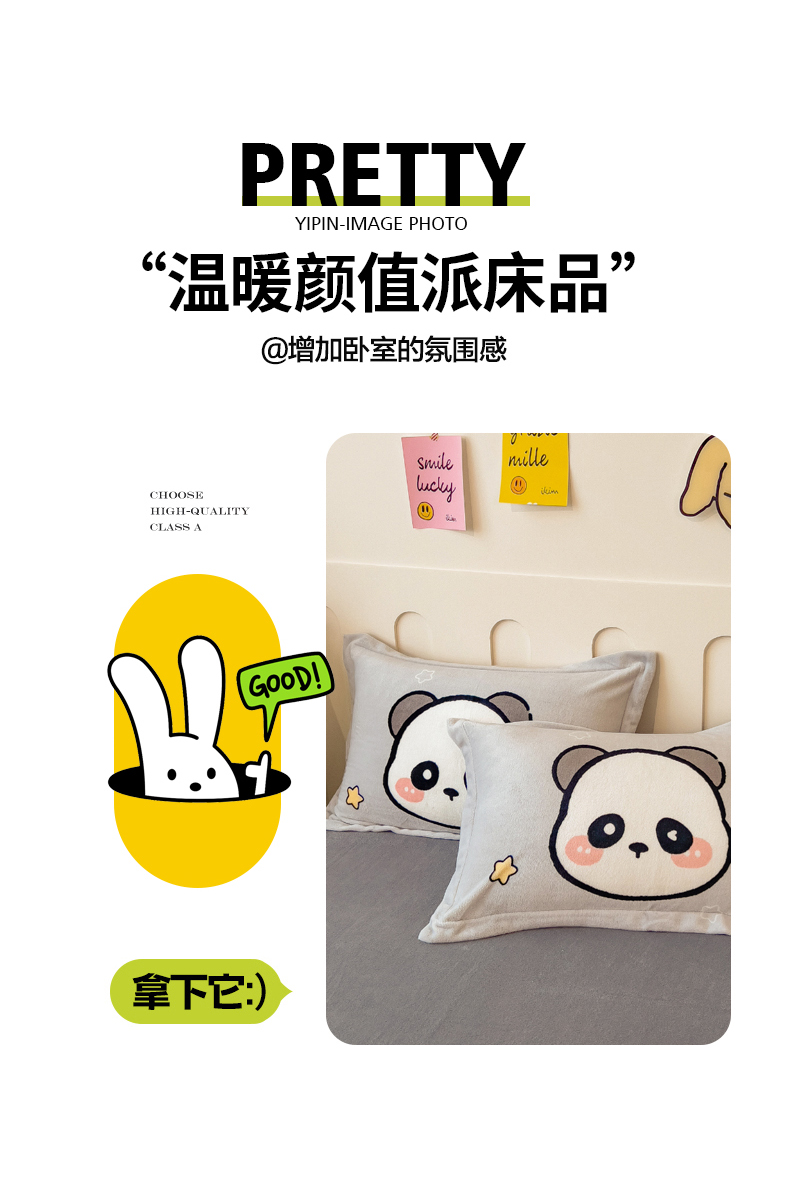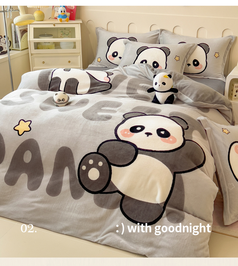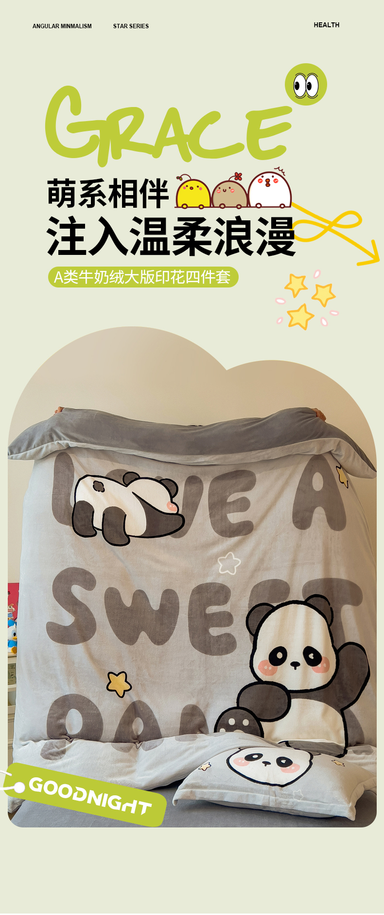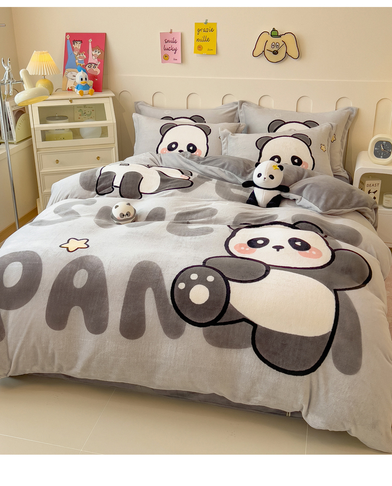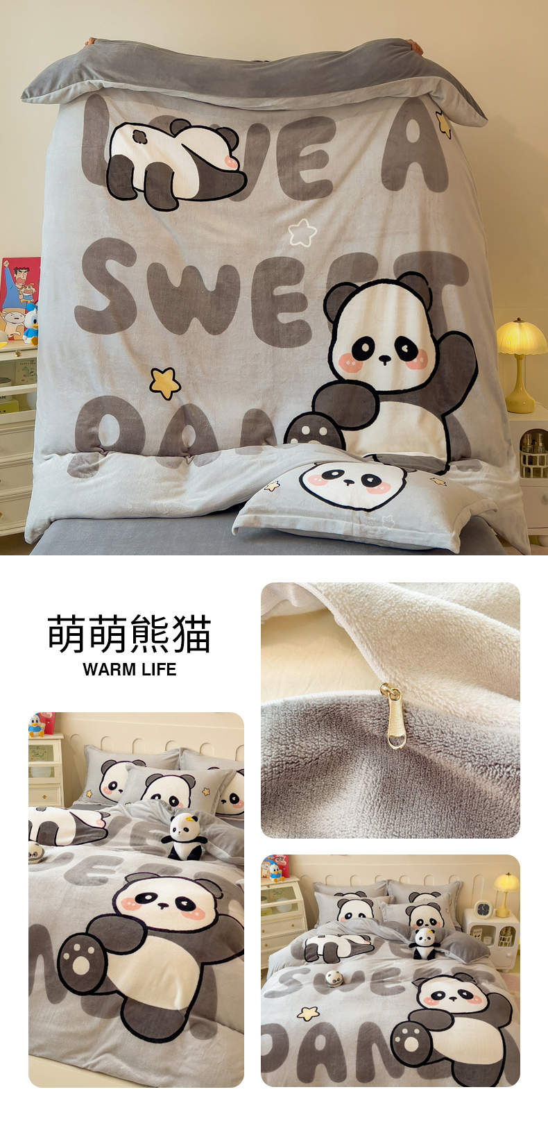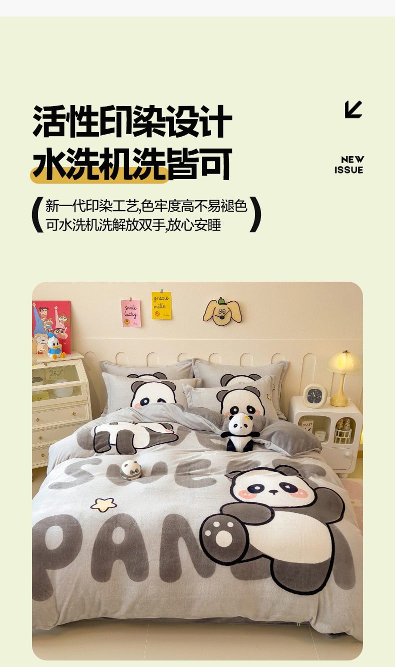 商品名称:丝羽坊 2024新款大版卡通印花牛奶绒四件套 萌萌熊猫