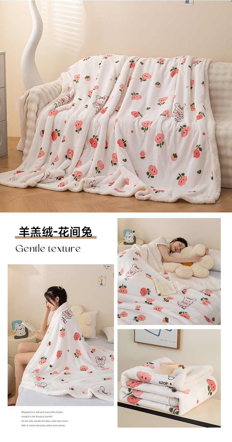 商品名称:雅萱家纺 2024新款羊羔绒+牛奶绒毛毯披肩毯盖毯 羊羔绒-花间兔
