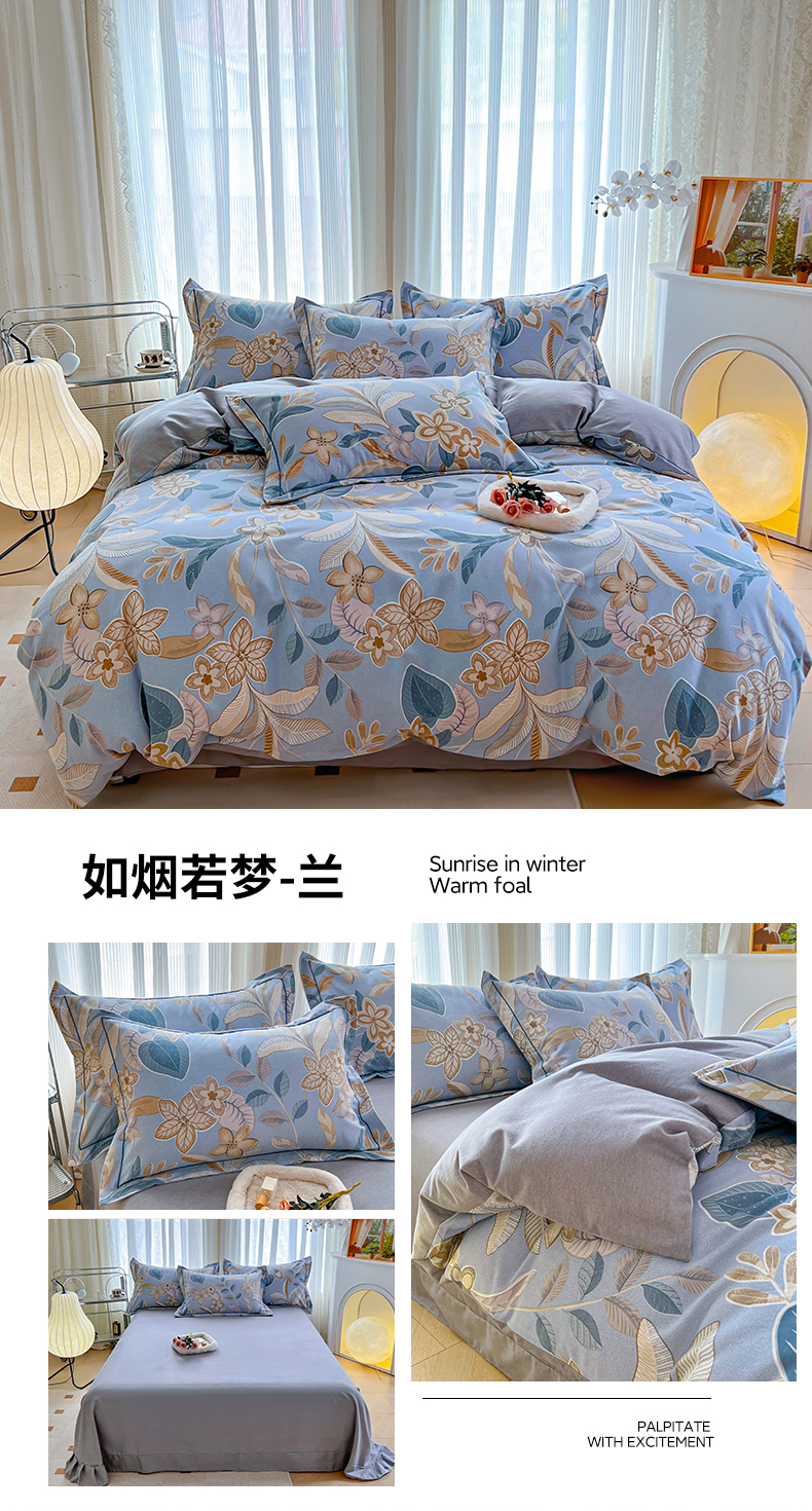 当前位置: 91家纺网 > 商品网购 > 床品套件 > 四件套 > 普通磨毛四件套 > 眷恋家纺 2025秋冬新款全棉纯棉喷气加厚磨毛纯棉四件套 如烟若梦-兰